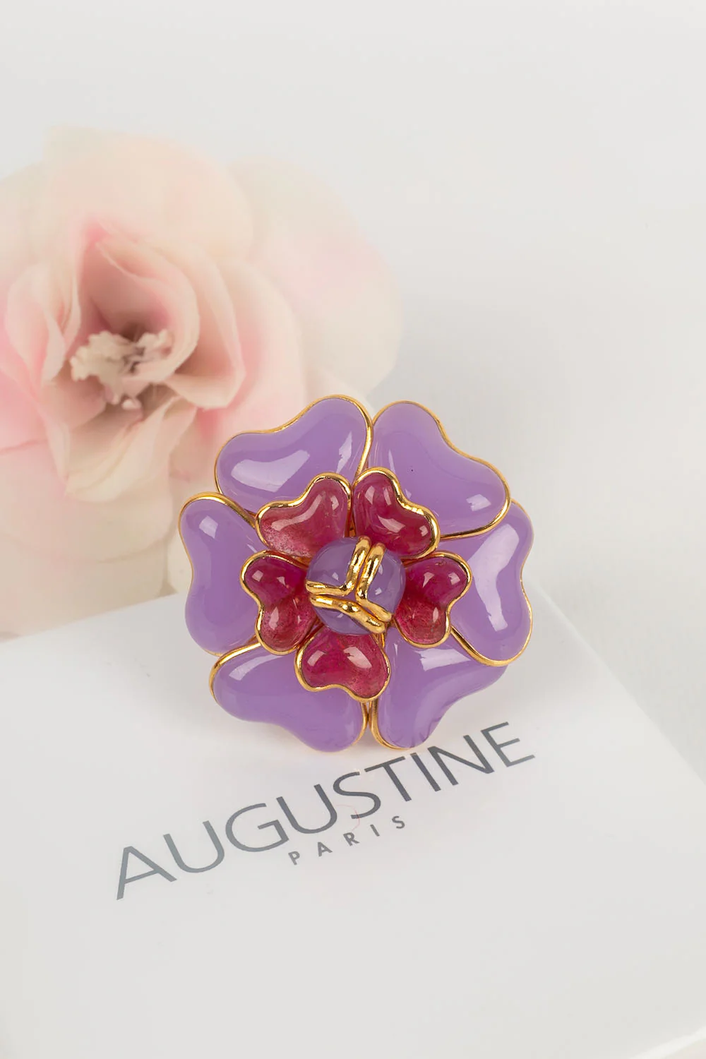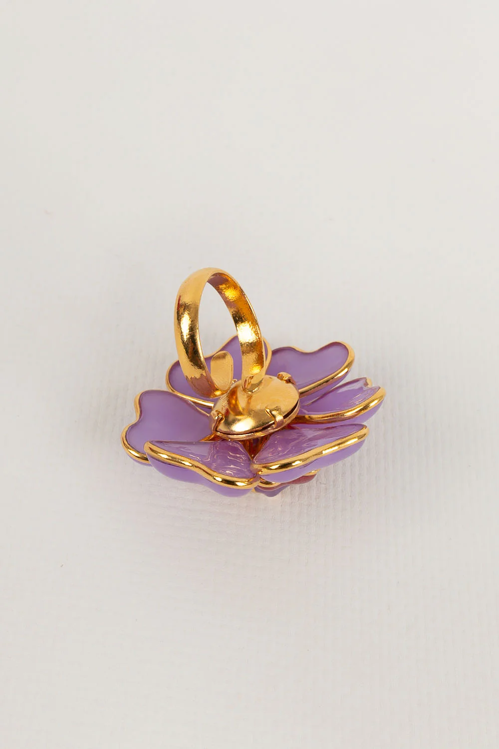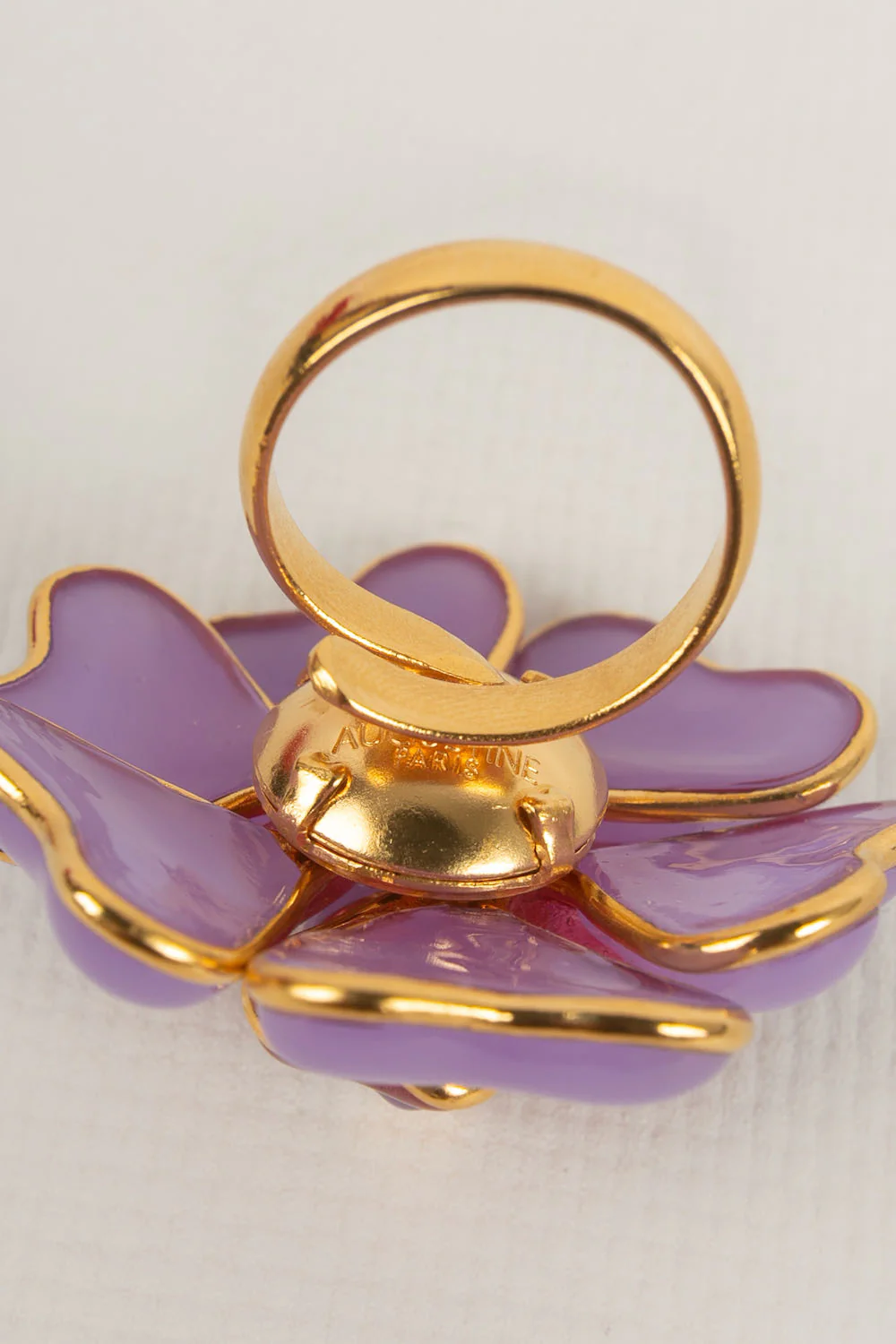 AUGUSTINE -(Made in France) Bague en métal doré et pâte de verre. Taille ajustable. Condition : Très bon état Dimensions : Diamètre du camélia : 5 cm