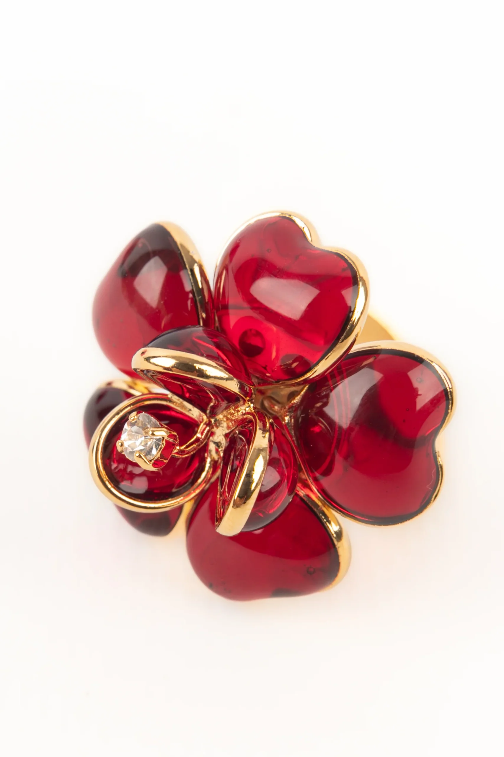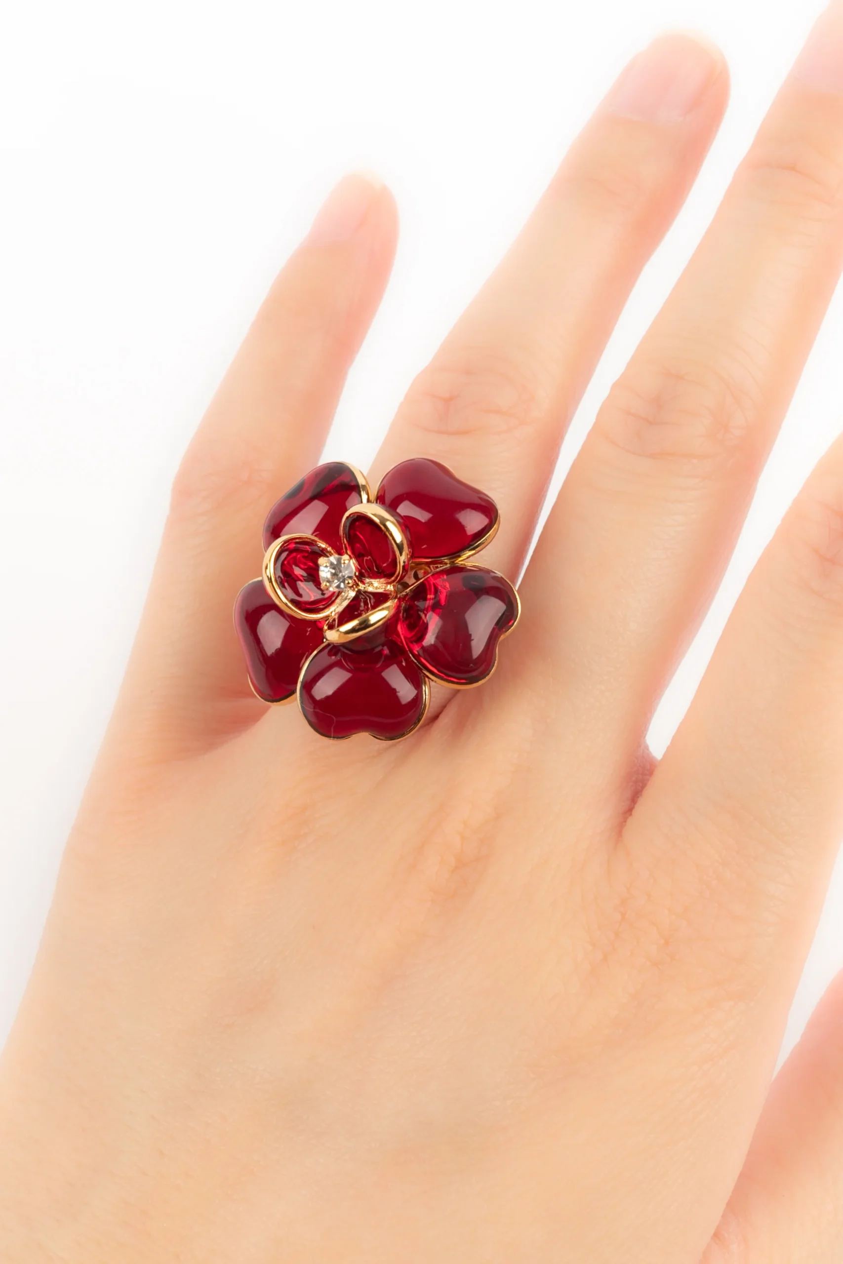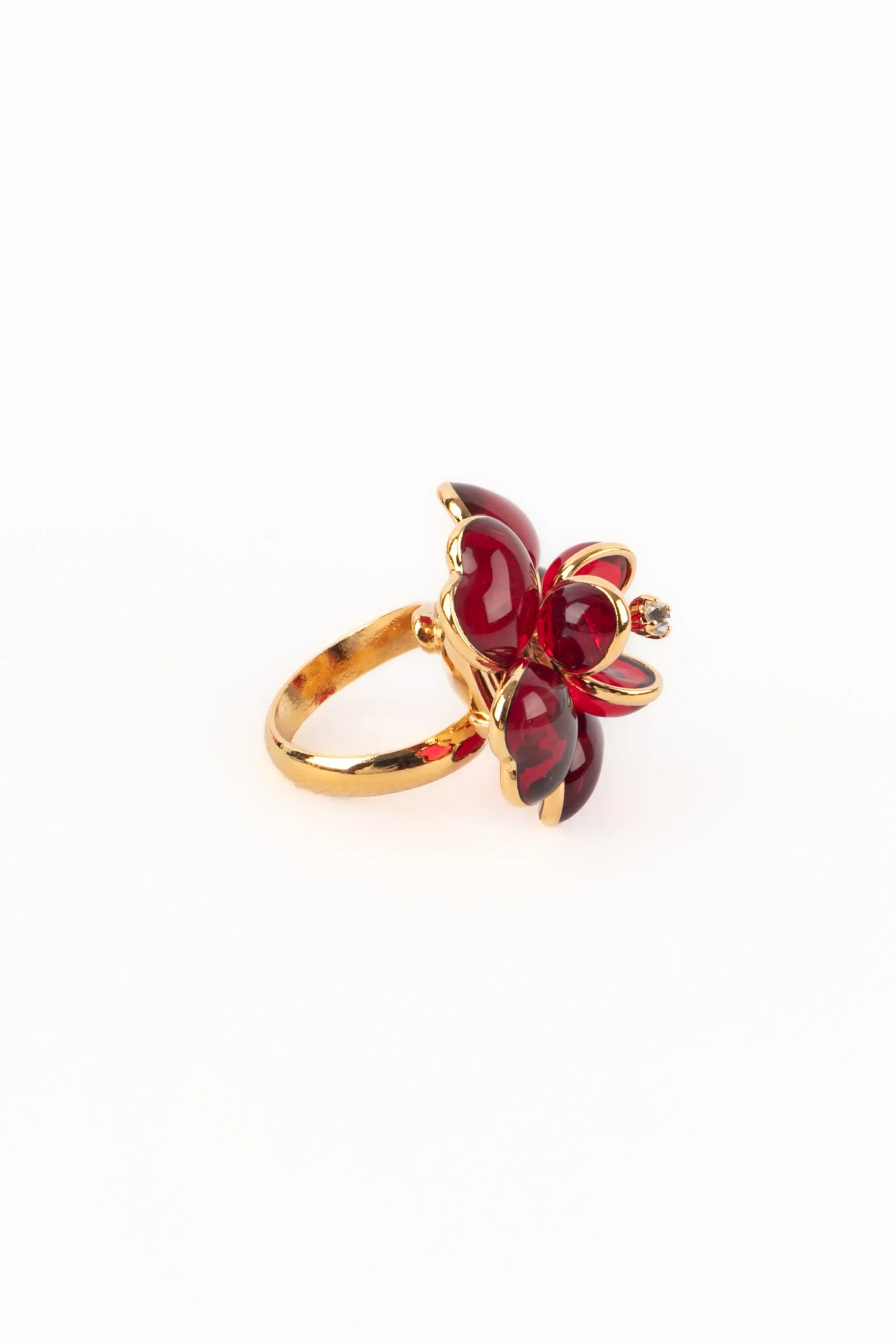 AUGUSTINE -(Made in France) Bague en métal doré et pâte de verre rouge. Taille ajustable.