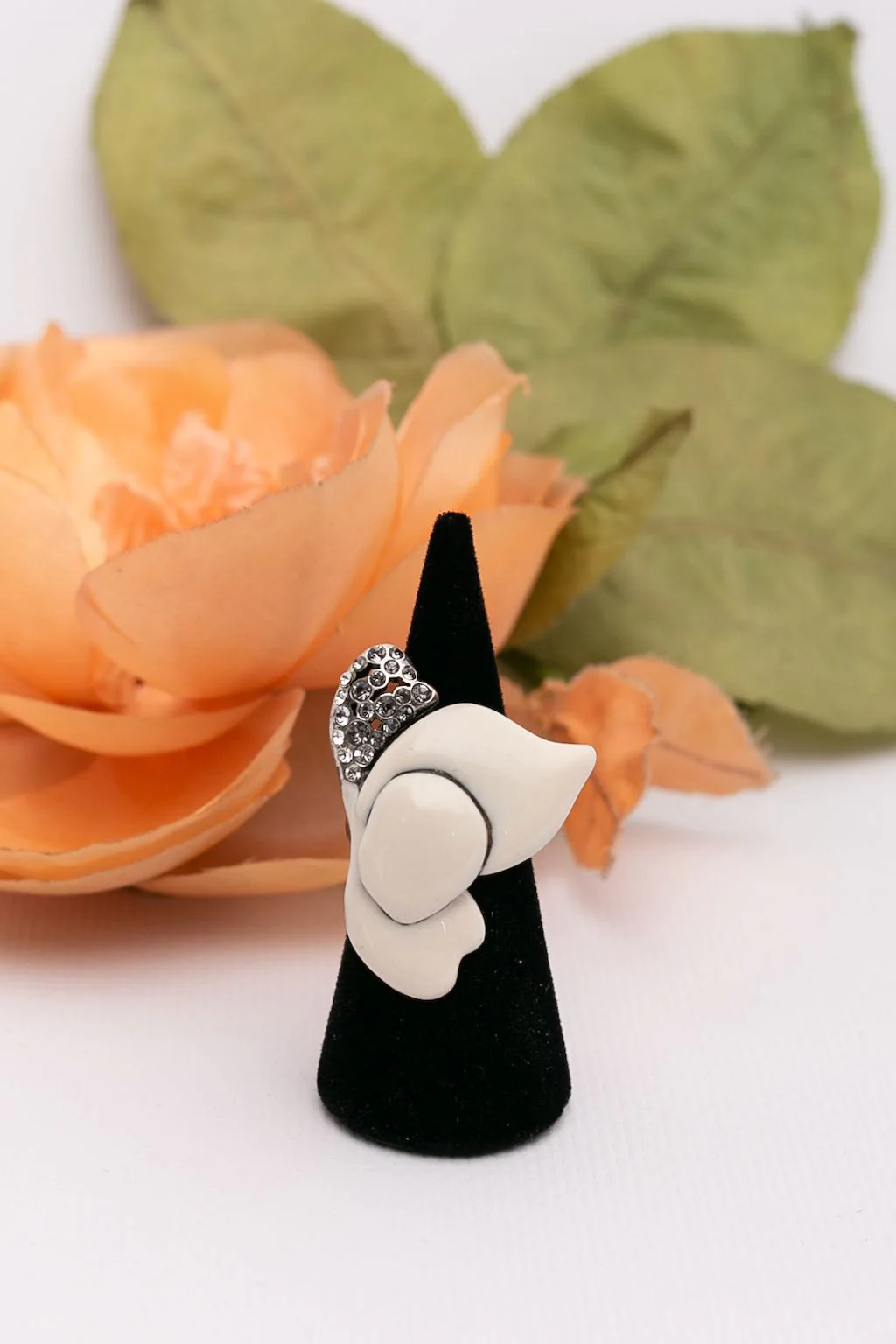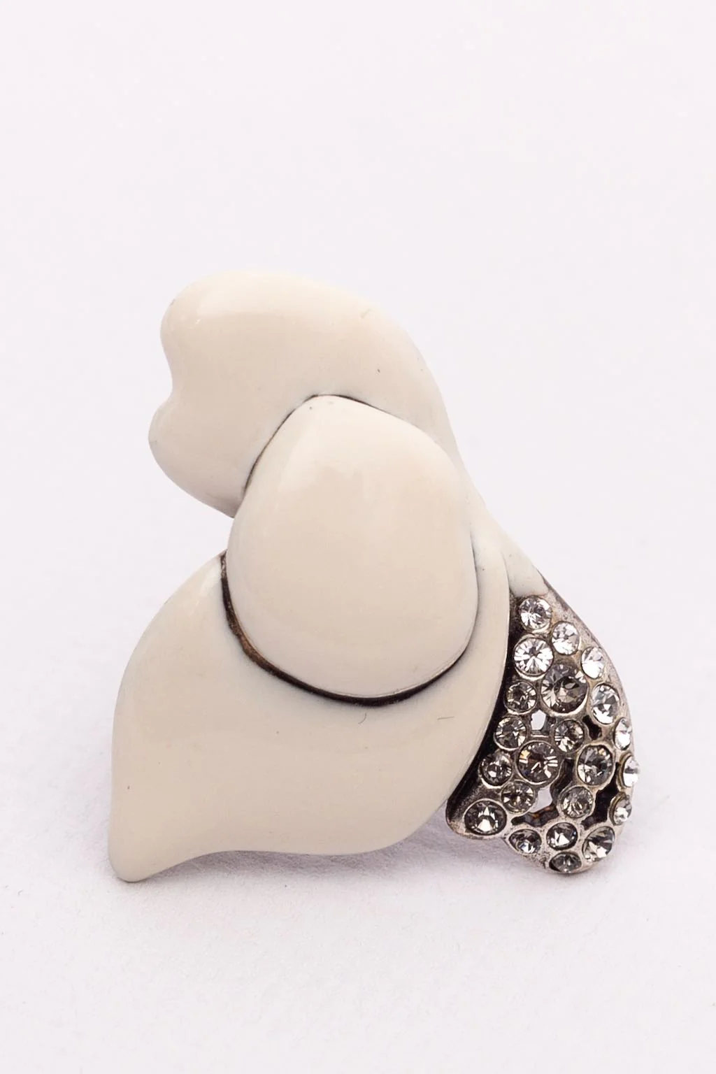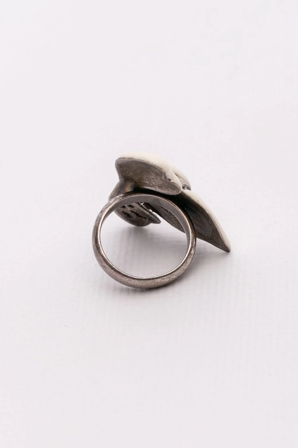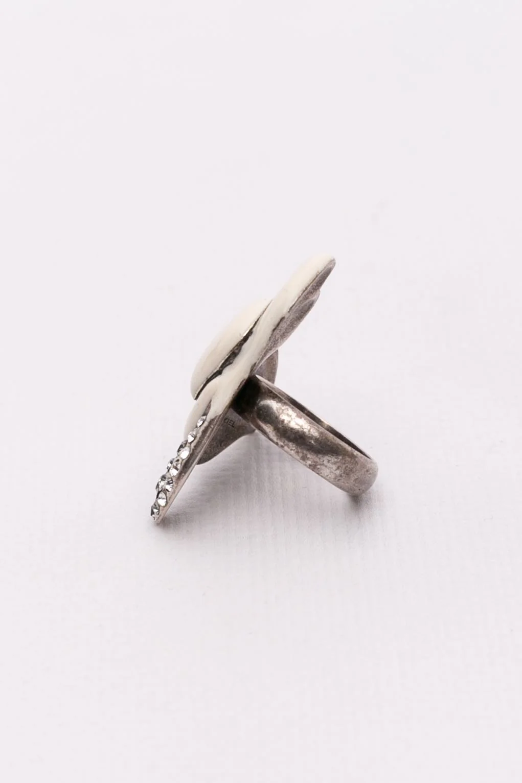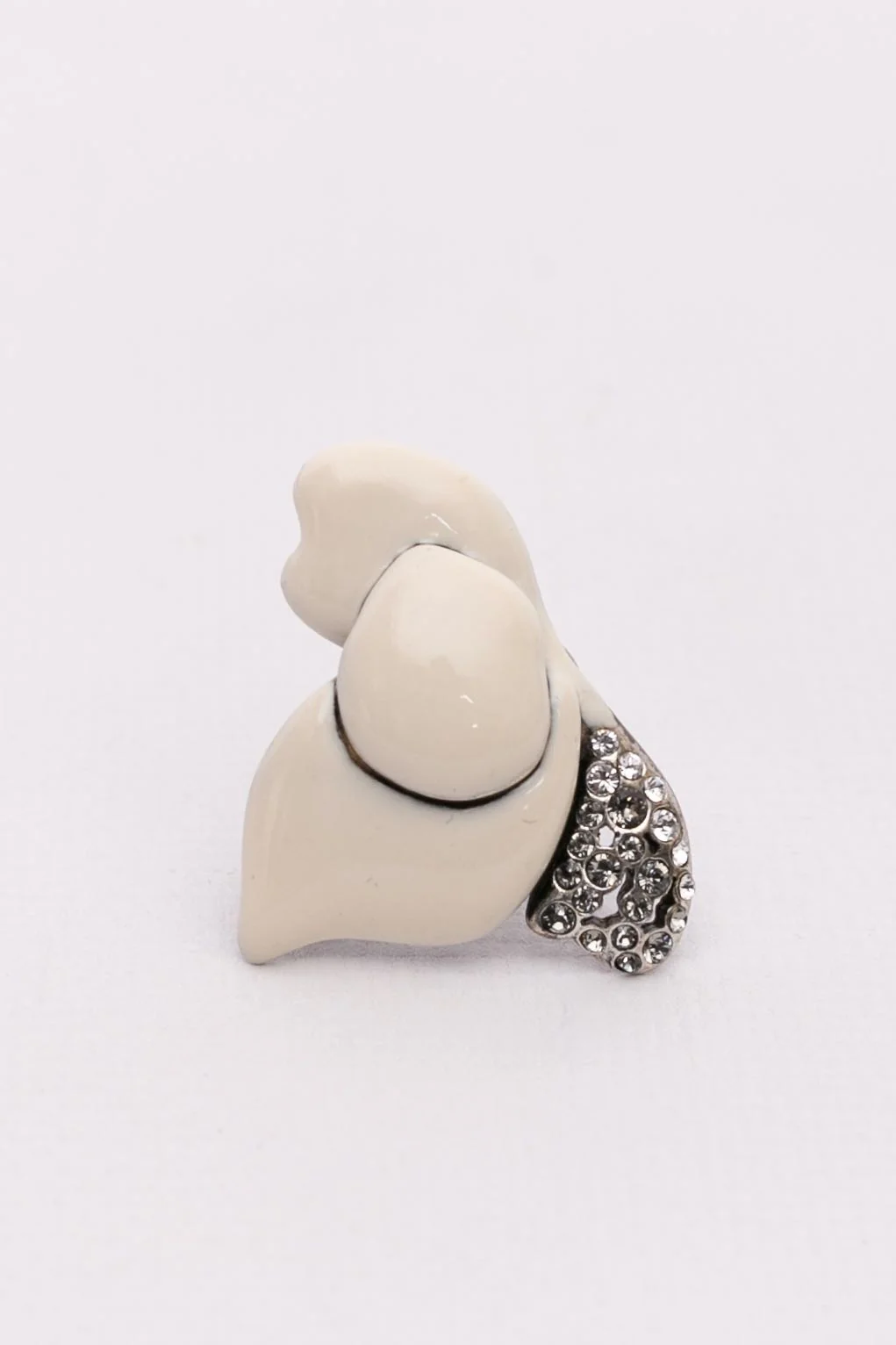 SONIA RYKIEL -(Made in France) Bague en métal argenté émaillé et pavée de strass. Condition : Très bon état Dimensions : Diamètre de l’anneau : 1,8 cm – Dimensions de l’ornement : 3,8 cmx 2,8 cm