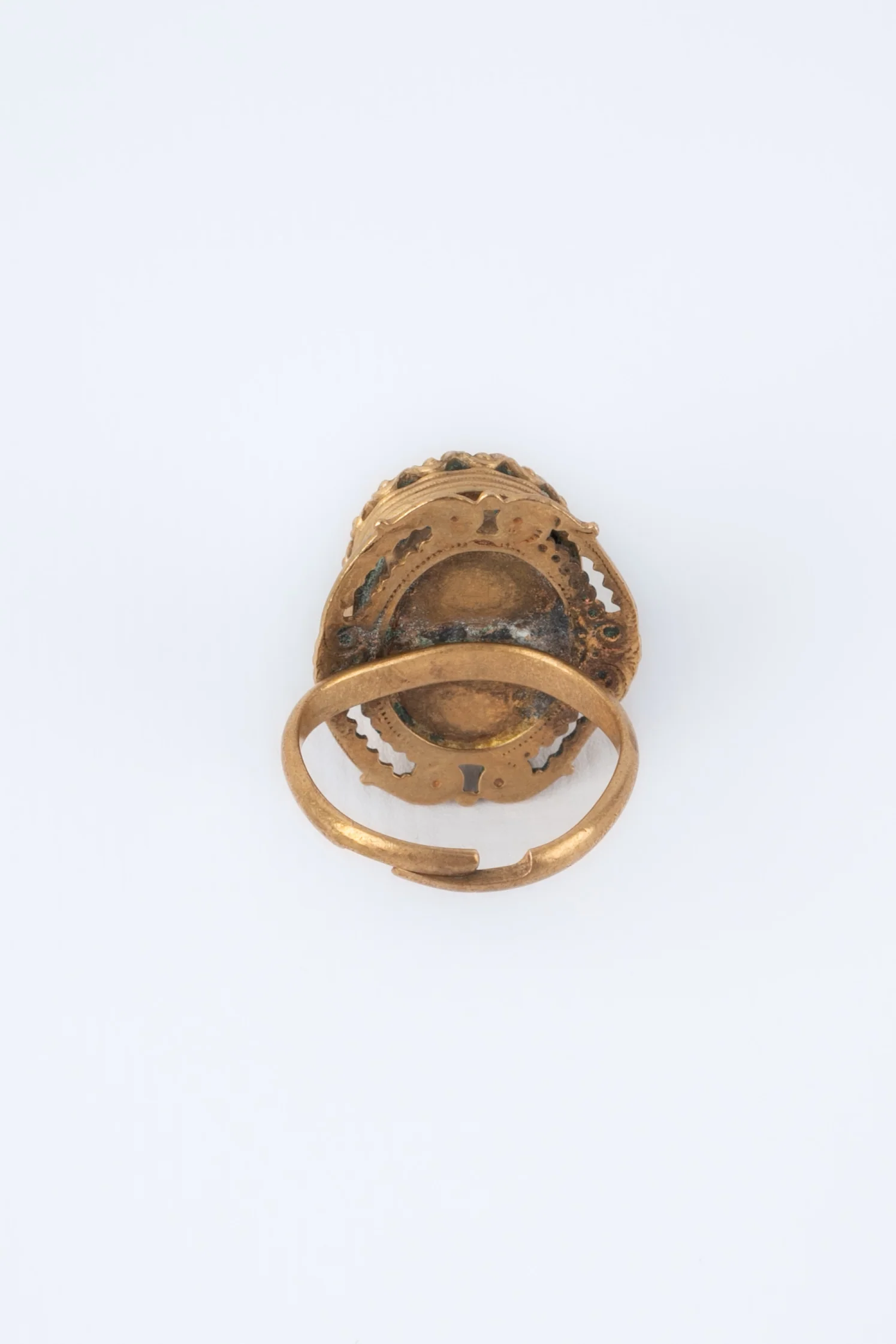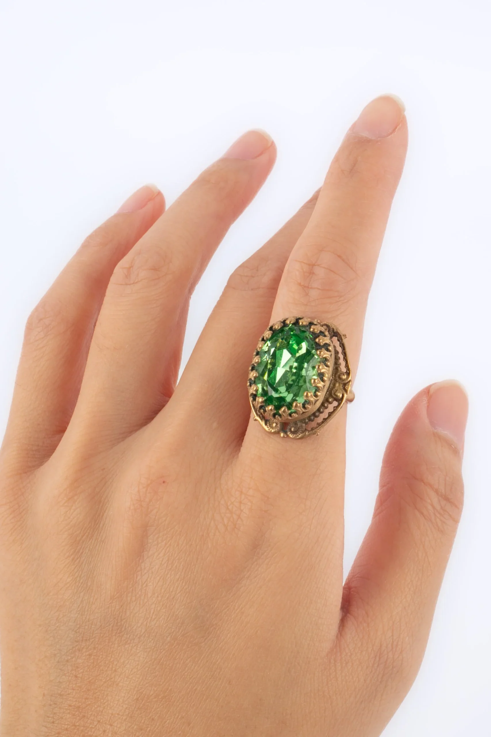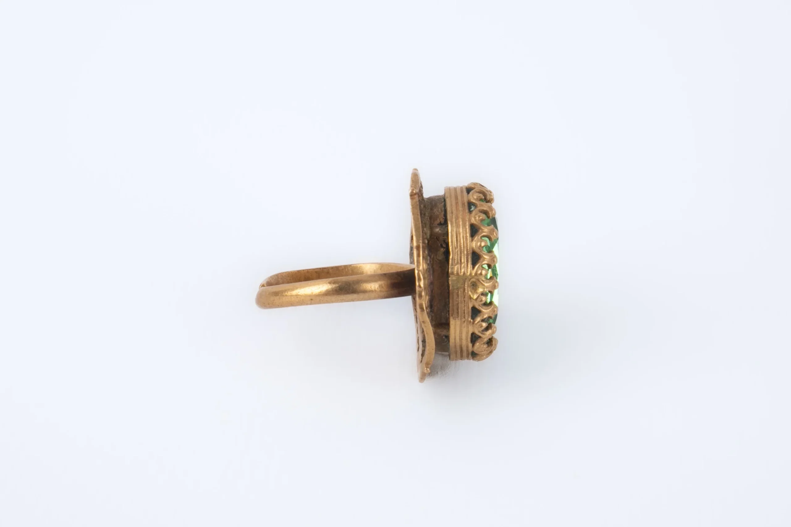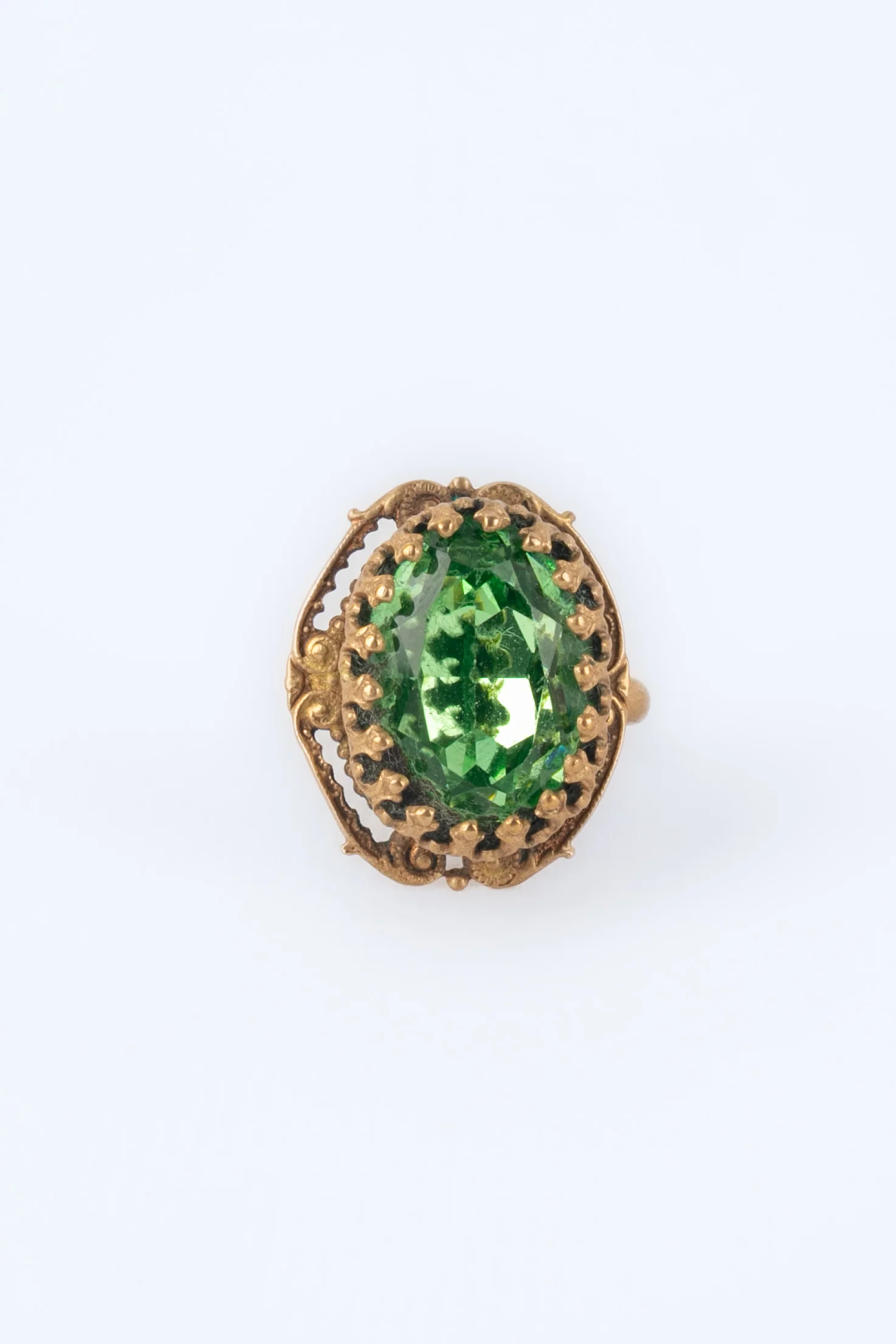 ANONYME – Bague en métal doré surmontée d’un strass vert.