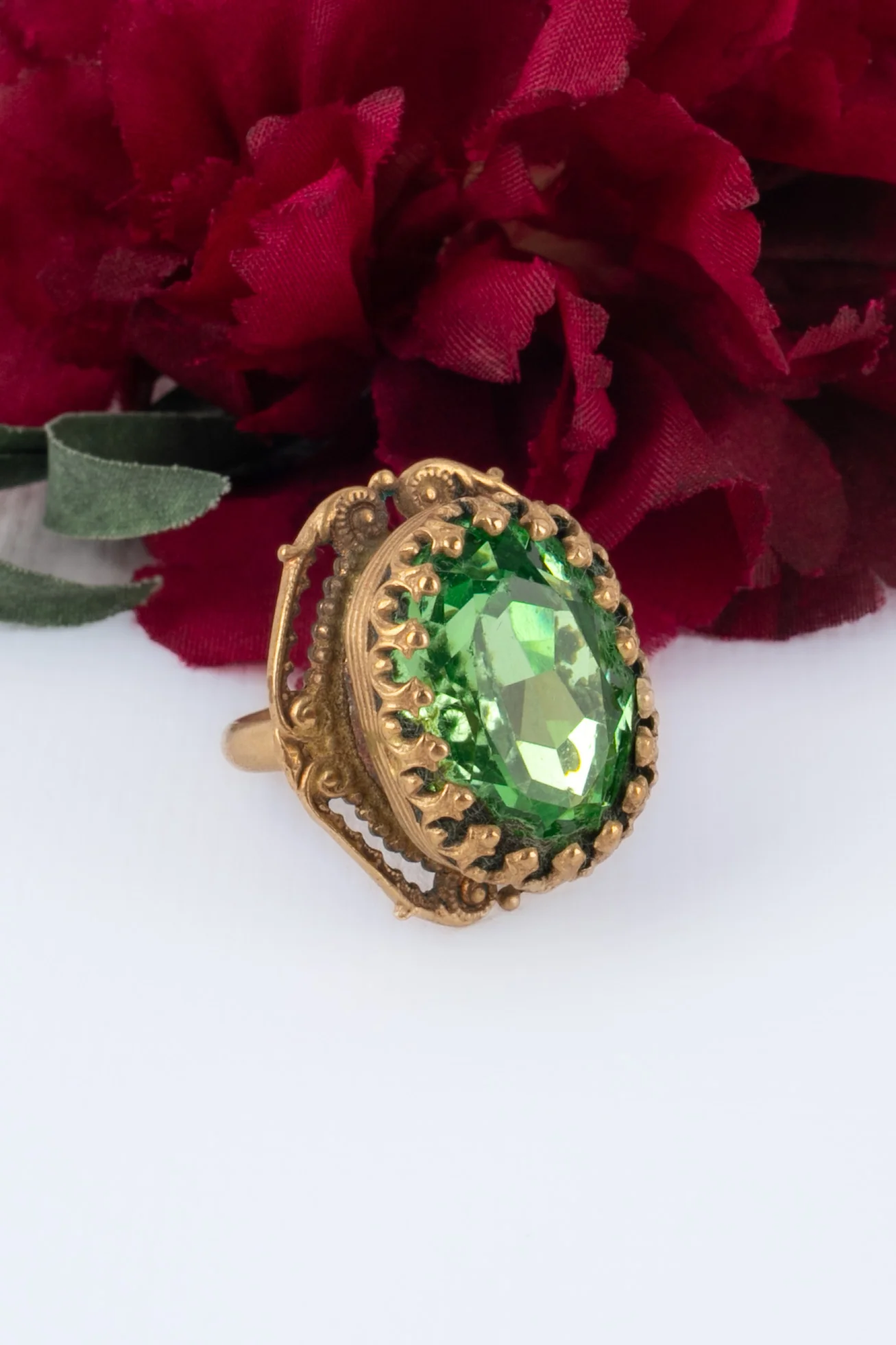 ANONYME – Bague en métal doré surmontée d’un strass vert. Condition : Bon état Dimensions : Taille 53