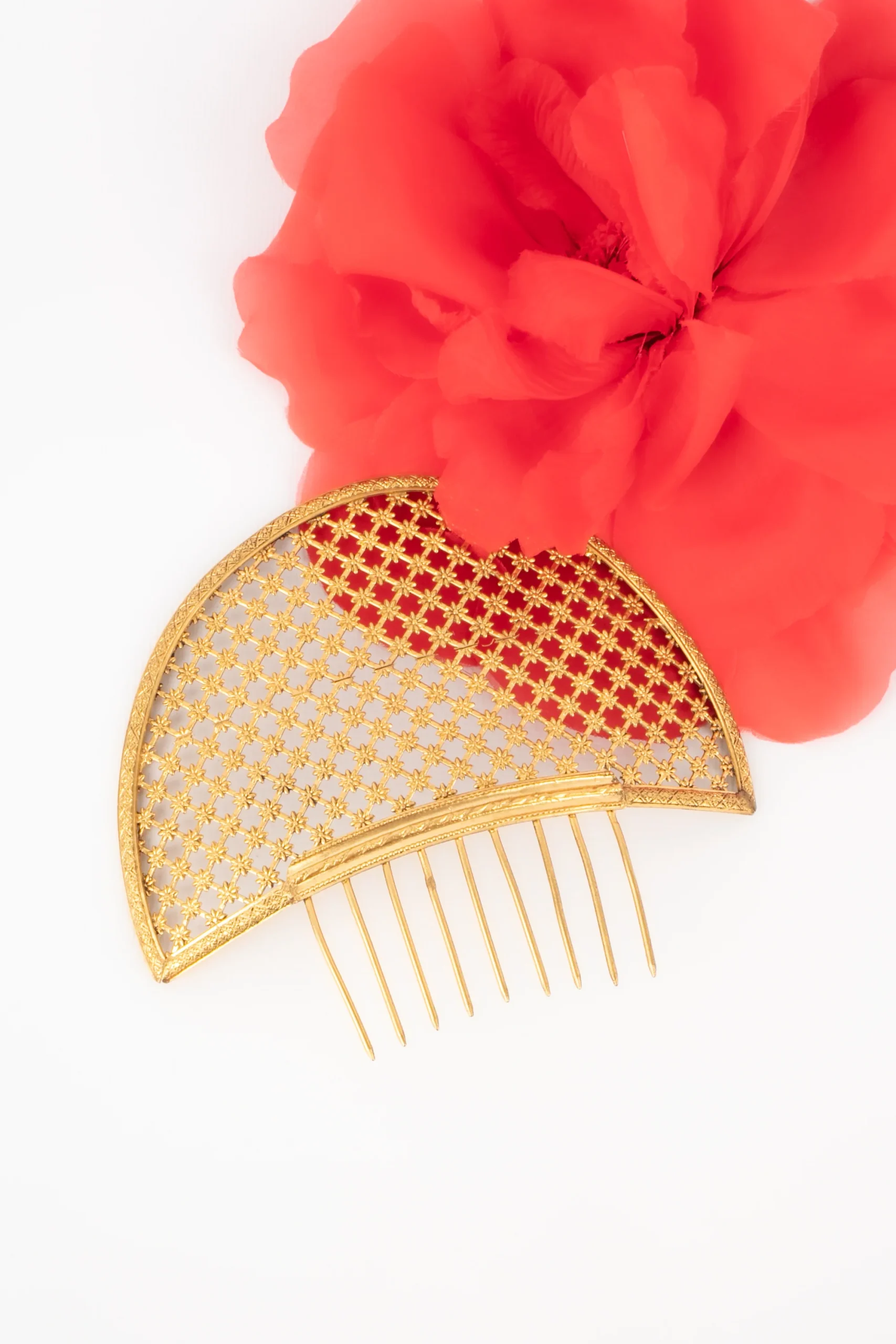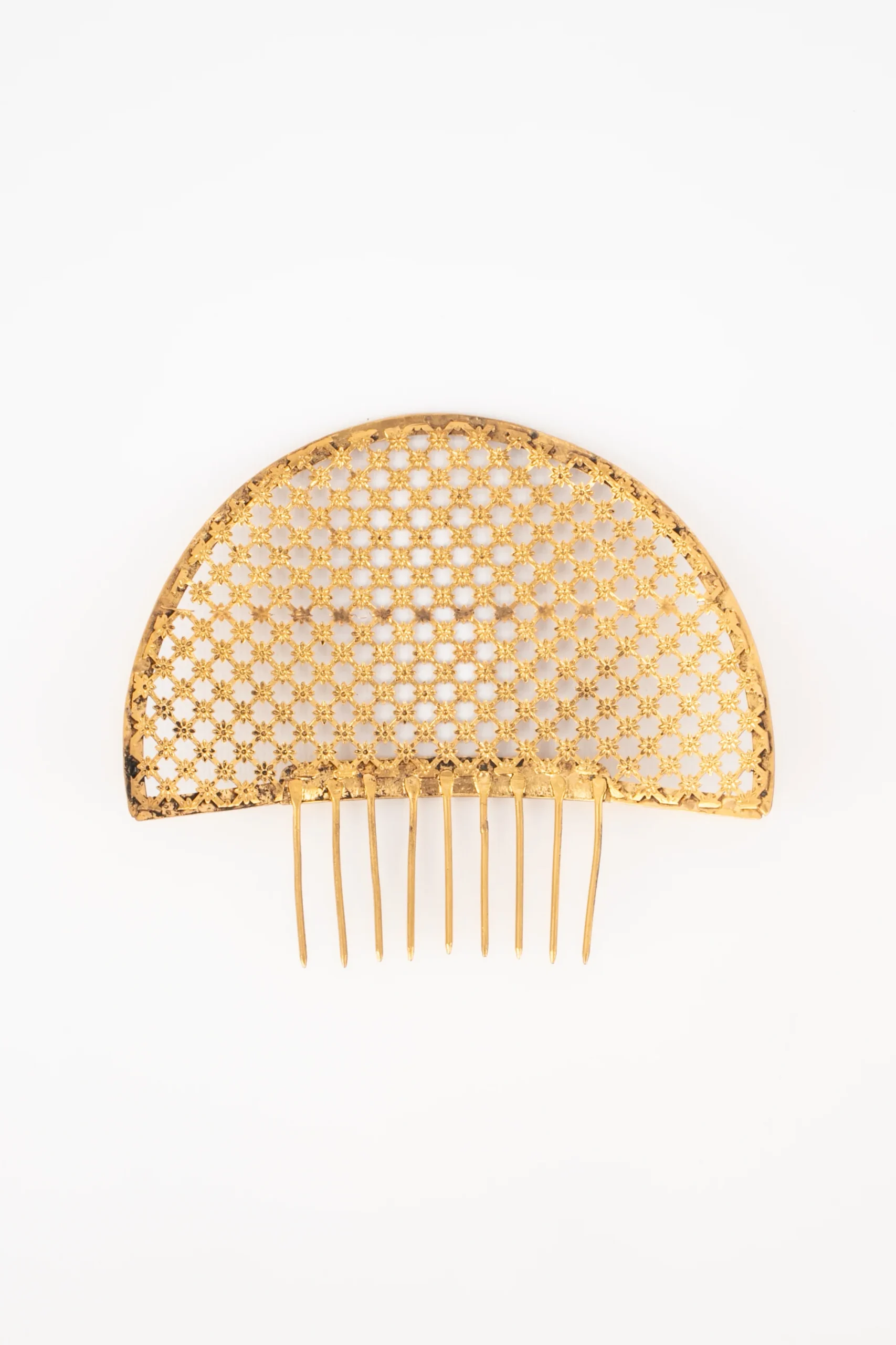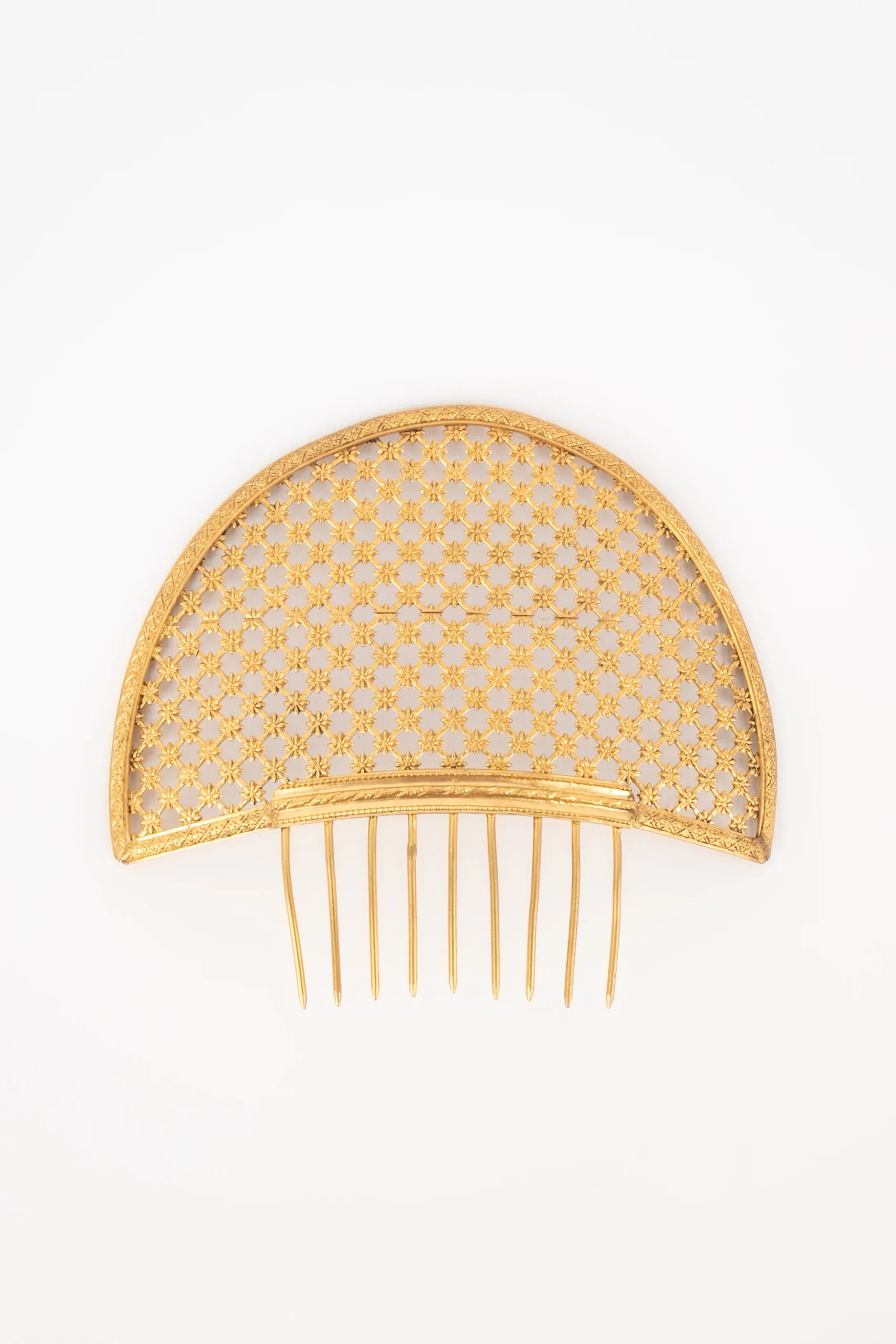THÉÂTRE -Bijou de cheveux façon peigne. Création de théâtre en métal doré ajouré.