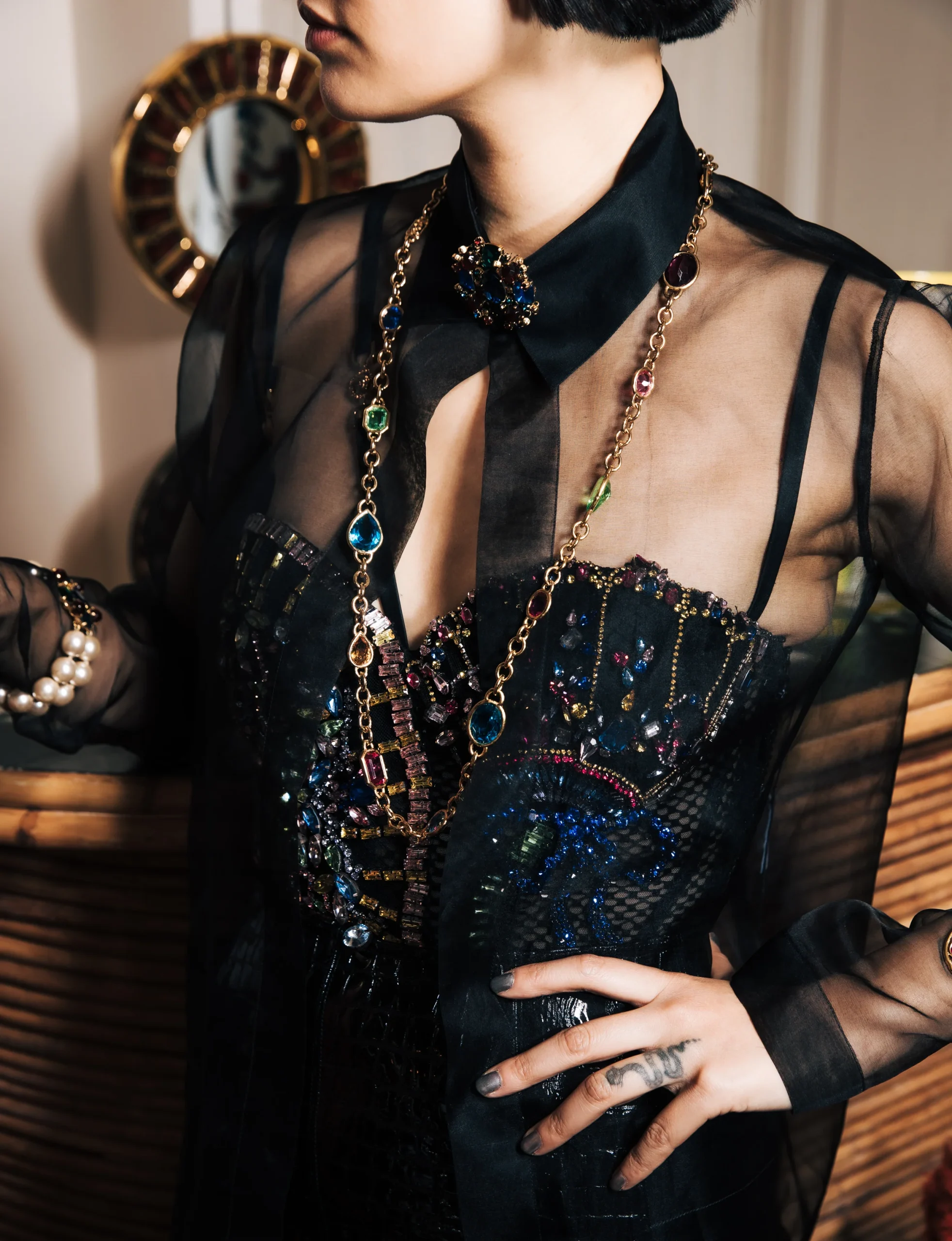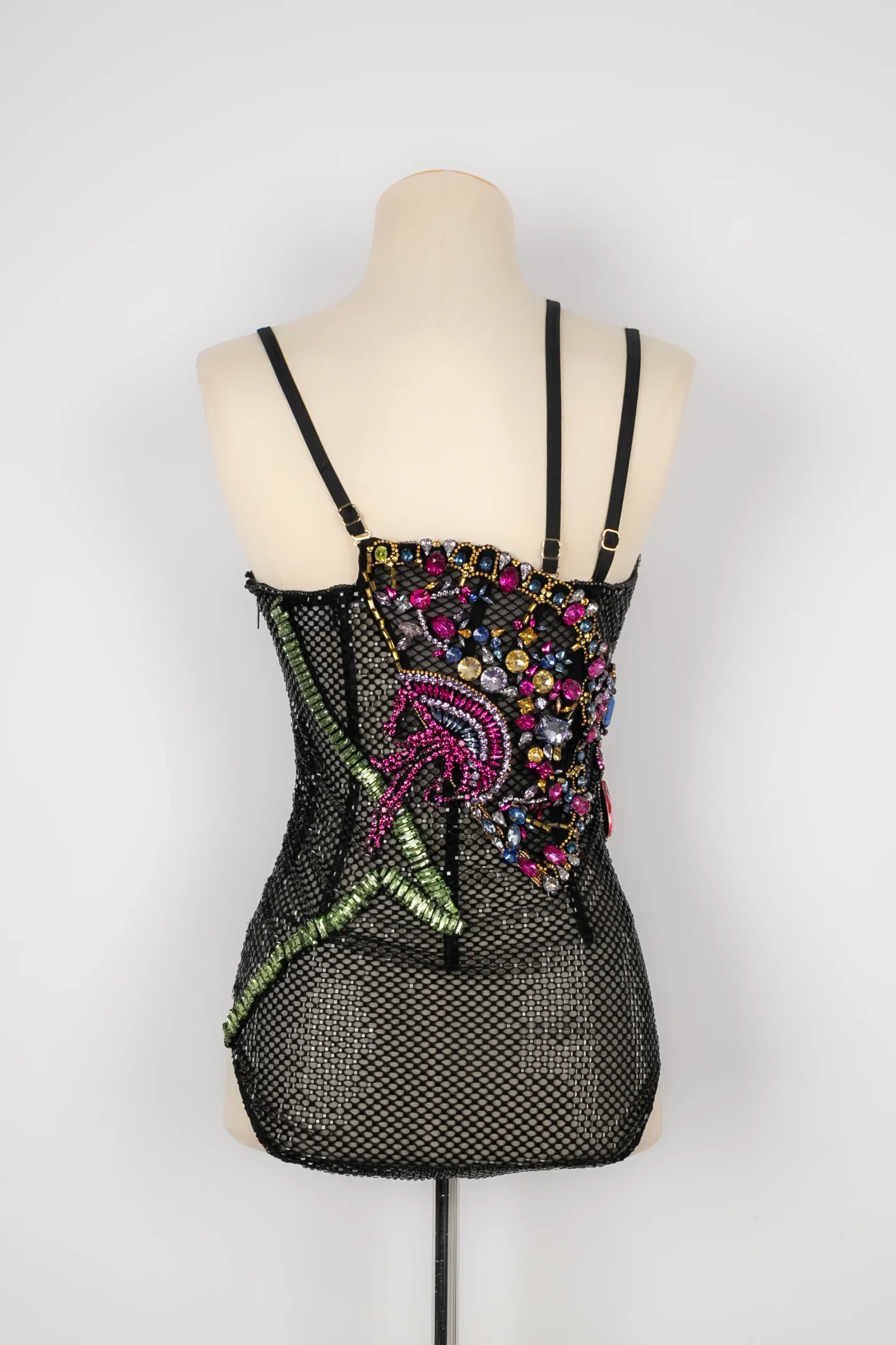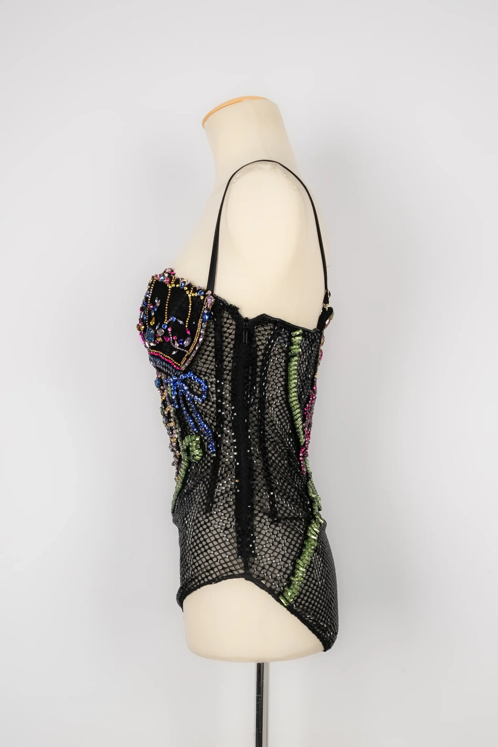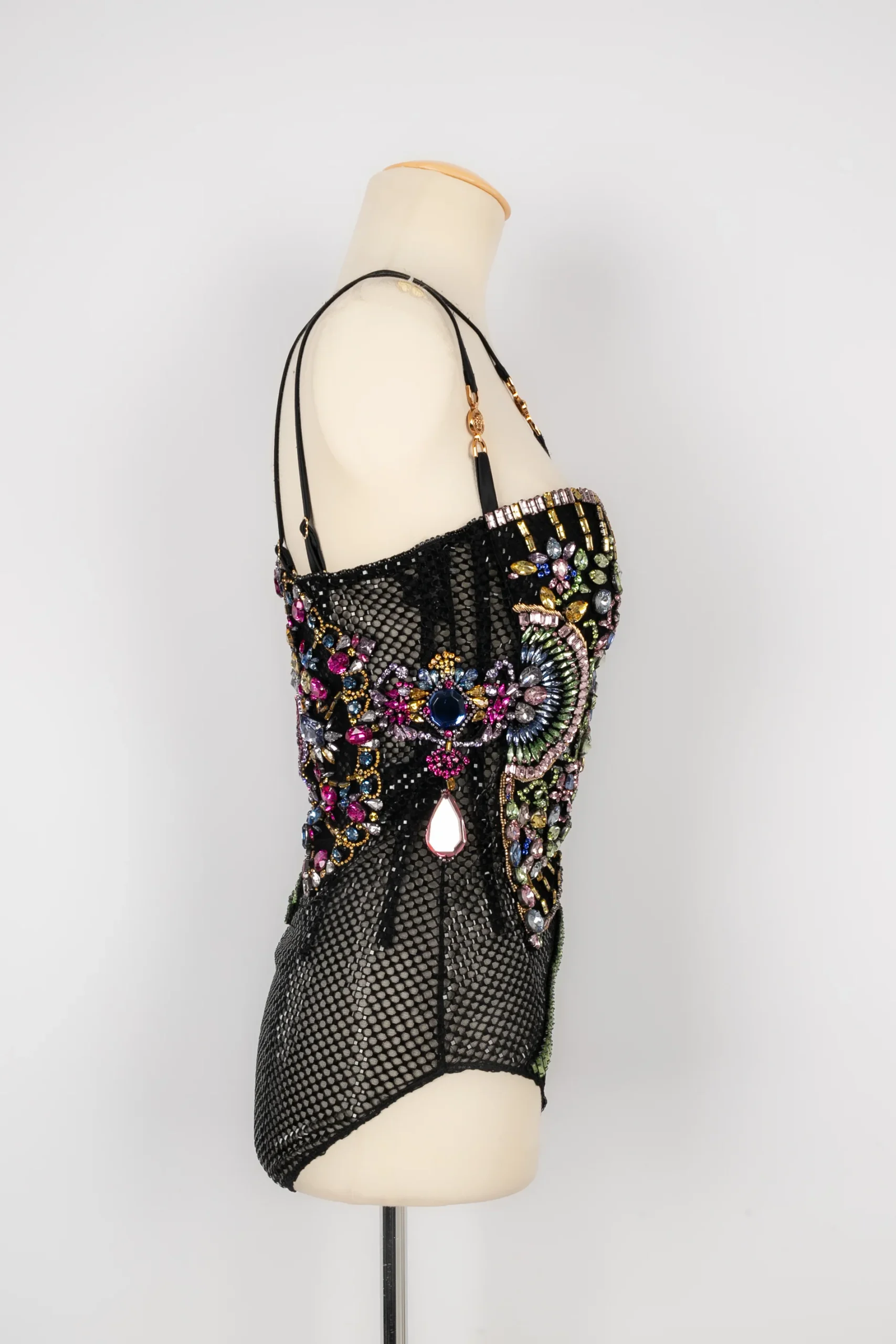 VERSACE -(Made in Italy) Haut body noir entièrement brodé de strass multicolores. Taille indiquée 38FR. Collection Pre-fall 2022. A signaler, manques quelques strass noirs. Condition : Bon état Dimensions : Longueur poitrine : 38 cm – Taille : 30 cm – Longueur : 55 cm