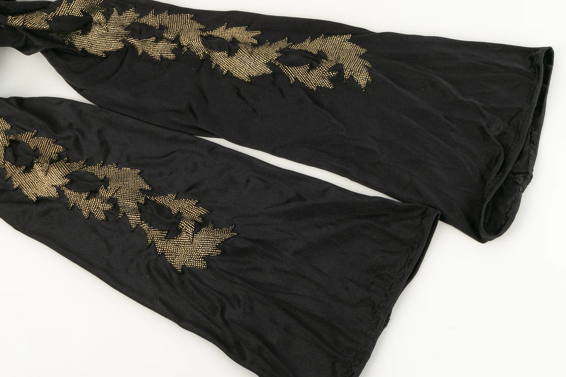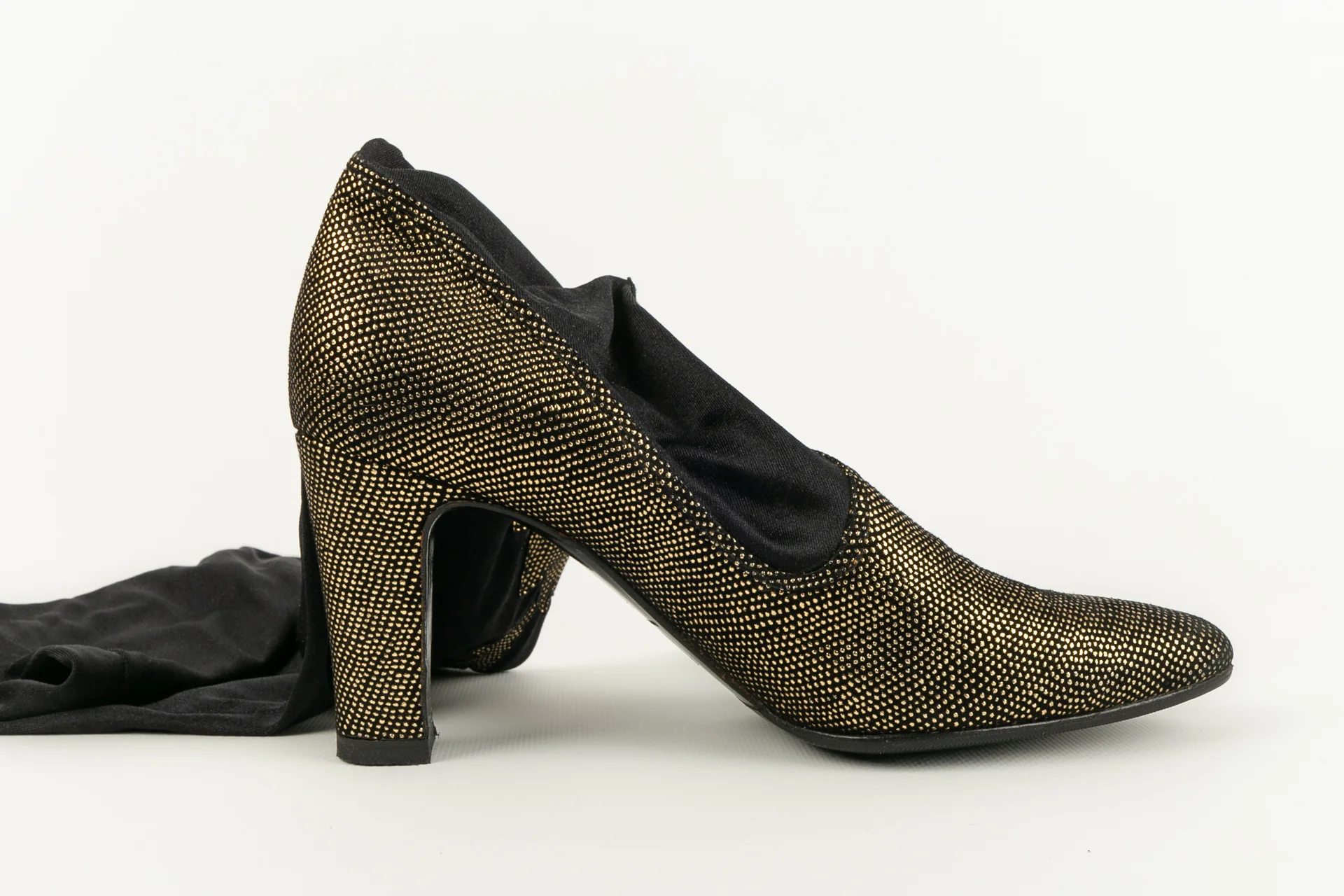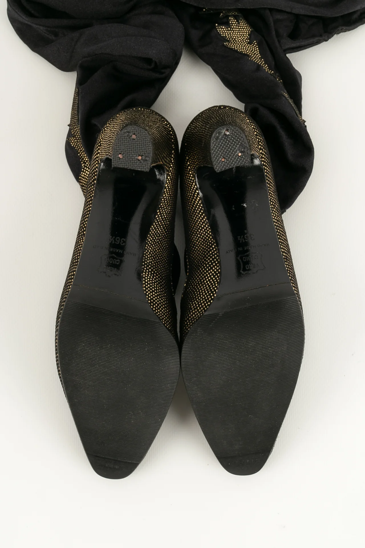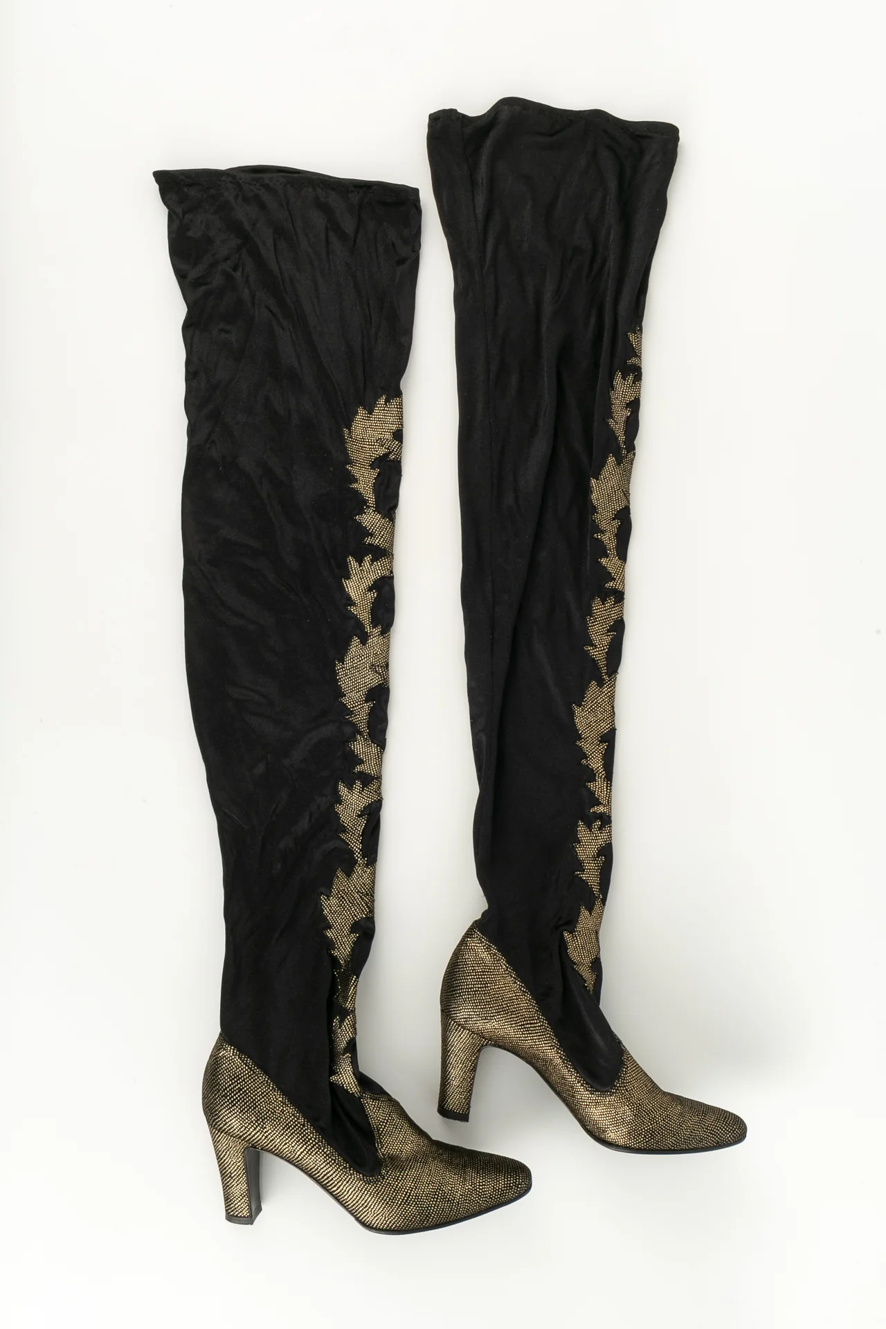 ANONYME -(Made in Italy) Cuissardes style bas dans les tons de noir et de doré. Pointure 36 1/2. Modèle datant des années 1980.