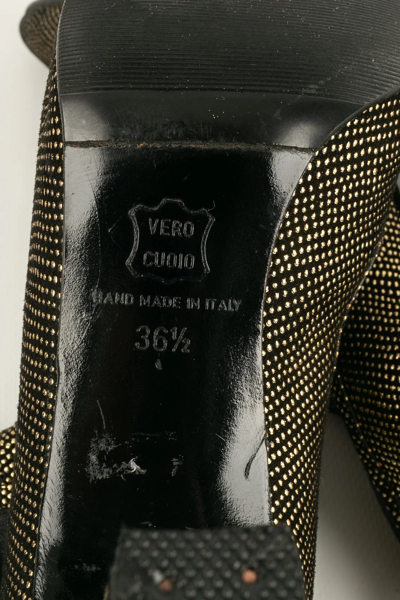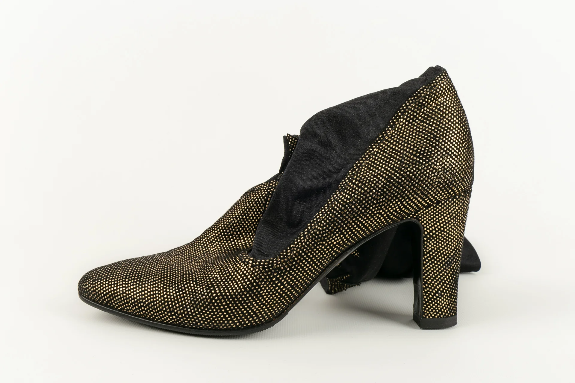 ANONYME -(Made in Italy) Cuissardes style bas dans les tons de noir et de doré. Pointure 36 1/2. Modèle datant des années 1980. Condition : Très bon état Dimensions : Hauteur de talon : 8 cm