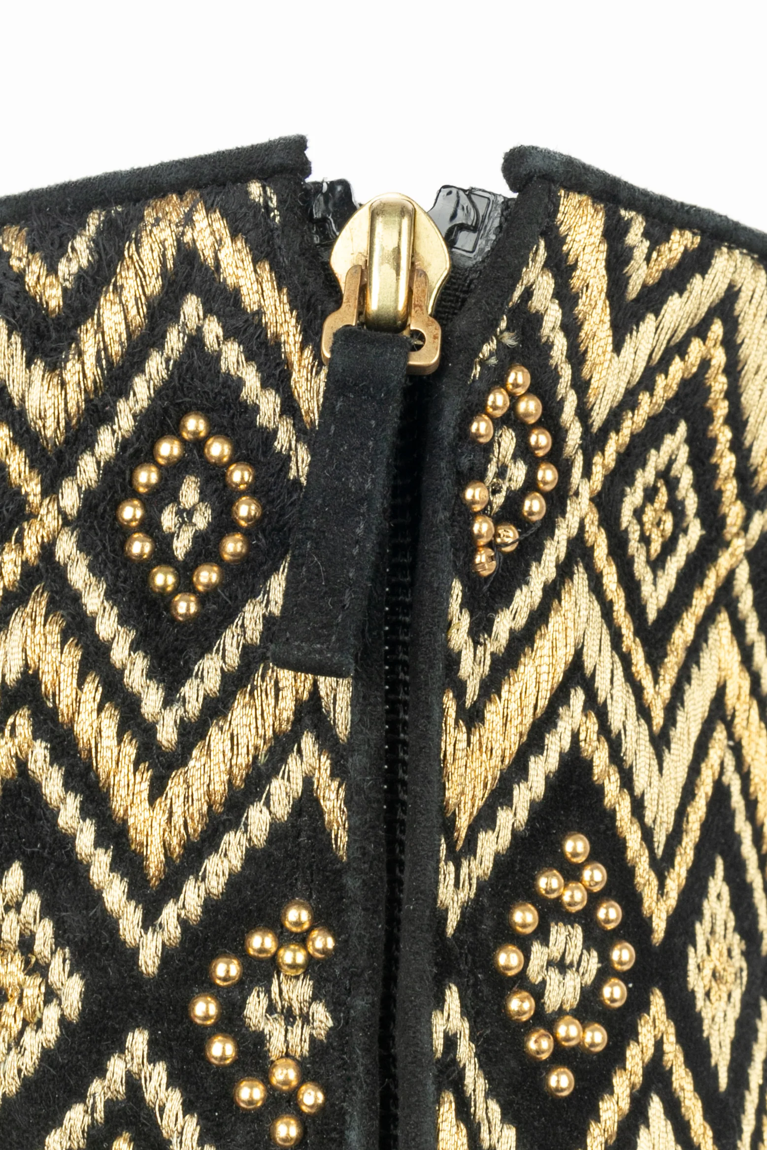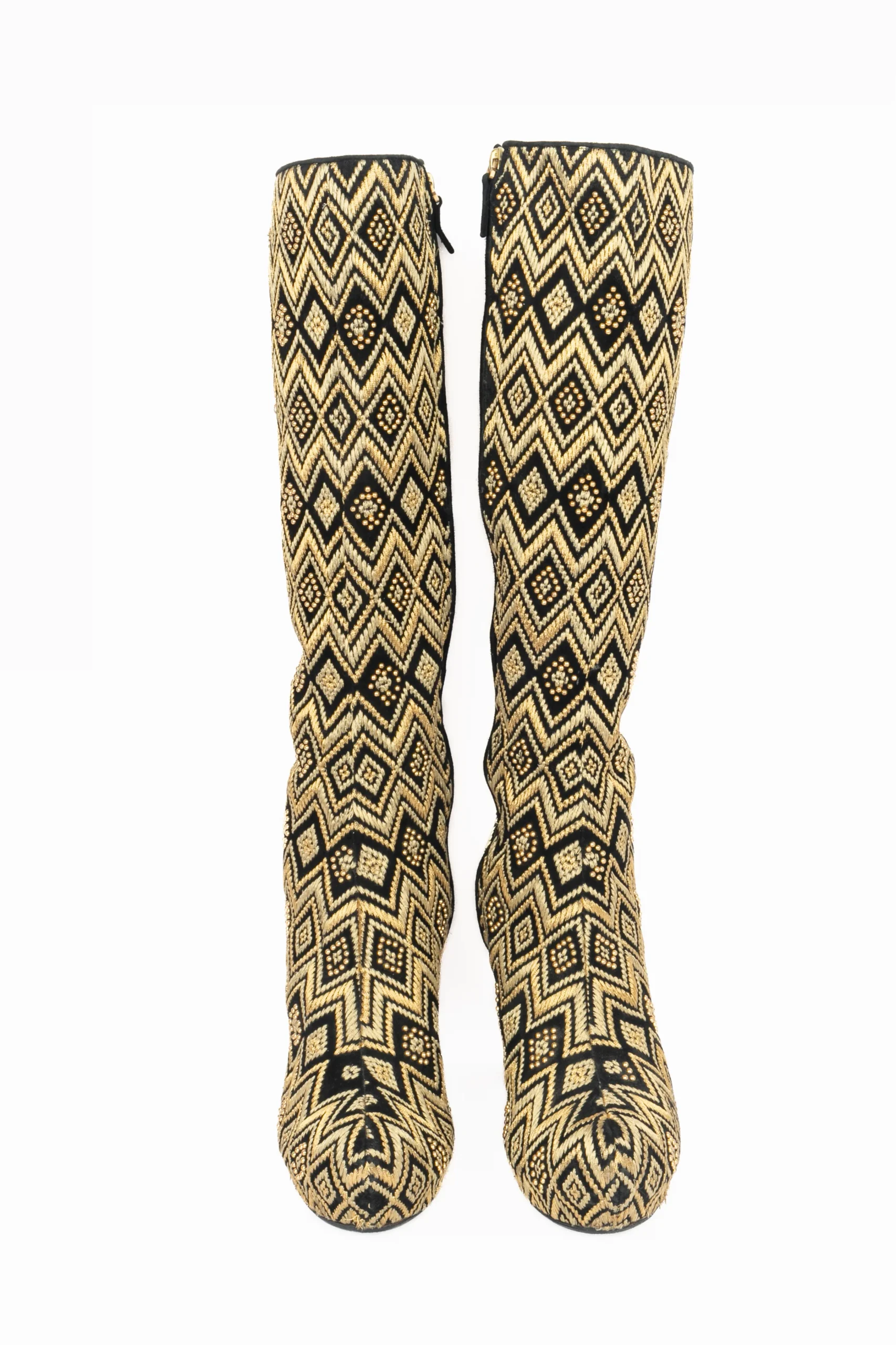 YVES SAINT LAURENT -(Made in Italy) Bottes noires à motifs géométriques en fils de lurex doré agrémentées de petits strass. Intérieur cuir. Taille indiquée 40. Collection fin 1970 – début 1980 sous la direction artistique de Yves Saint Laurent.