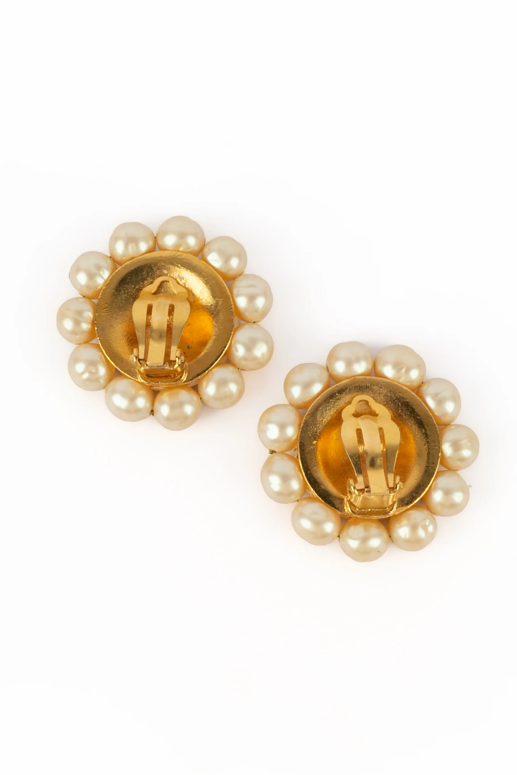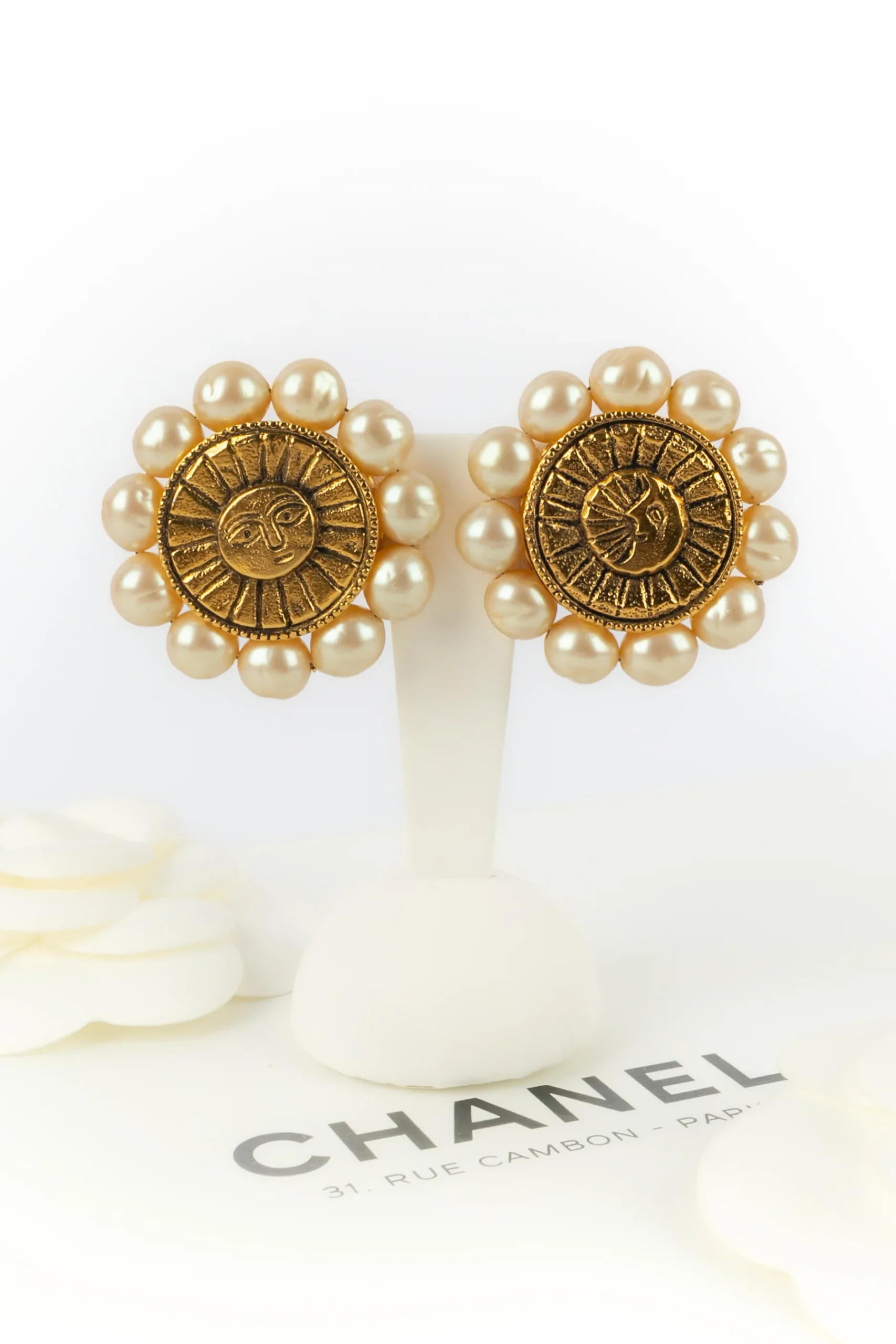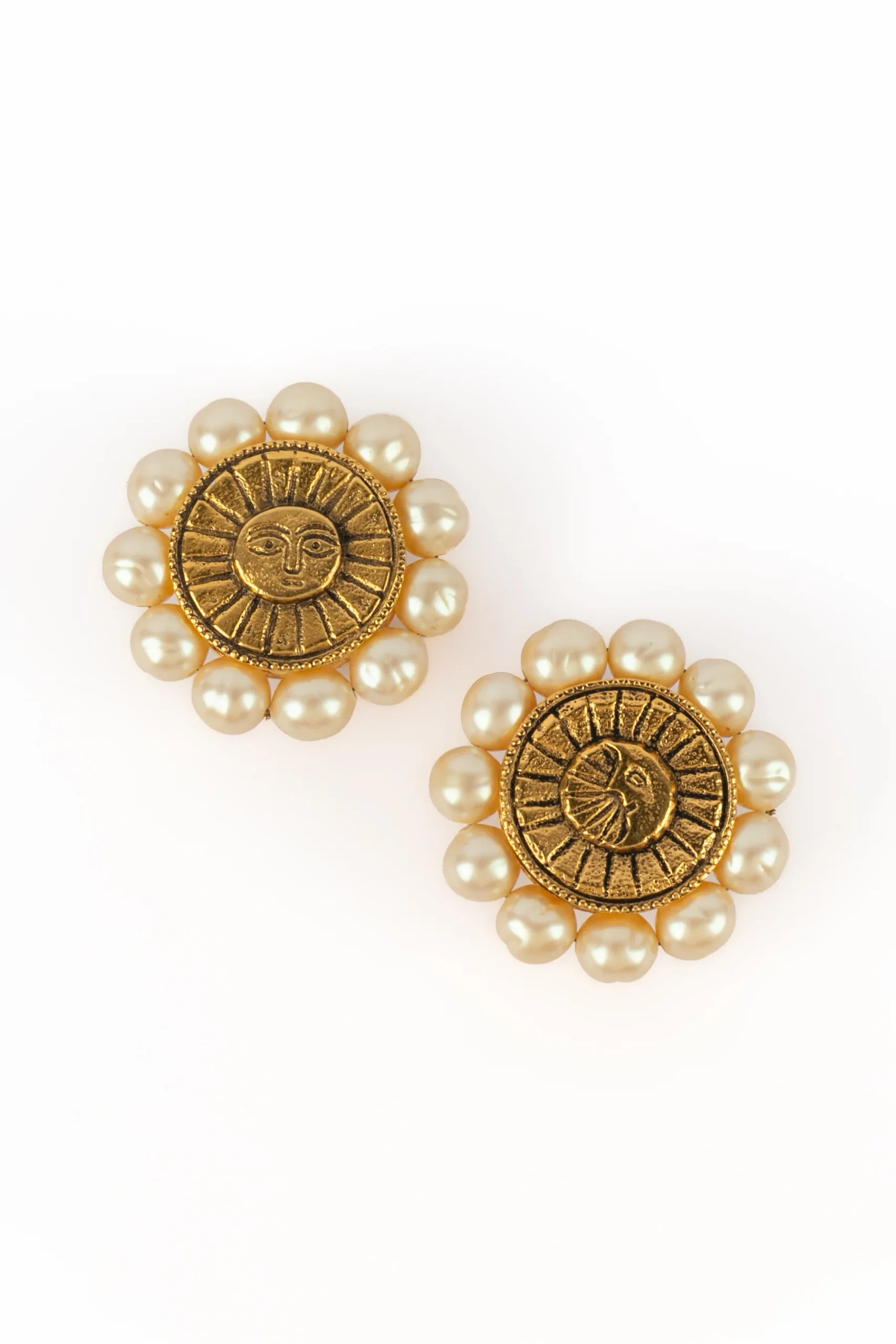 CHANEL -(Made in France) Boucles d’oreilles clips en métal doré et perles nacrées fantaisies figurant un soleil et une lune. Collection Printemps-Été 1988 sous la direction artistique de Karl Lagerfeld. Condition : Très bon état Dimensions : Diamètre : 4 cm