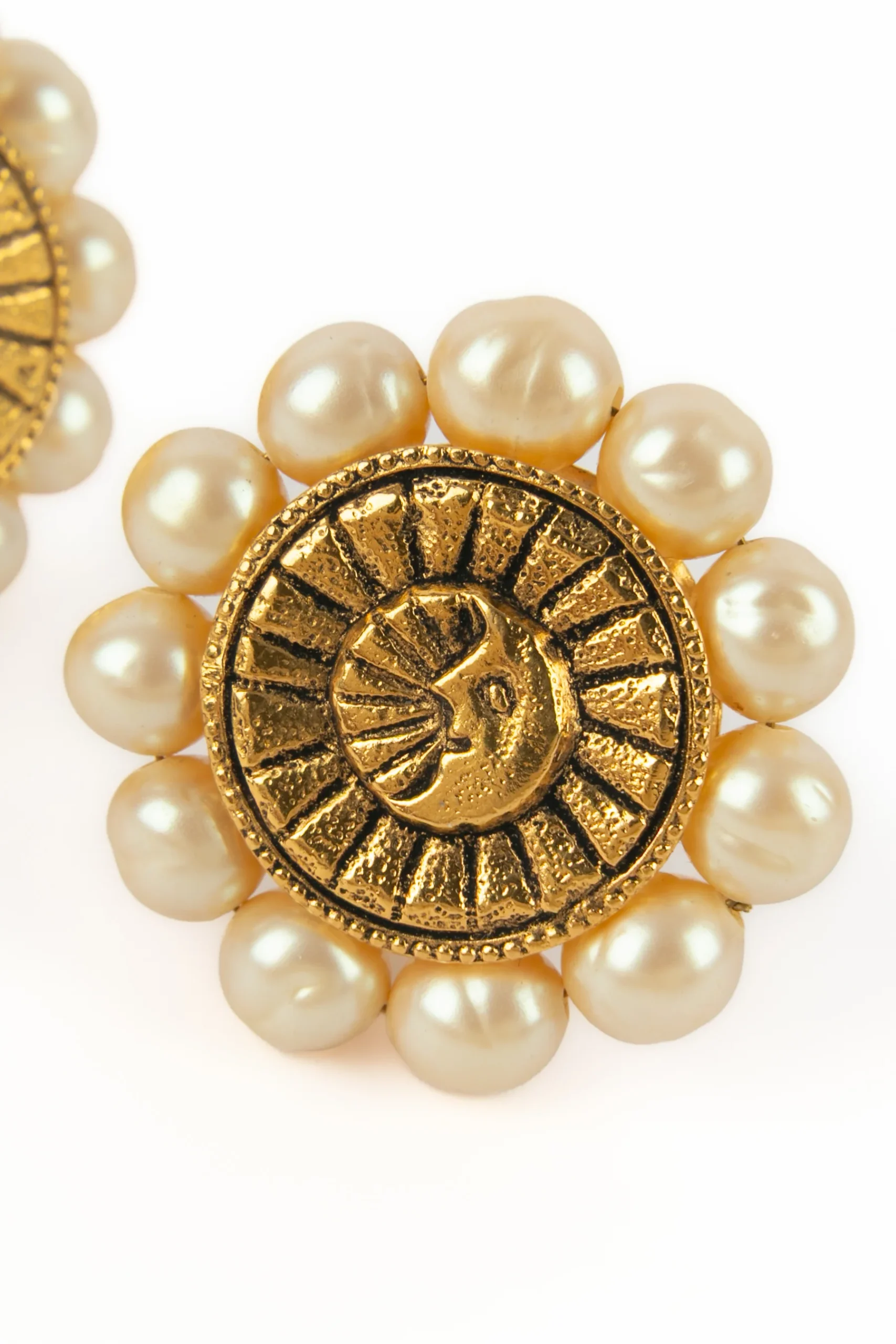 CHANEL -(Made in France) Boucles d’oreilles clips en métal doré et perles nacrées fantaisies figurant un soleil et une lune. Collection Printemps-Été 1988 sous la direction artistique de Karl Lagerfeld.