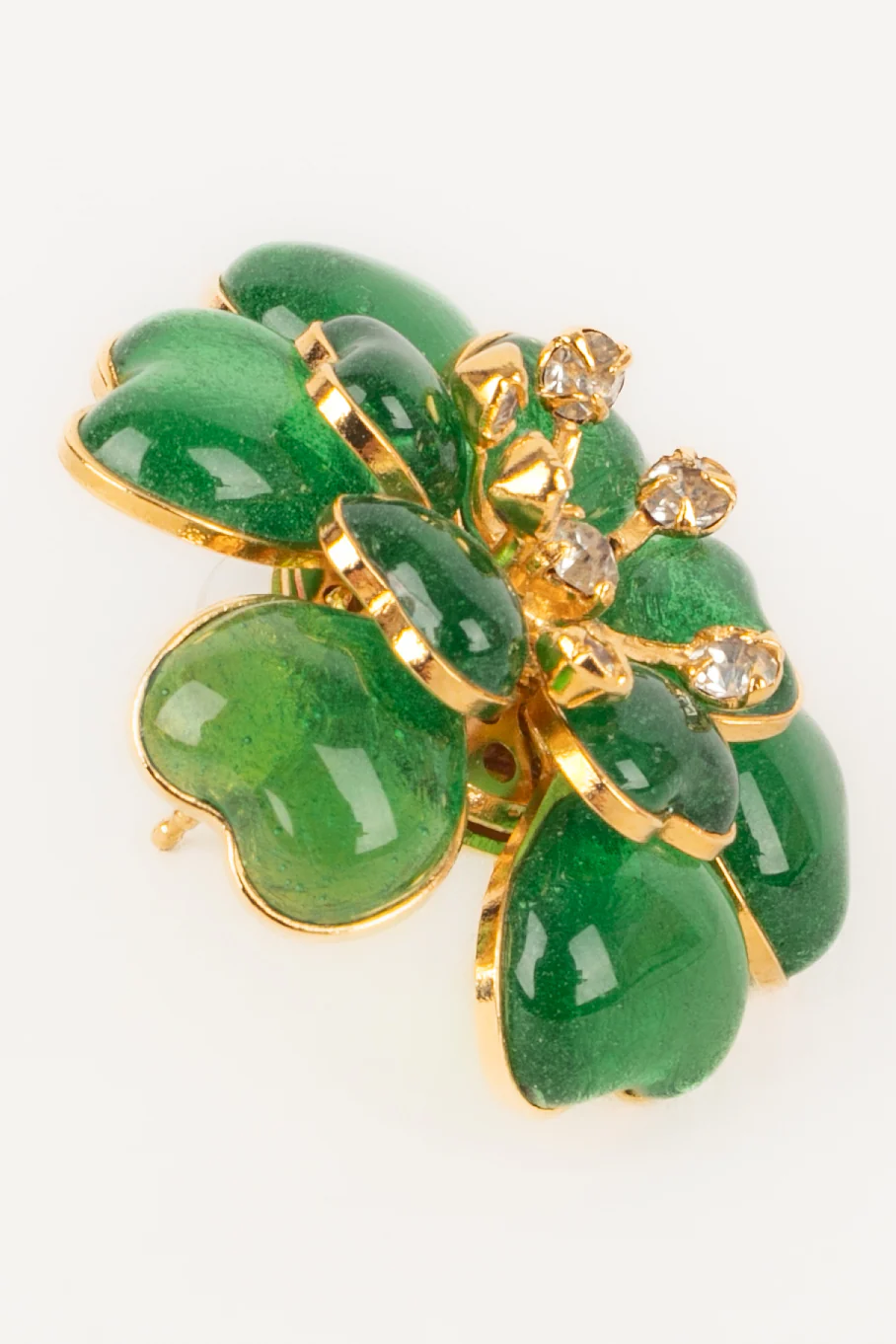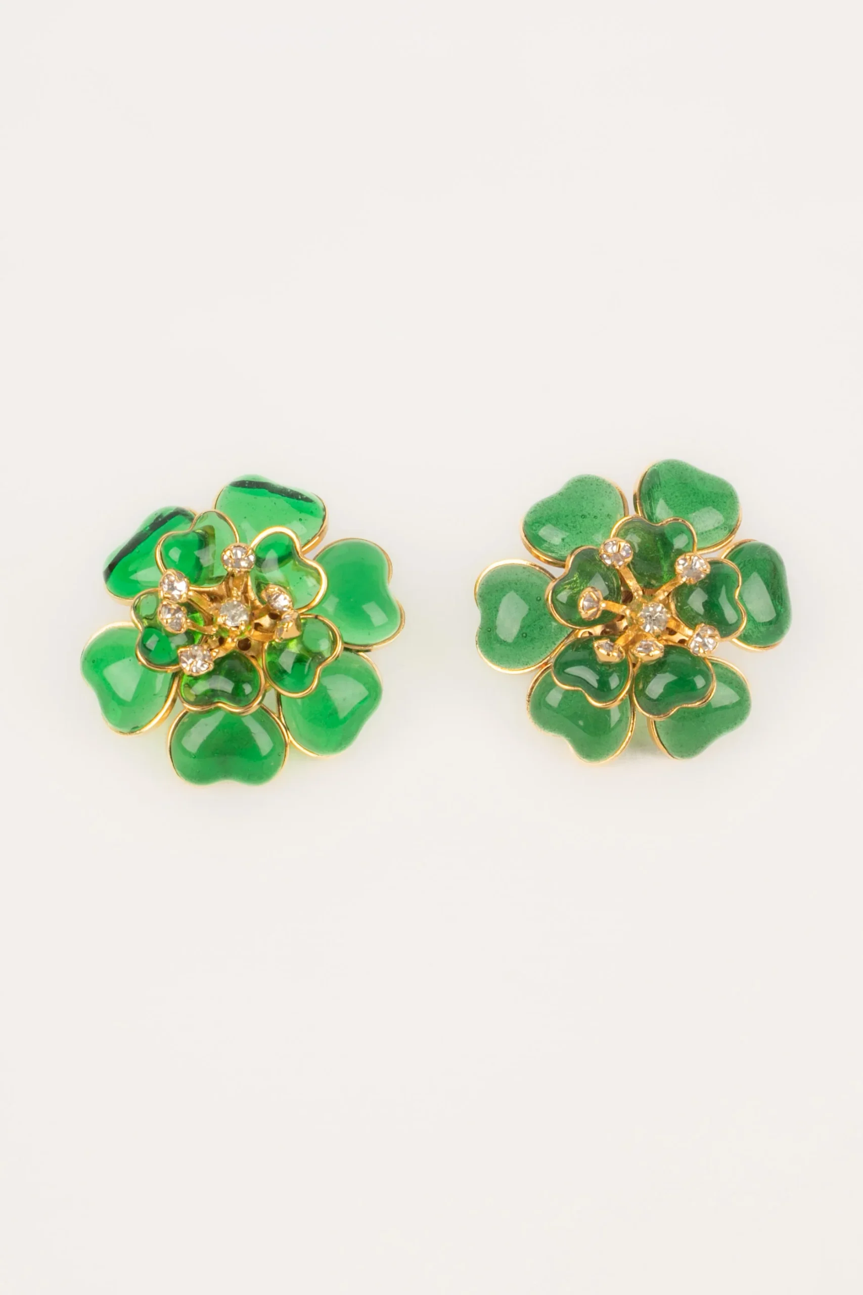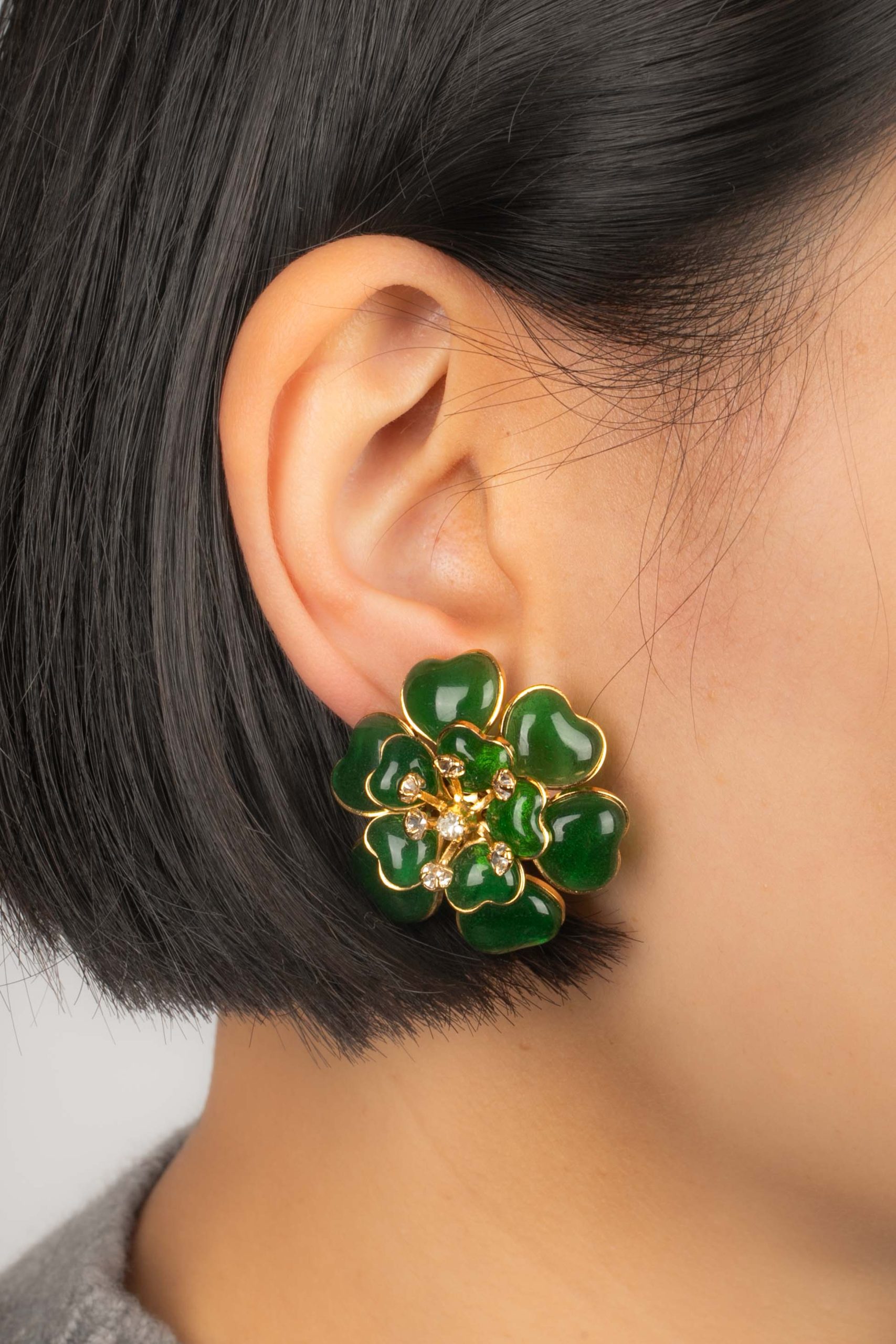 AUGUSTINE -(Made in France) Boucles d’oreilles en métal doré, pâte de verre verte et strass. Condition : Très bon état Dimensions : Hauteur : 3 cm