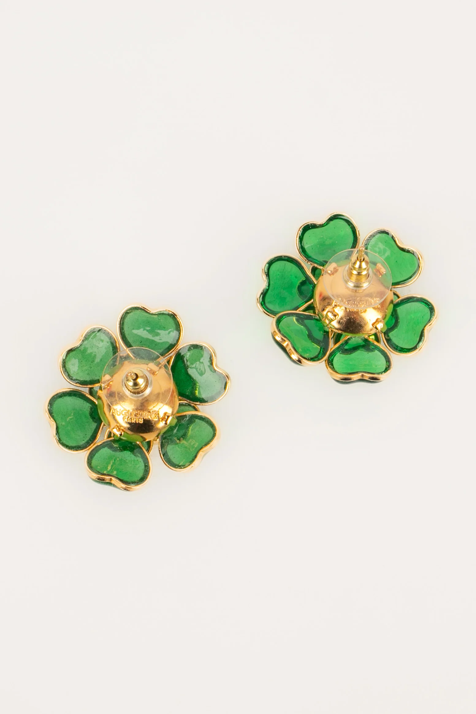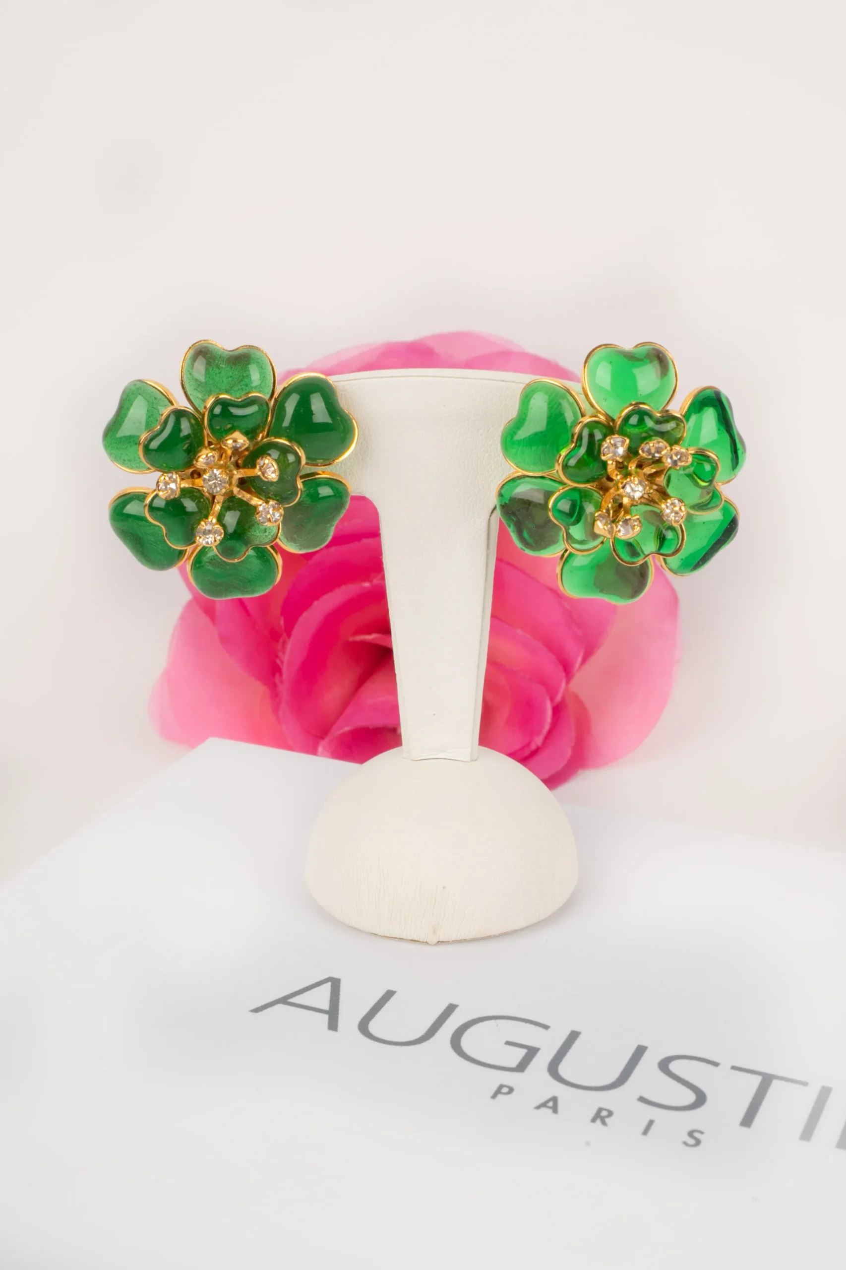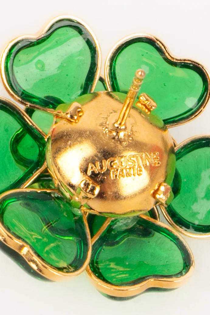 AUGUSTINE -(Made in France) Boucles d’oreilles en métal doré, pâte de verre verte et strass.
