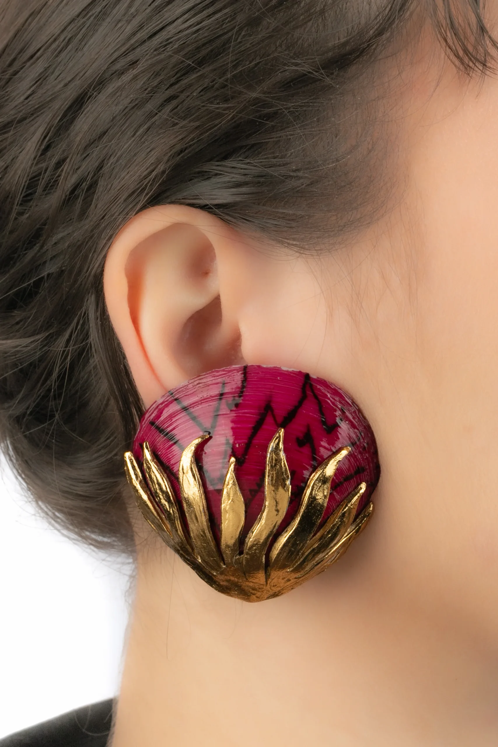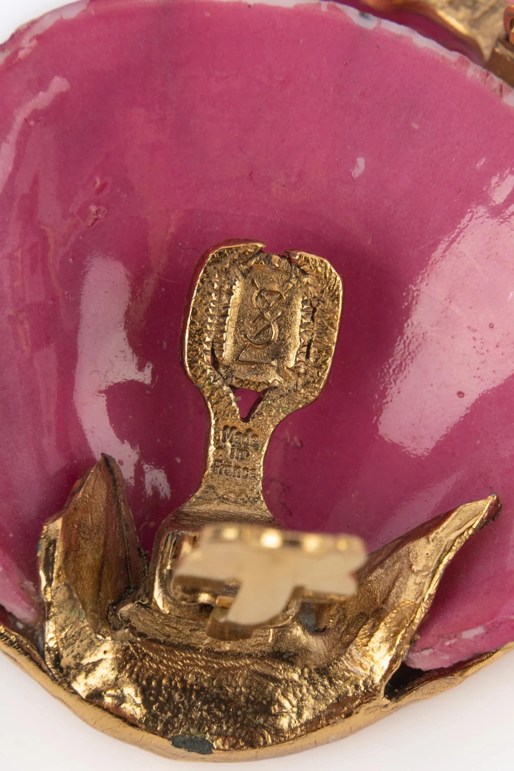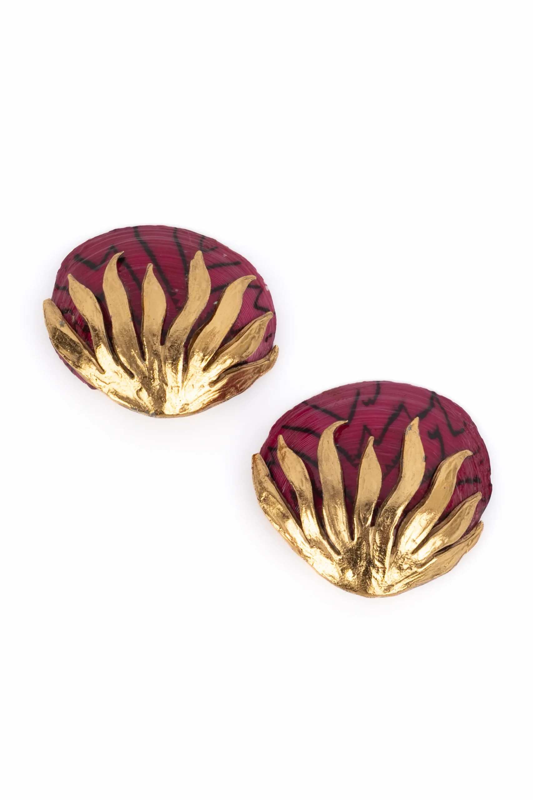 YVES SAINT LAURENT – Boucles d’oreilles en métal doré retenant un coquillage peint couleur prune et décoré de traits noirs. A signaler, légers manques de peinture. Collection circa 1990 sous la direction artistique de Yves Saint Laurent.