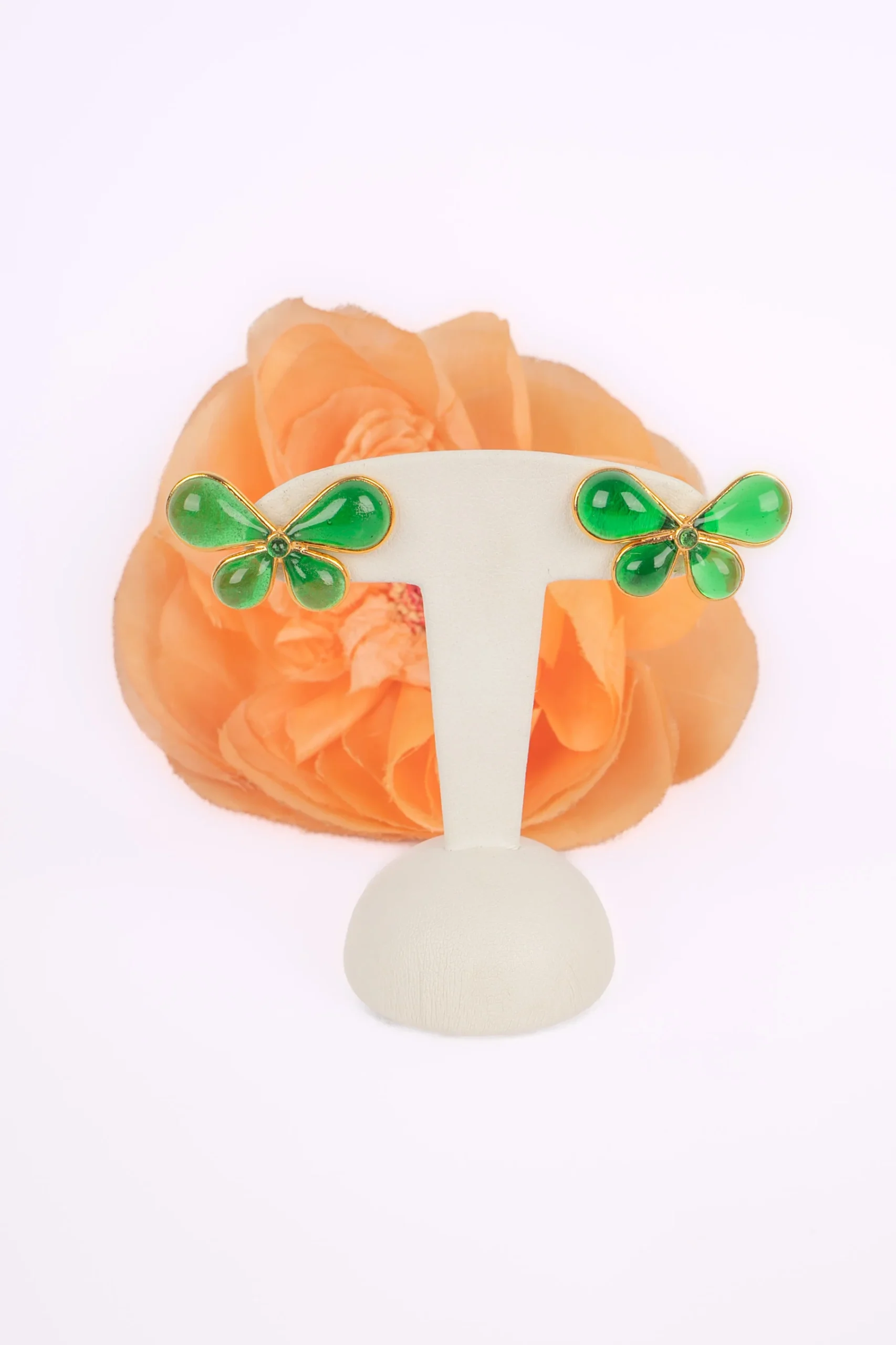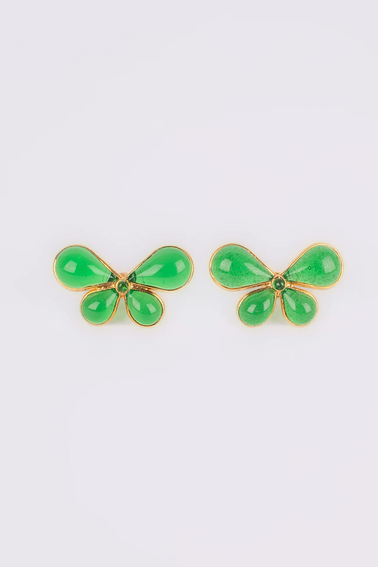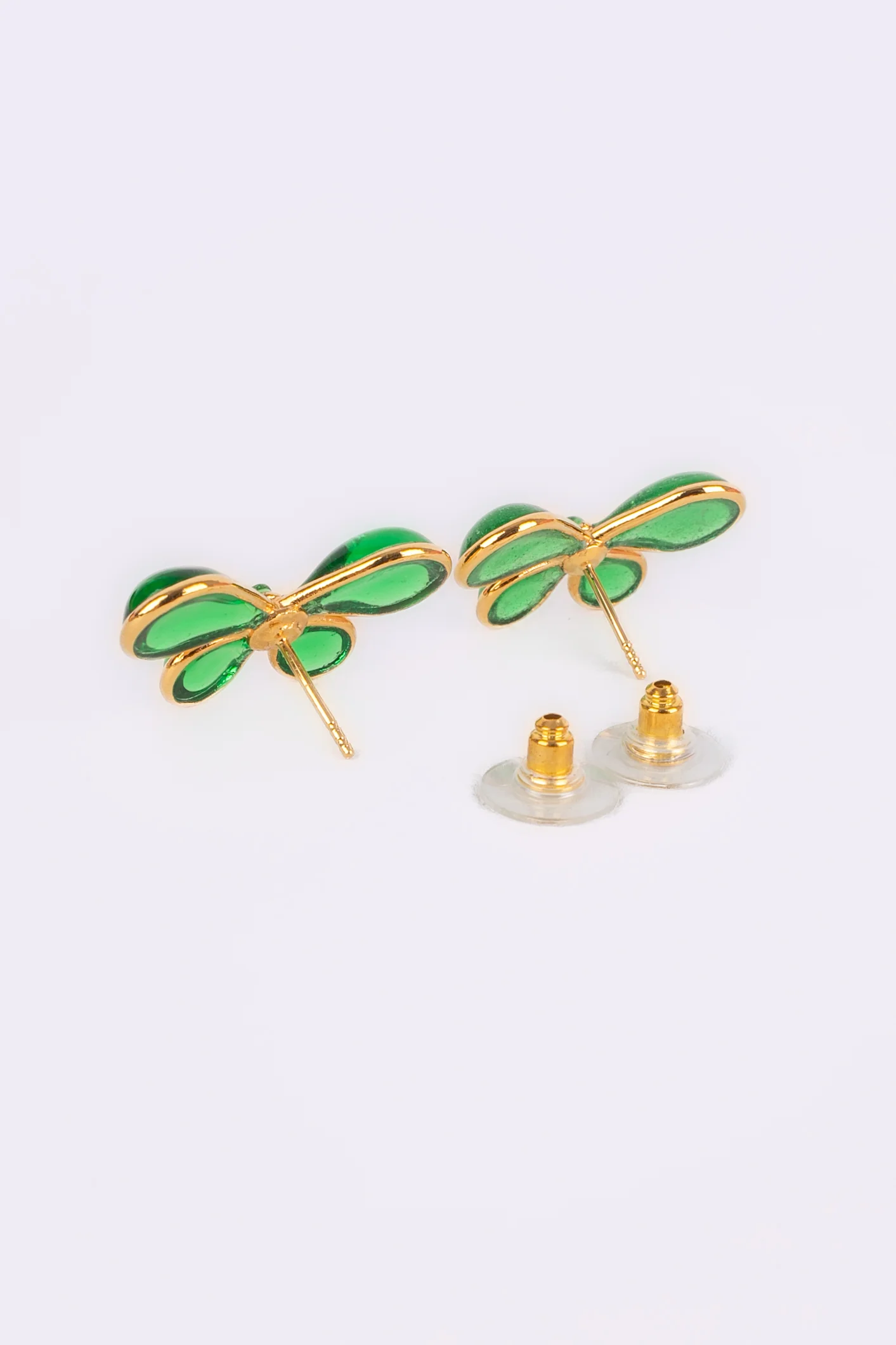 AUGUSTINE -(Made in France) Boucles d’oreilles papillon en métal doré et pâte de verre verte foncée.