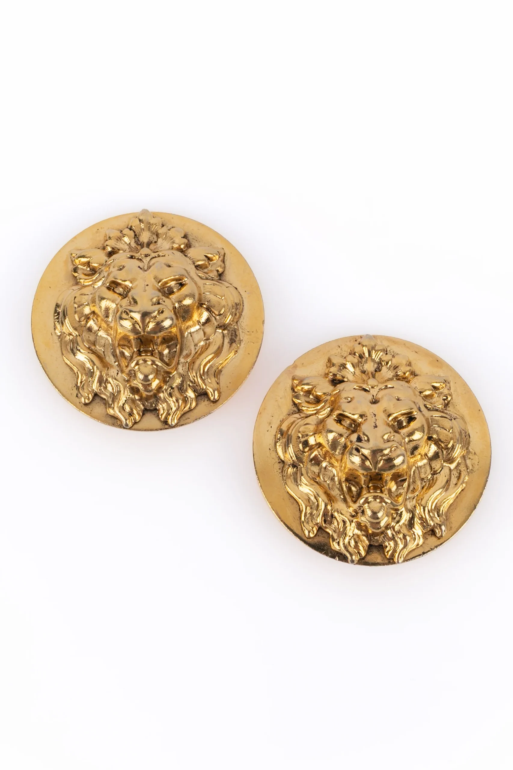 CHANEL – (Made in France) Boucles d’oreilles clips, rondes figurant une tête de lion en métal doré. Bijou non signé. Collection Chanel Haute Couture circa 1980.