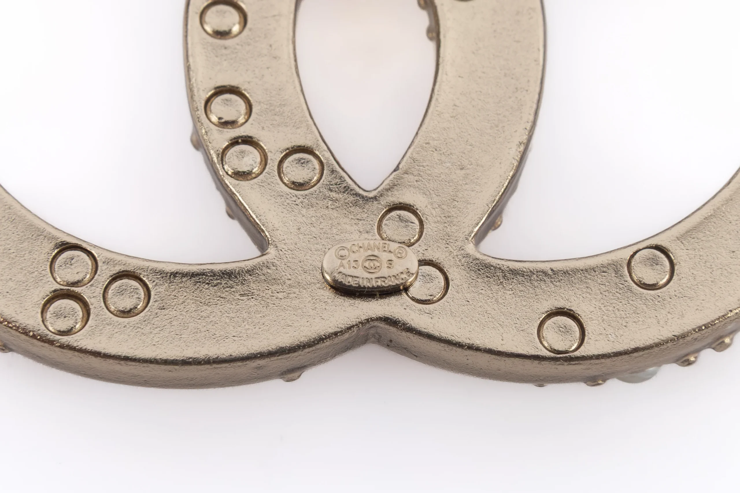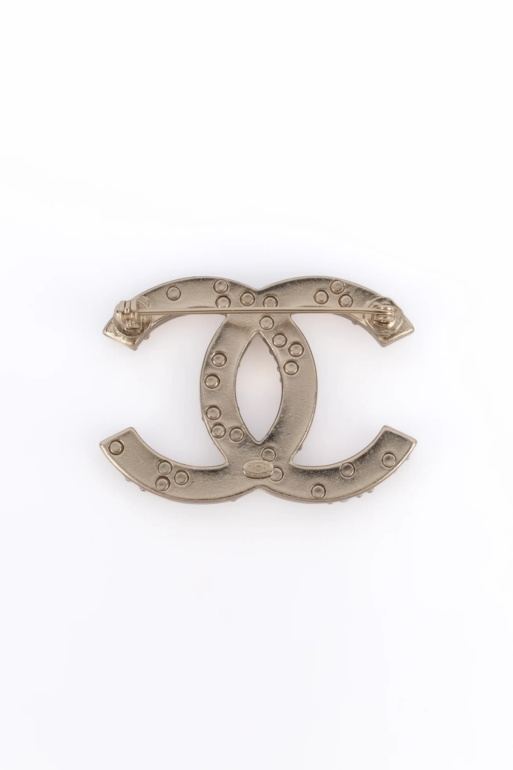 CHANEL – (Made in France) Broche cc en métal doré pavée de petites cabochons nacrés de différentes tailles. Collection 2013 sous la direction artistique de Karl Lagerfeld. Condition : Très bon état Dimensions : 5 cm x 3,6 cm
