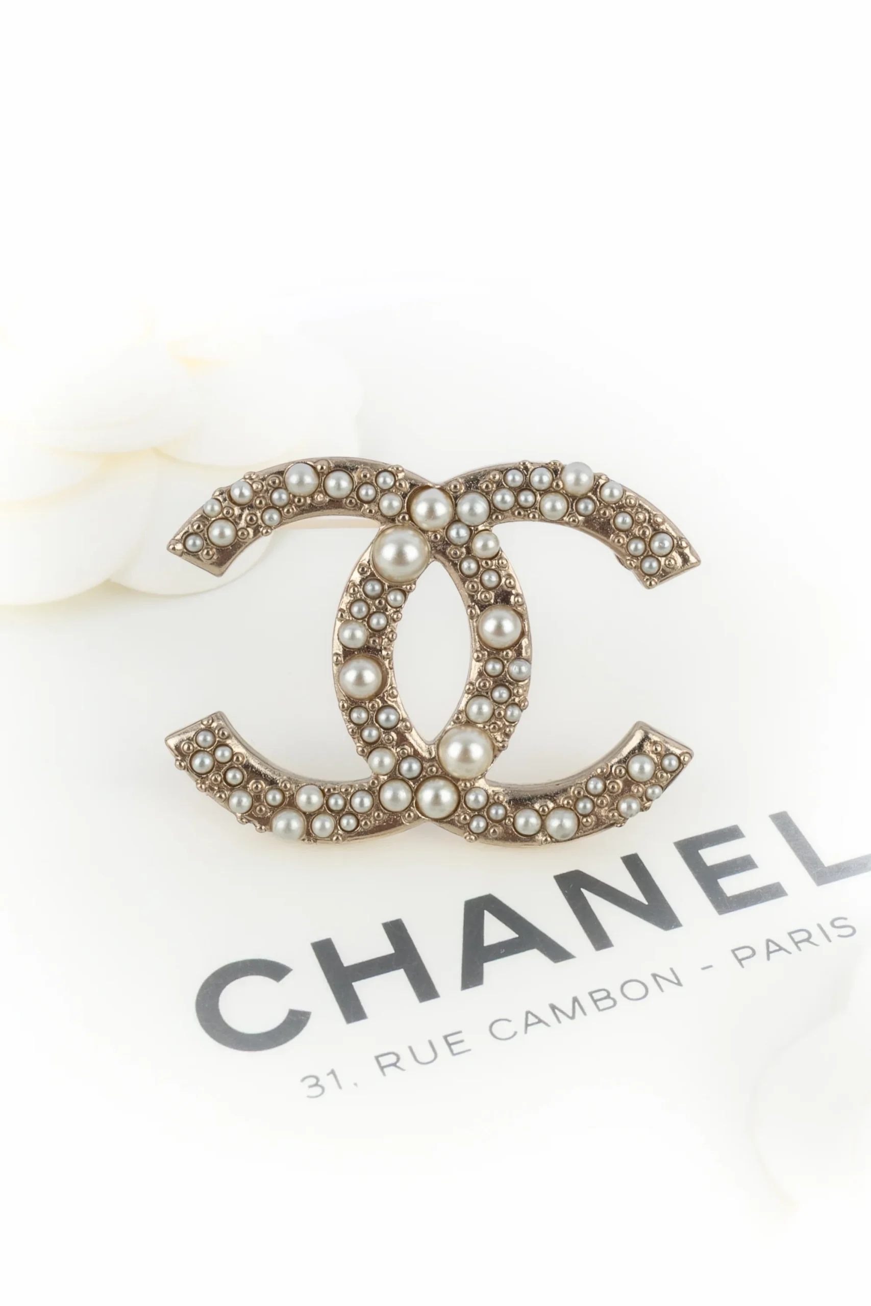 CHANEL – (Made in France) Broche cc en métal doré pavée de petites cabochons nacrés de différentes tailles. Collection 2013 sous la direction artistique de Karl Lagerfeld.