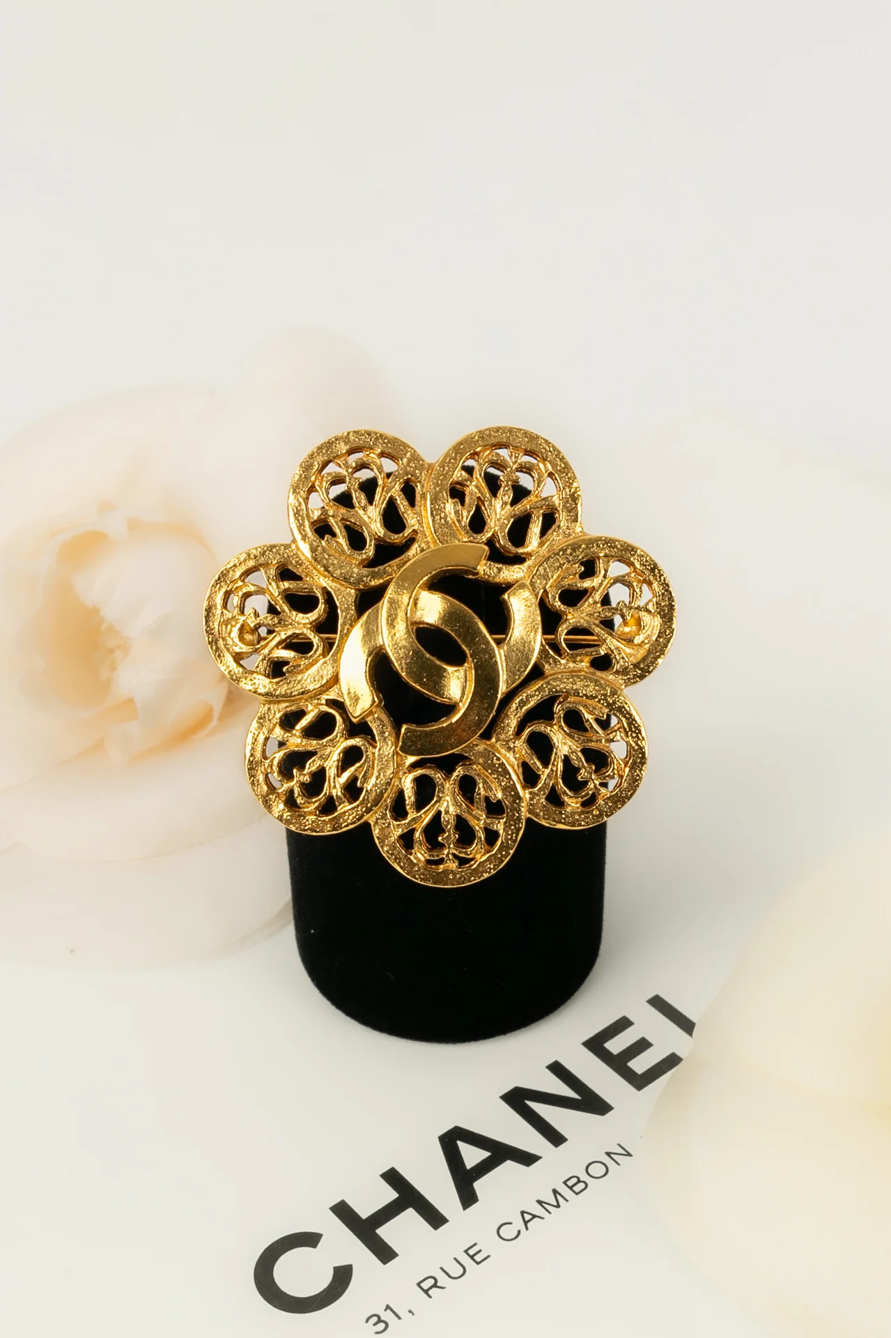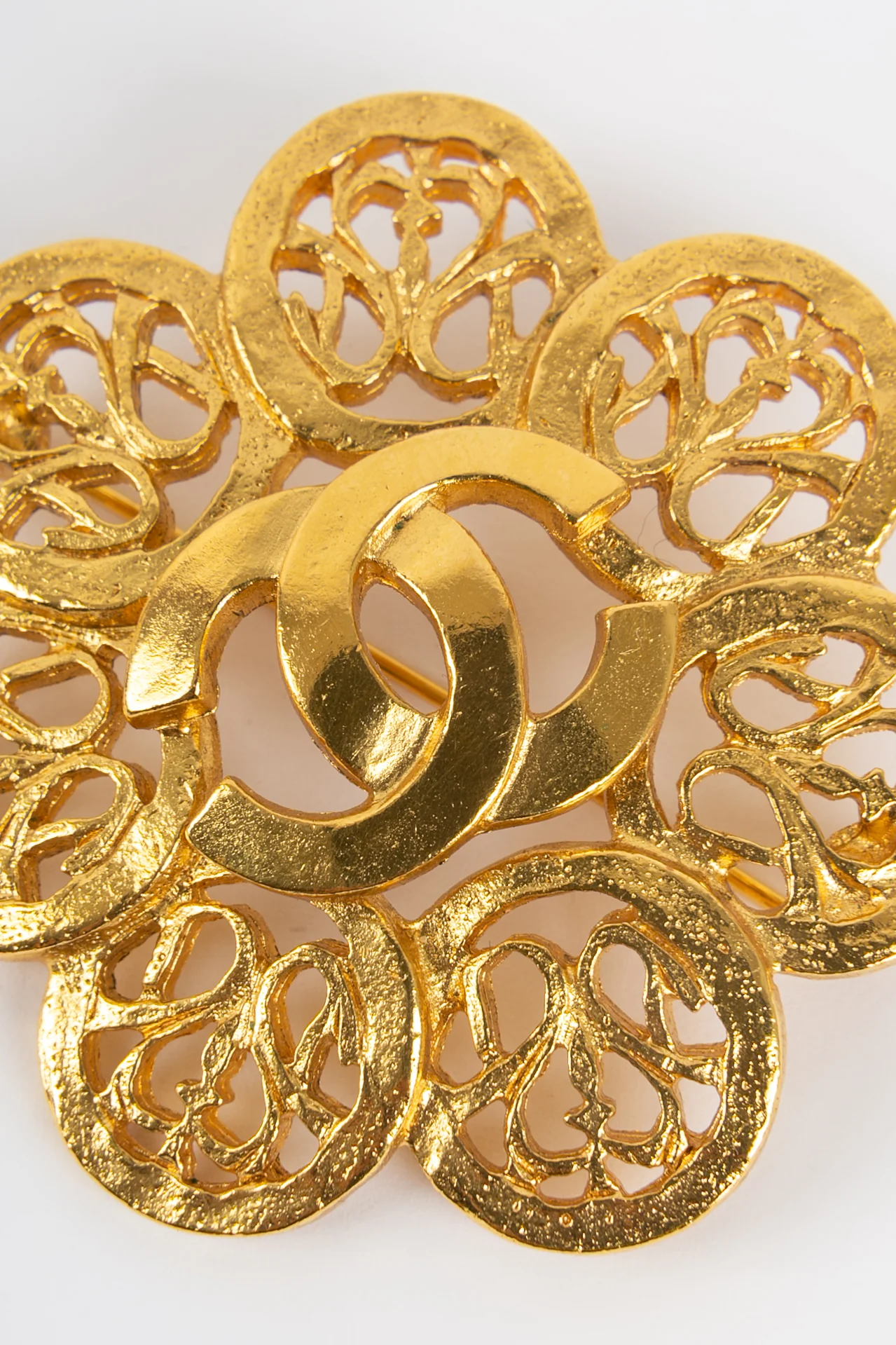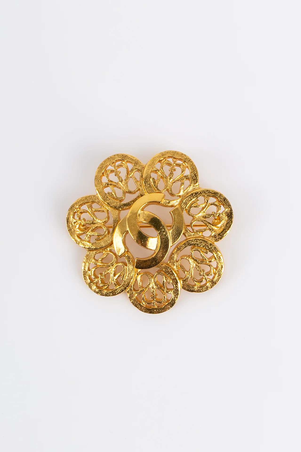 CHANEL -(Made in France) Broche en métal doré centrée d’un logo cc. Collection Automne-Hiver 1995 sous la direction de Karl Lagerfeld.