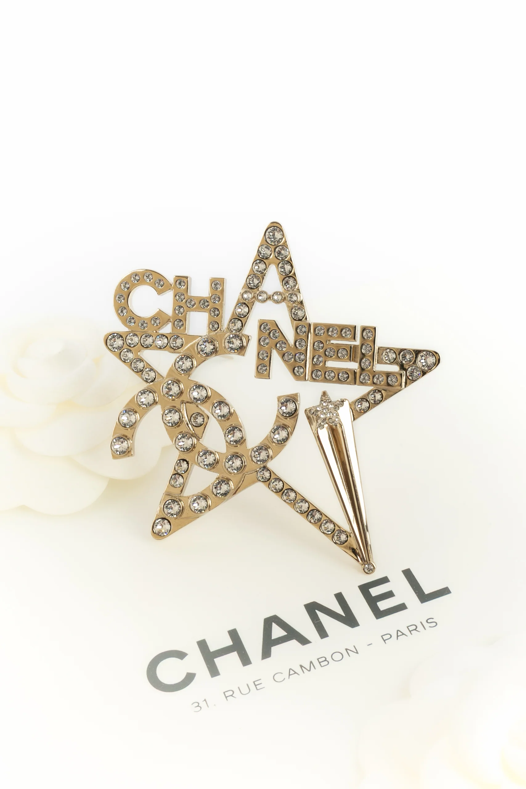 CHANEL – (Made in France) Broche étoile en métal champagne pavée de strass. Collection 2021. Condition : Très bon état Dimensions : Hauteur : 8 cm