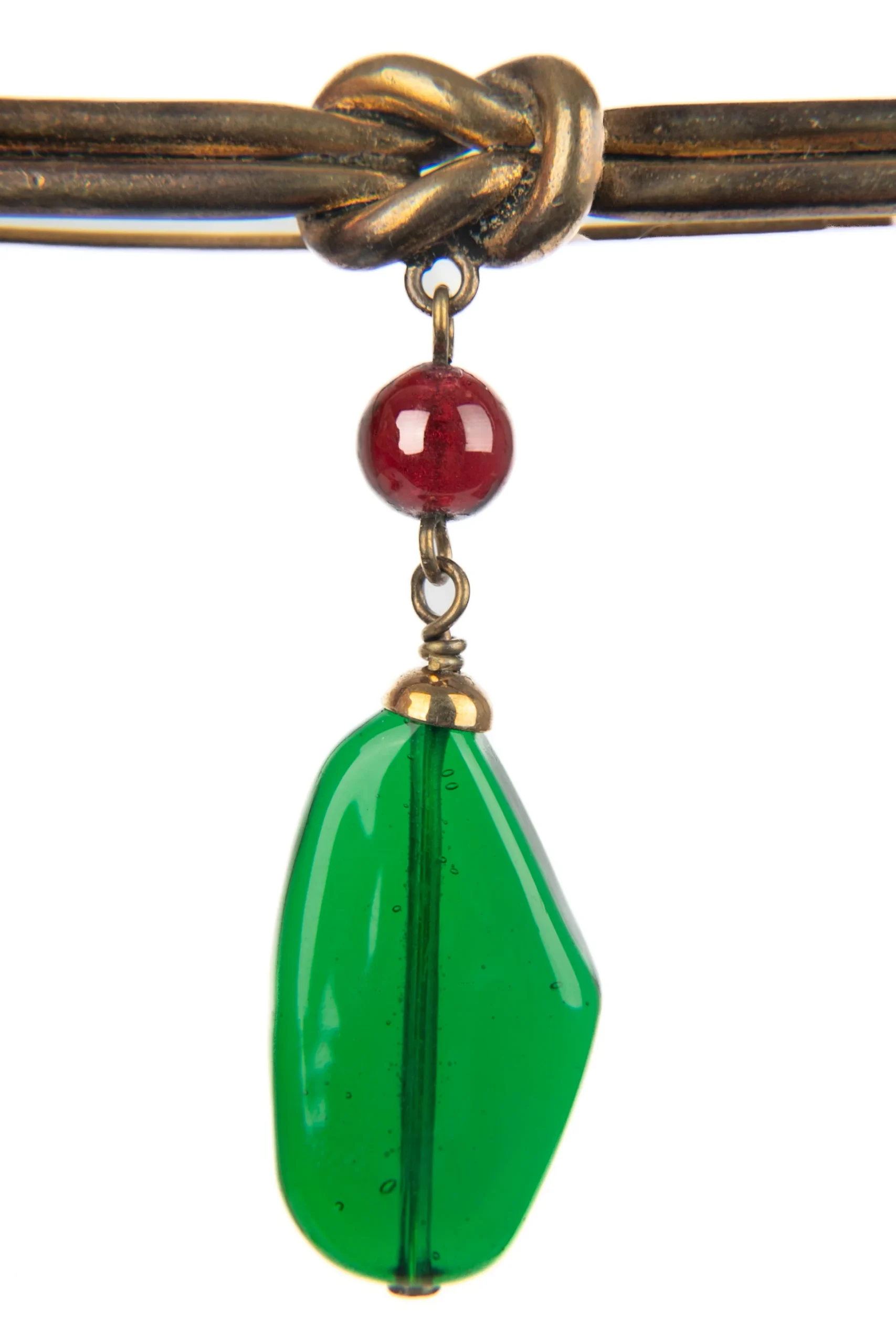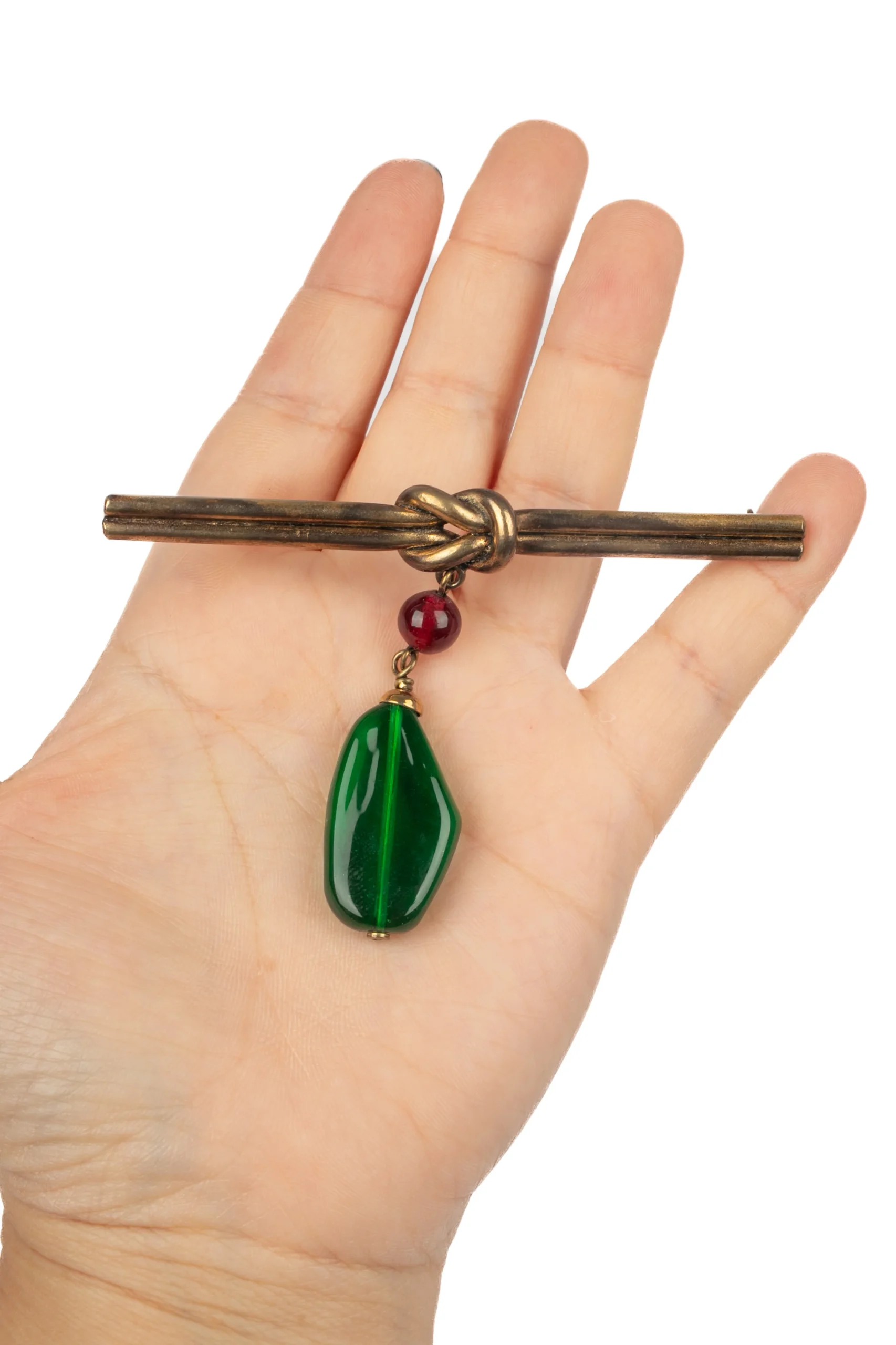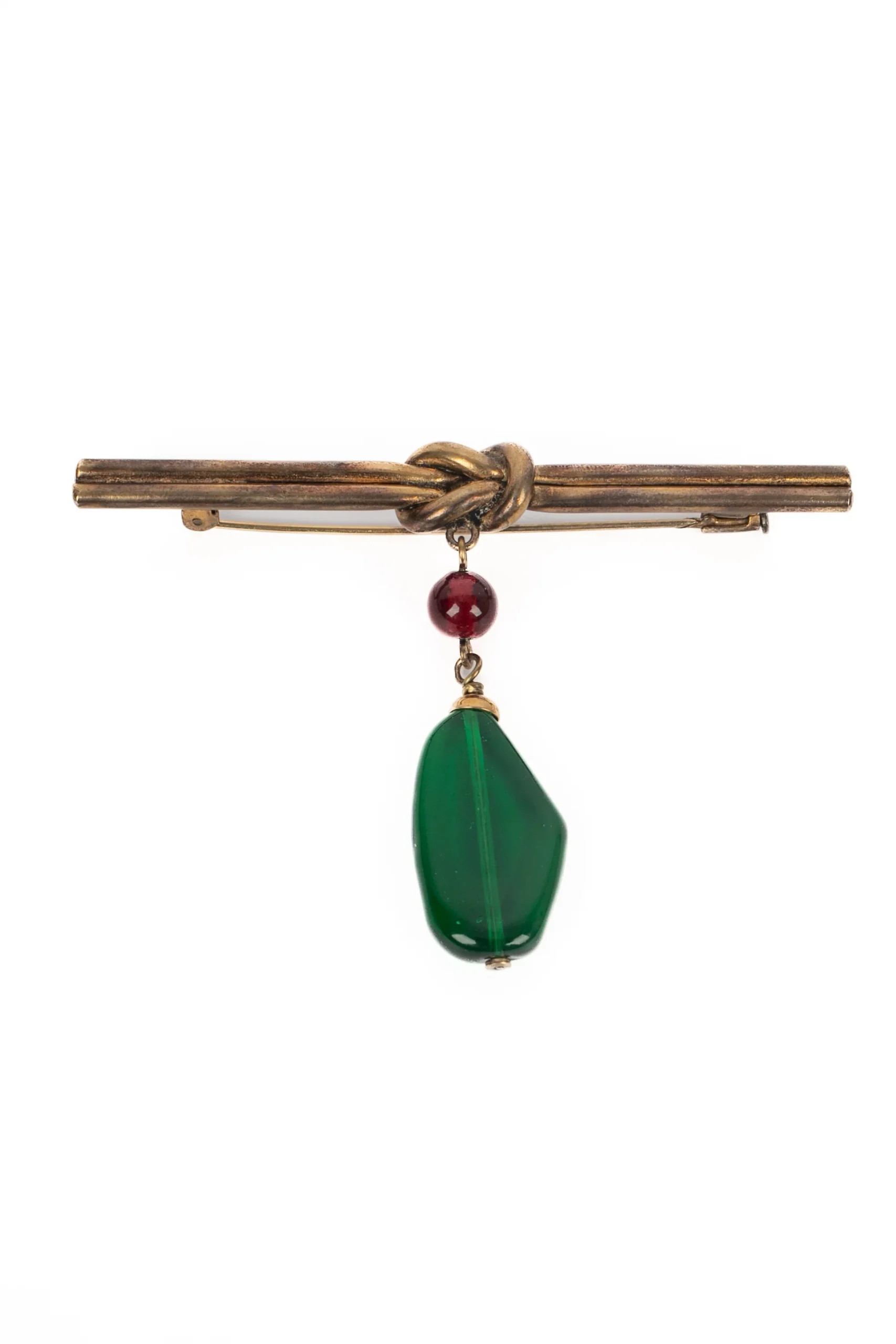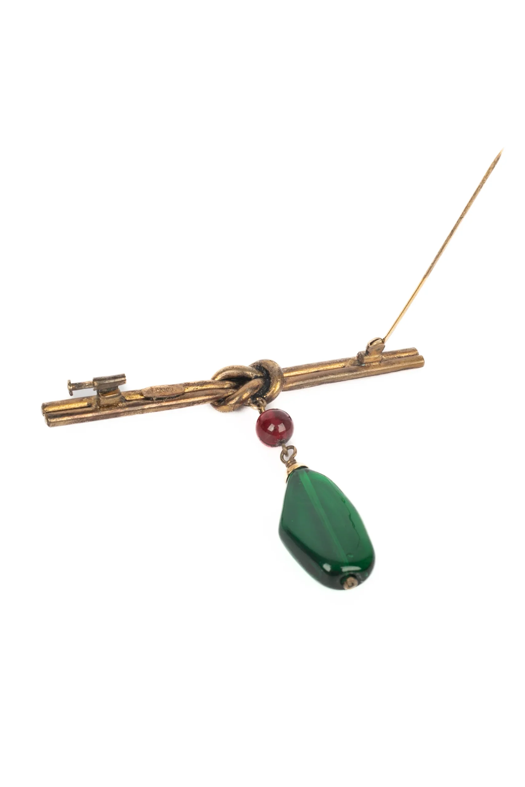 CHANEL – Broche en métal doré foncé retenant une perle et une goutte en pâte de verre. Collection époque Coco.