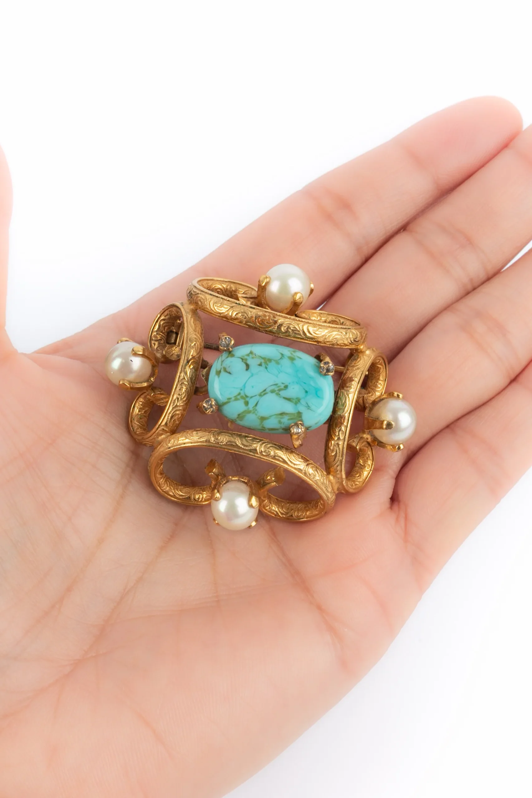 CHANEL – Broche en métal doré gravée surmontée d’une perle verre imitation turquoise et décorée de perles de nacre fantaisie. Collection époque Coco. Condition : Très bon état Dimensions : Hauteur : 4 cm
