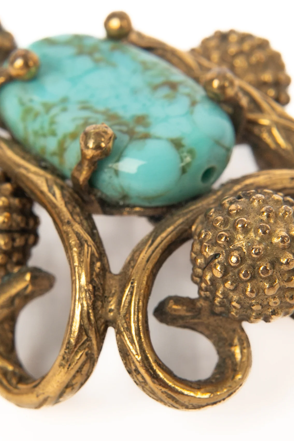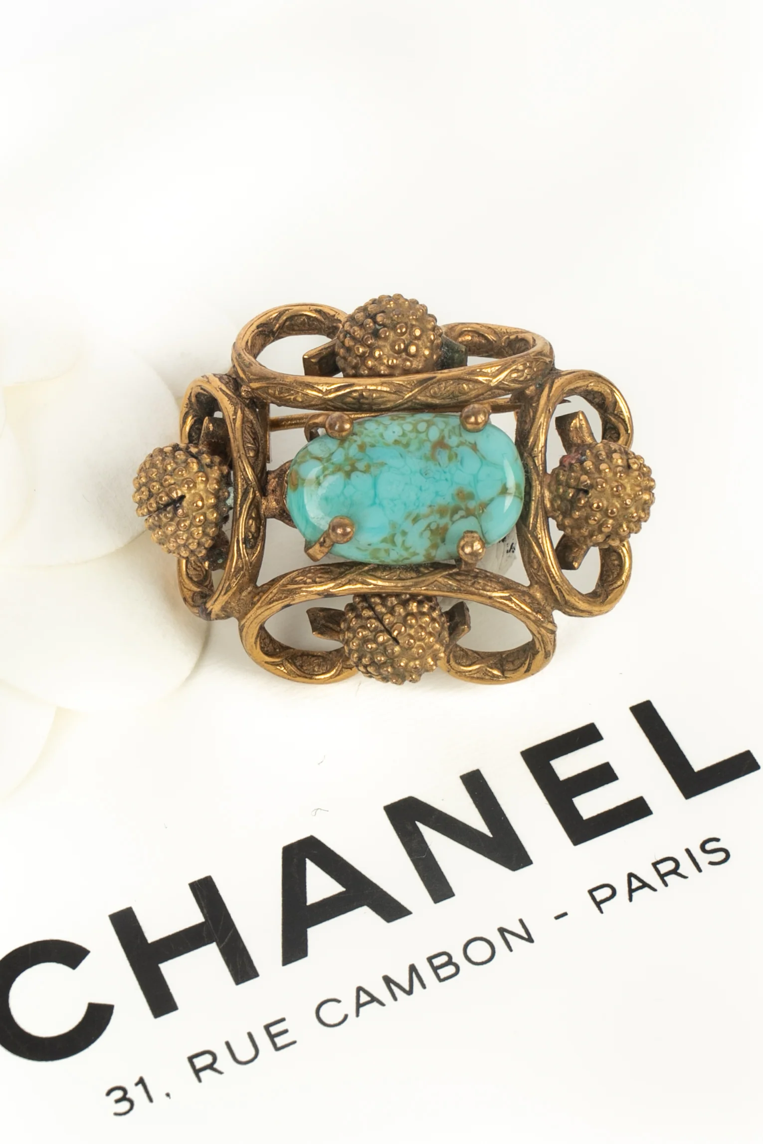 CHANEL – (Made in France) Broche en métal doré et perles en pâte de verre bleu. Collection époque Coco.