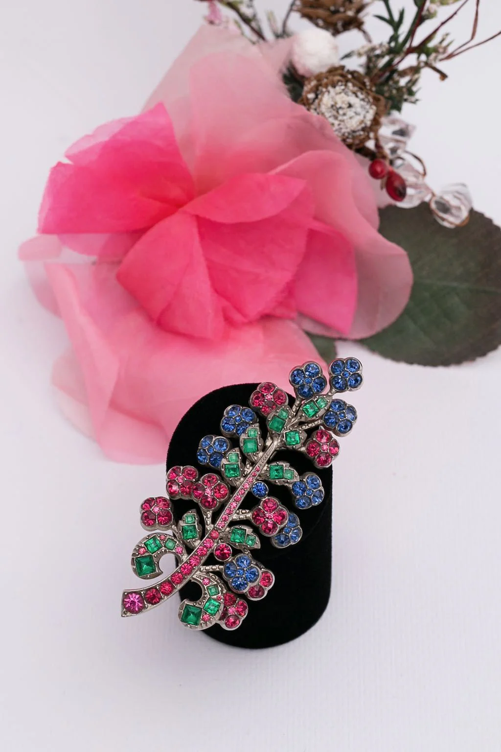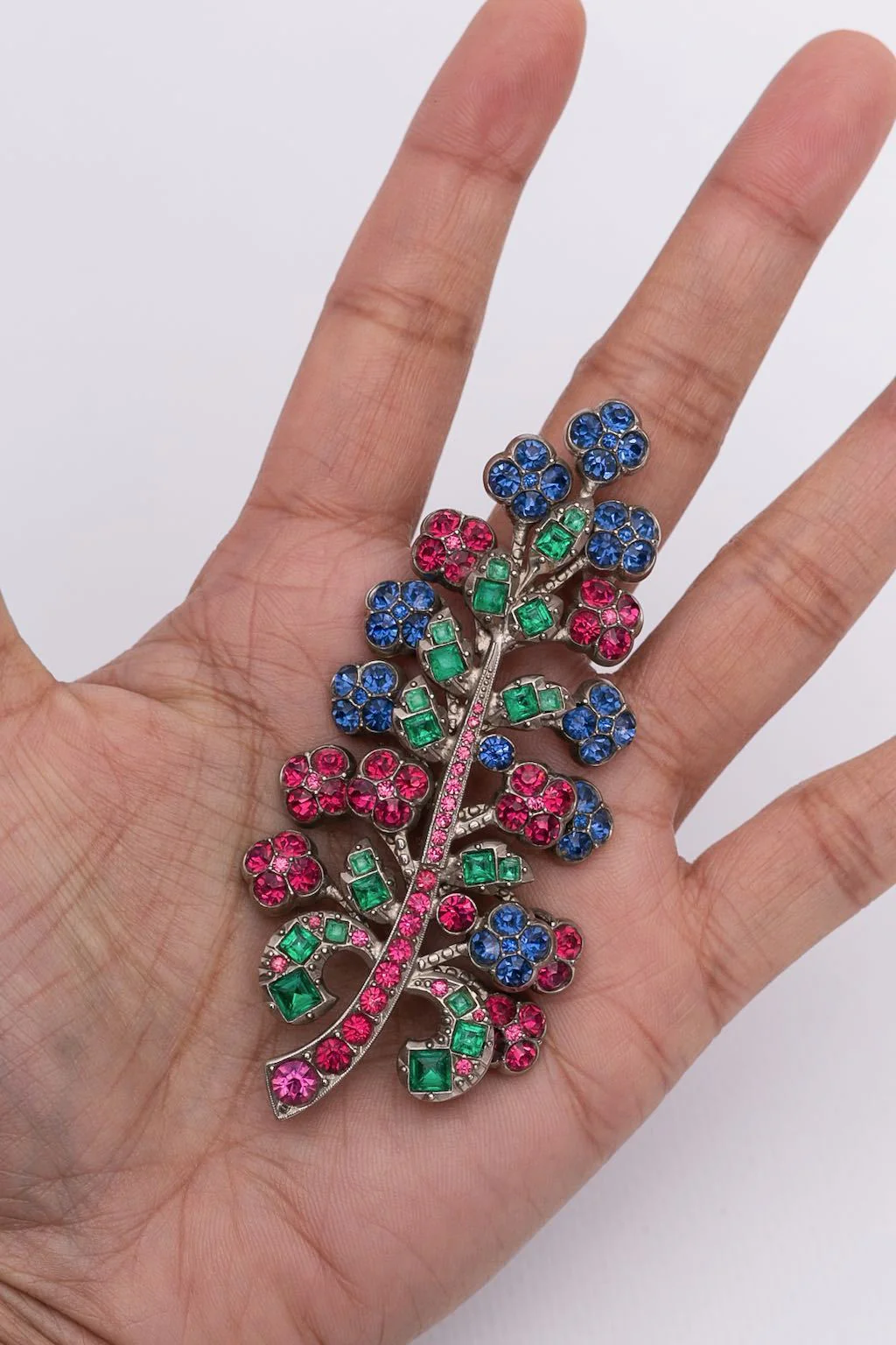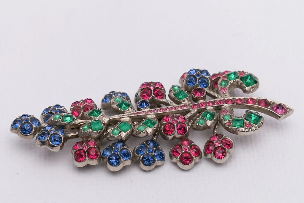 ANONYME – Broche en métal argenté sertie de strass formant une branche.