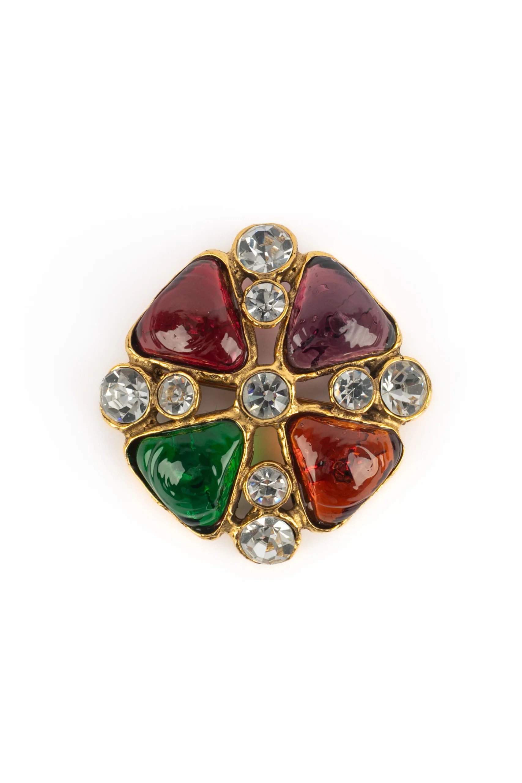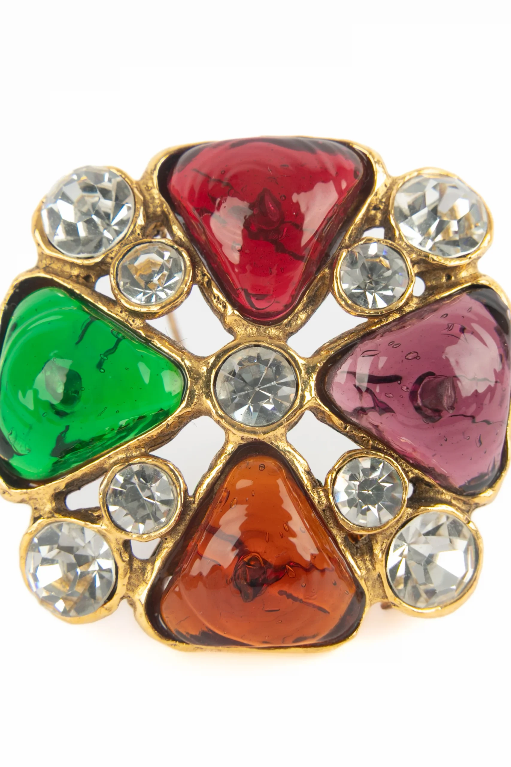 CHANEL -(Made in France) Broche de style byzantin en métal doré, pâte de verre et strass de Swarovski. Bijou datant de la fin des années 1980-début 1990.