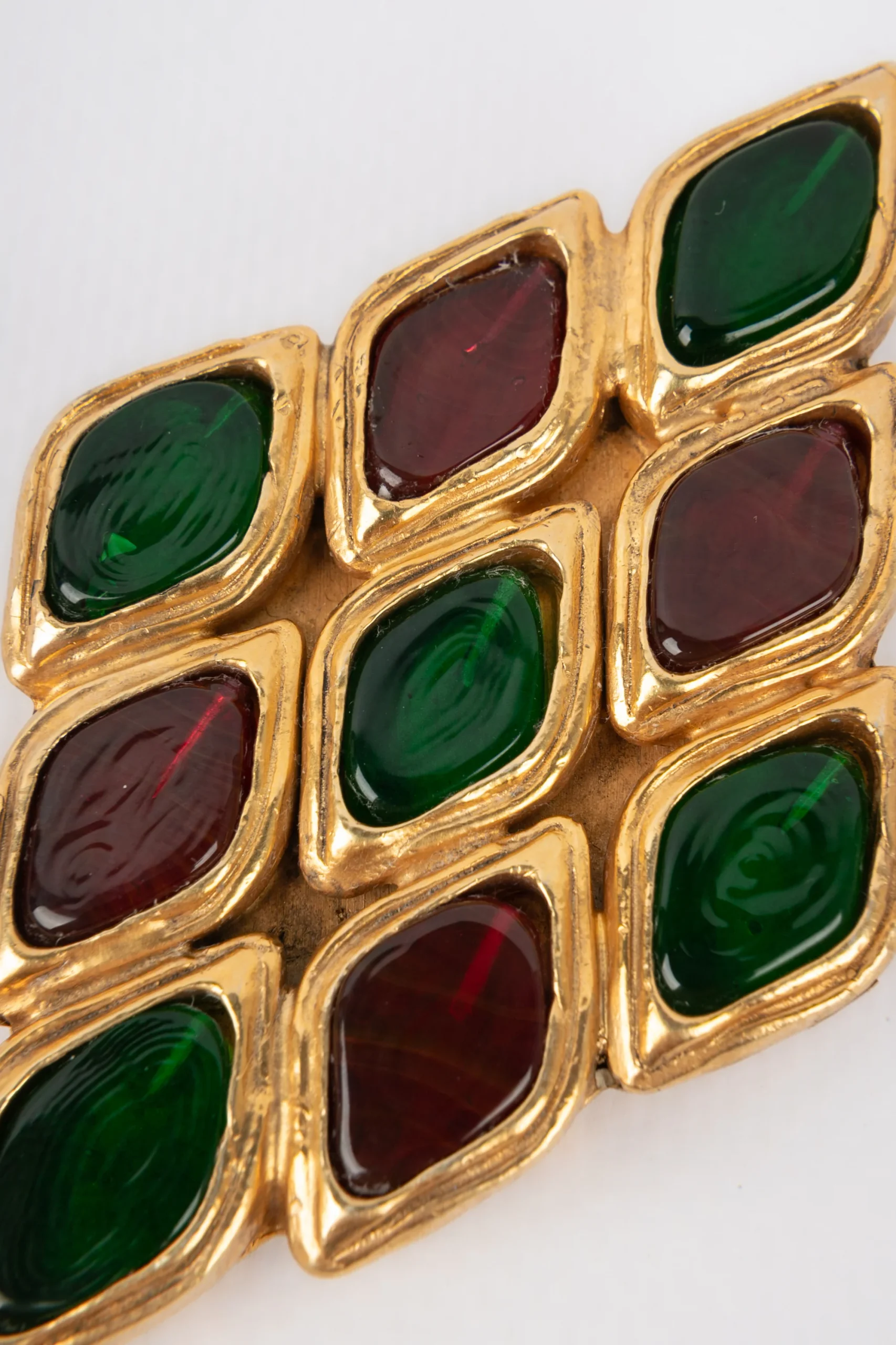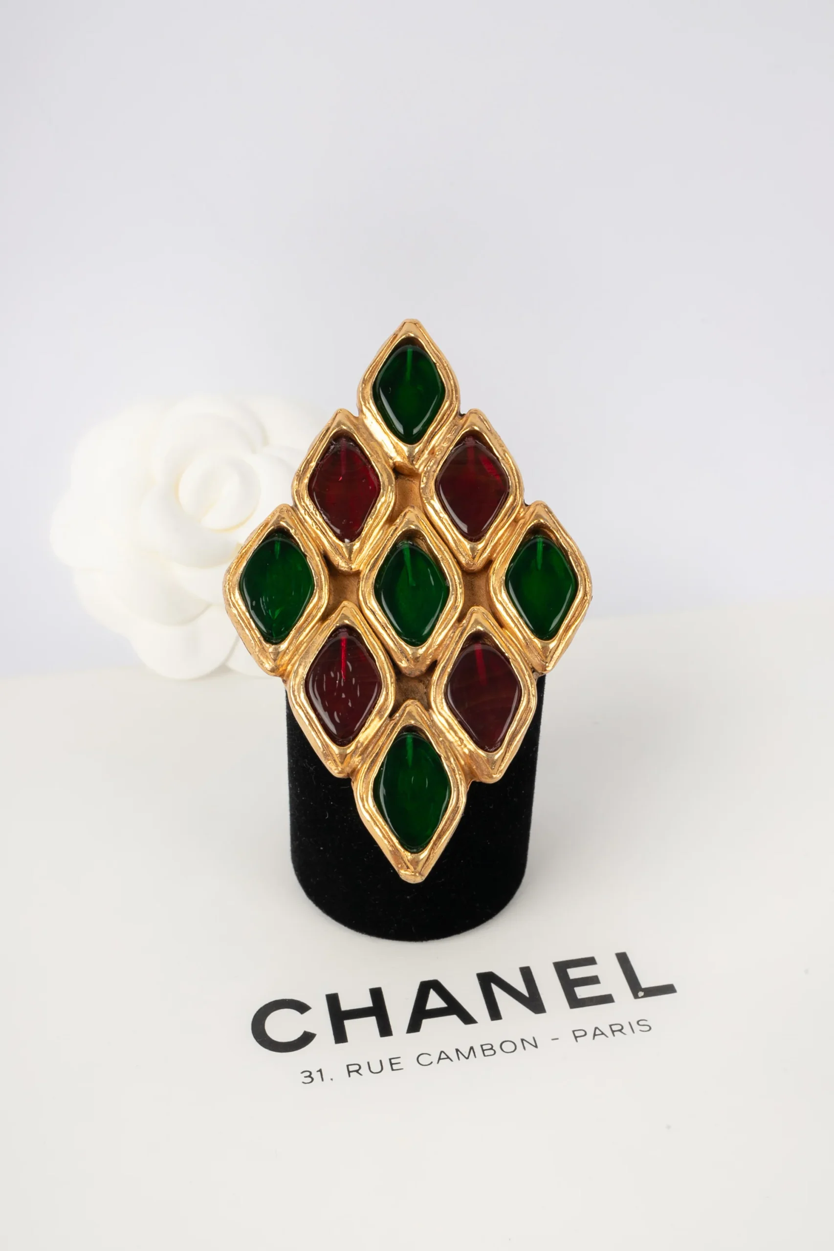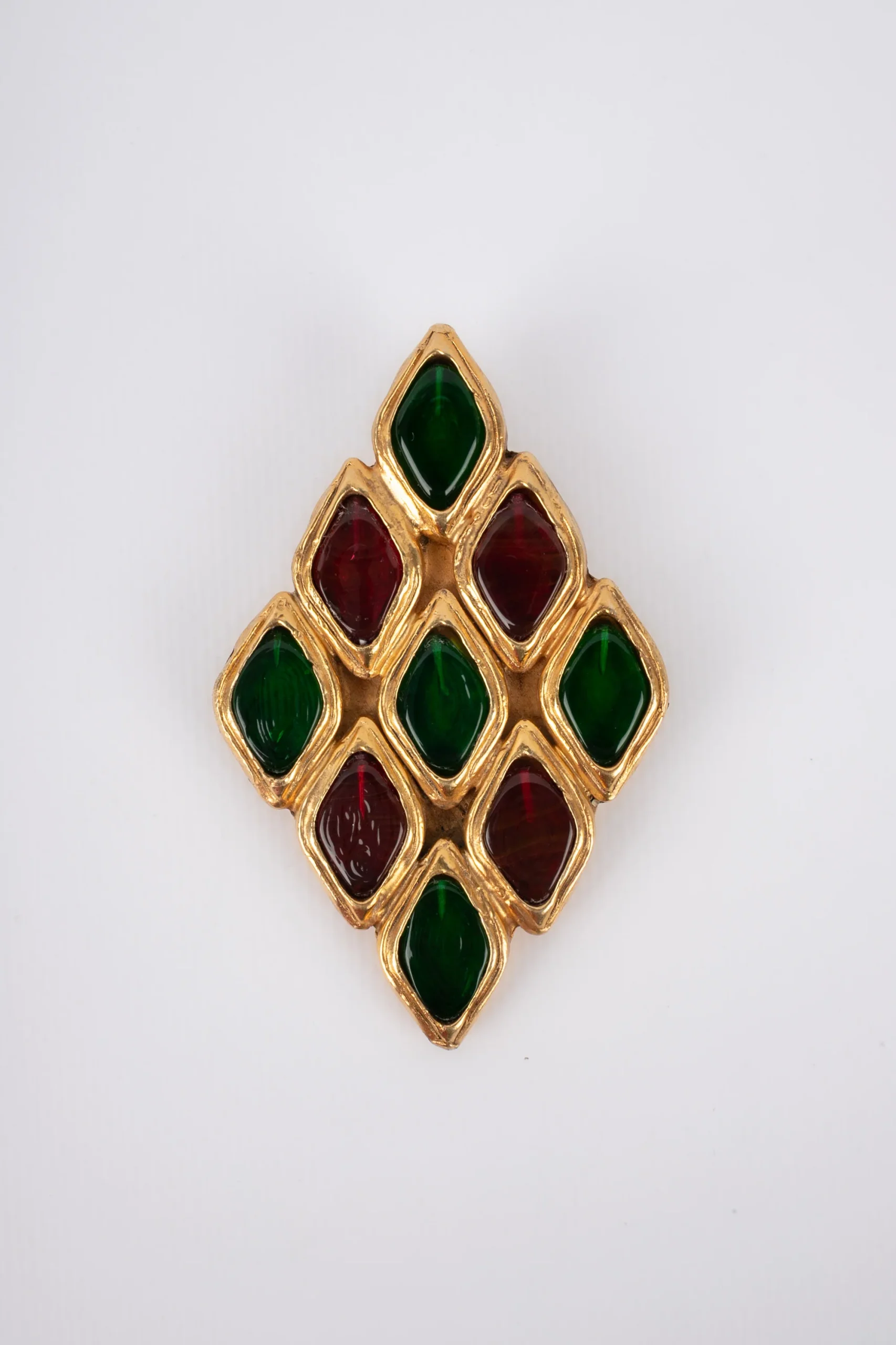 CHANEL -(Made in France) Broche en métal doré figurant un losange pavée de cabochons en pâte de verre vert et rouge.