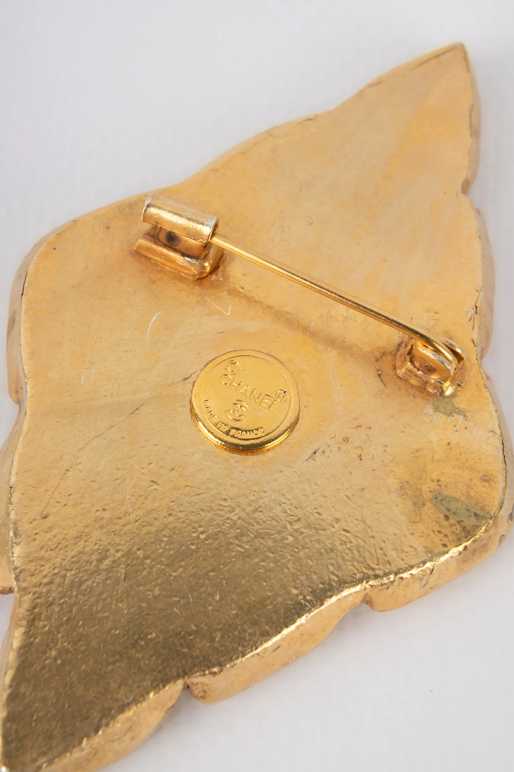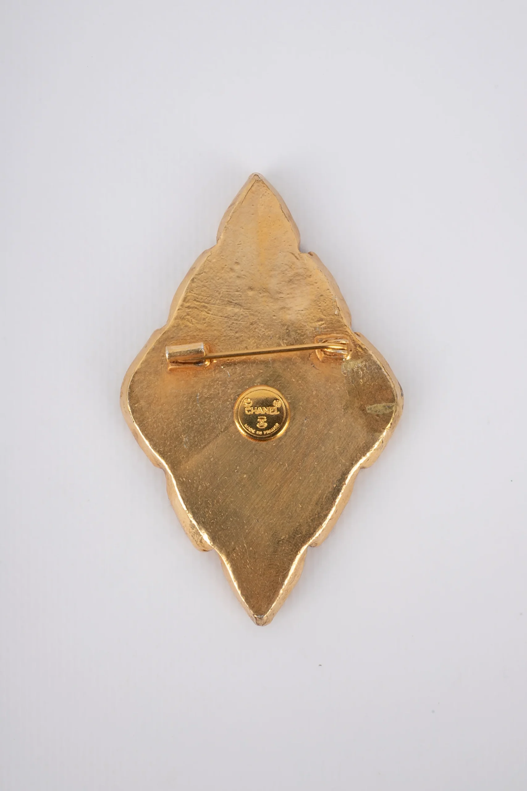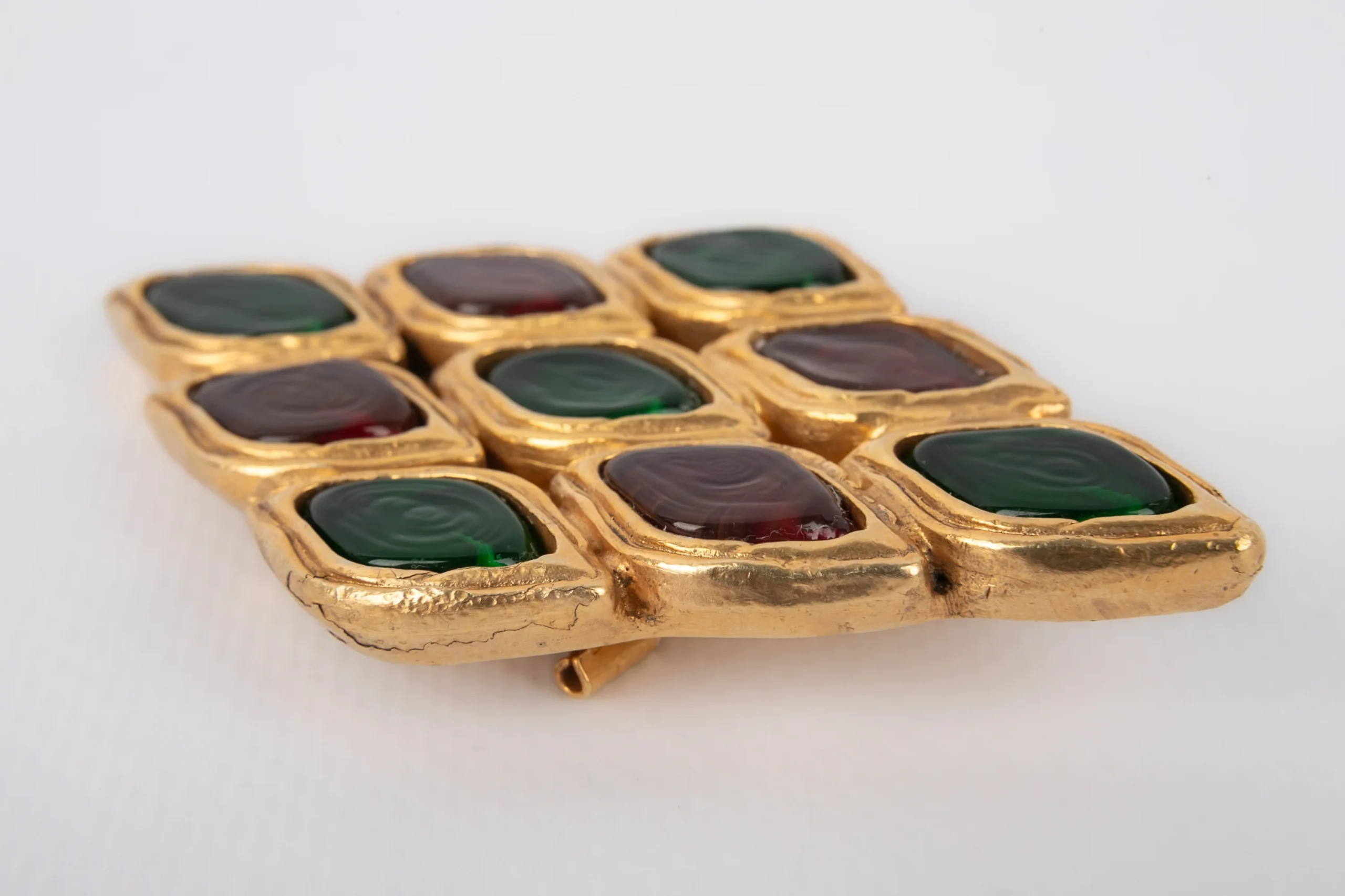 CHANEL -(Made in France) Broche en métal doré figurant un losange pavée de cabochons en pâte de verre vert et rouge.