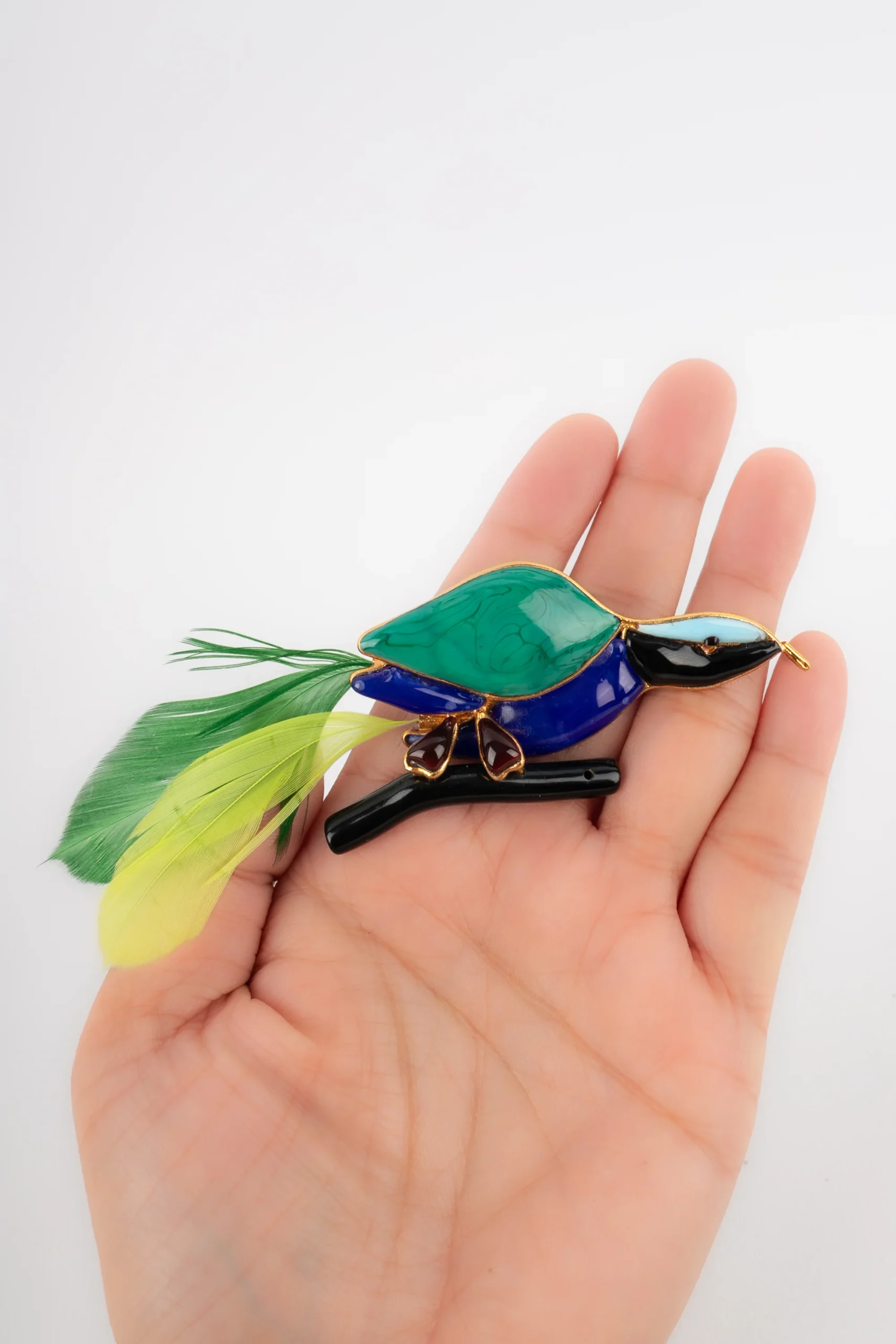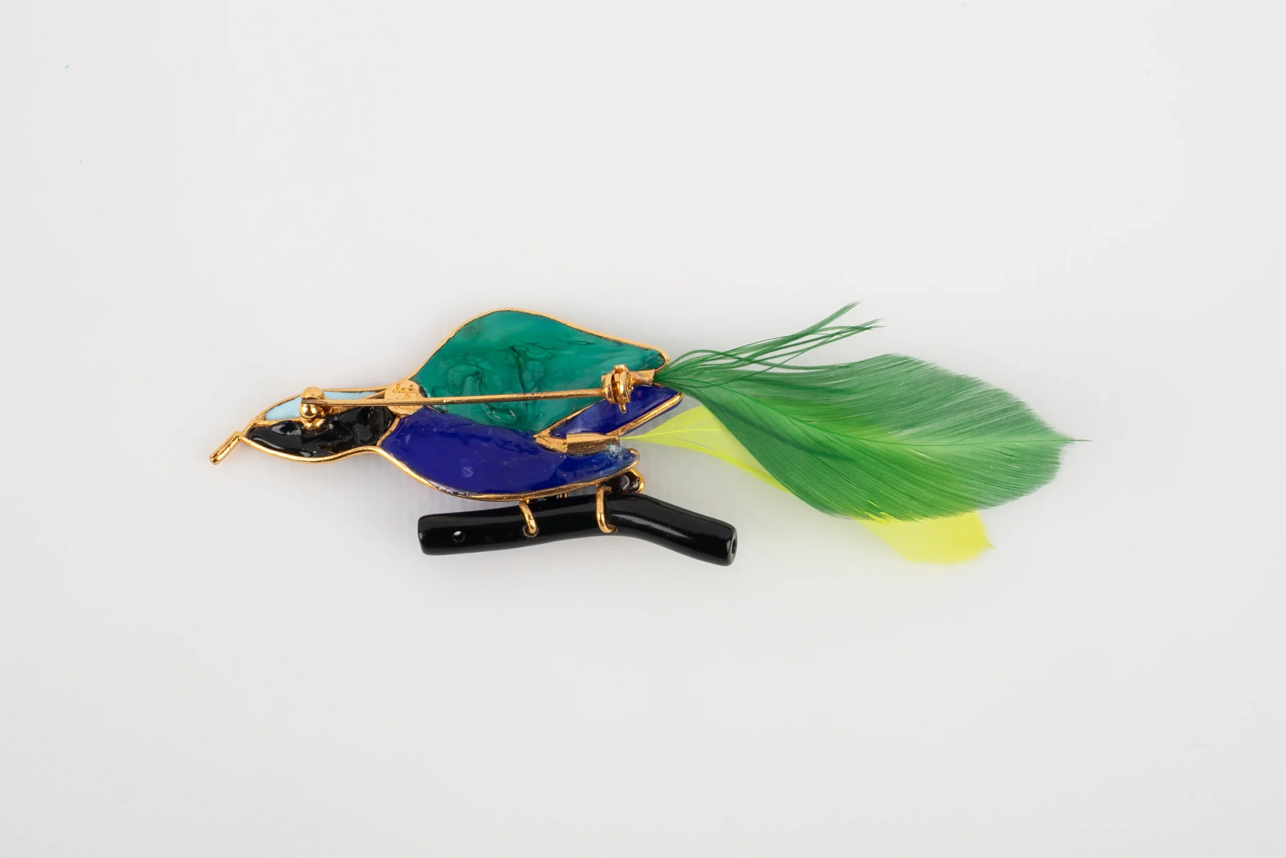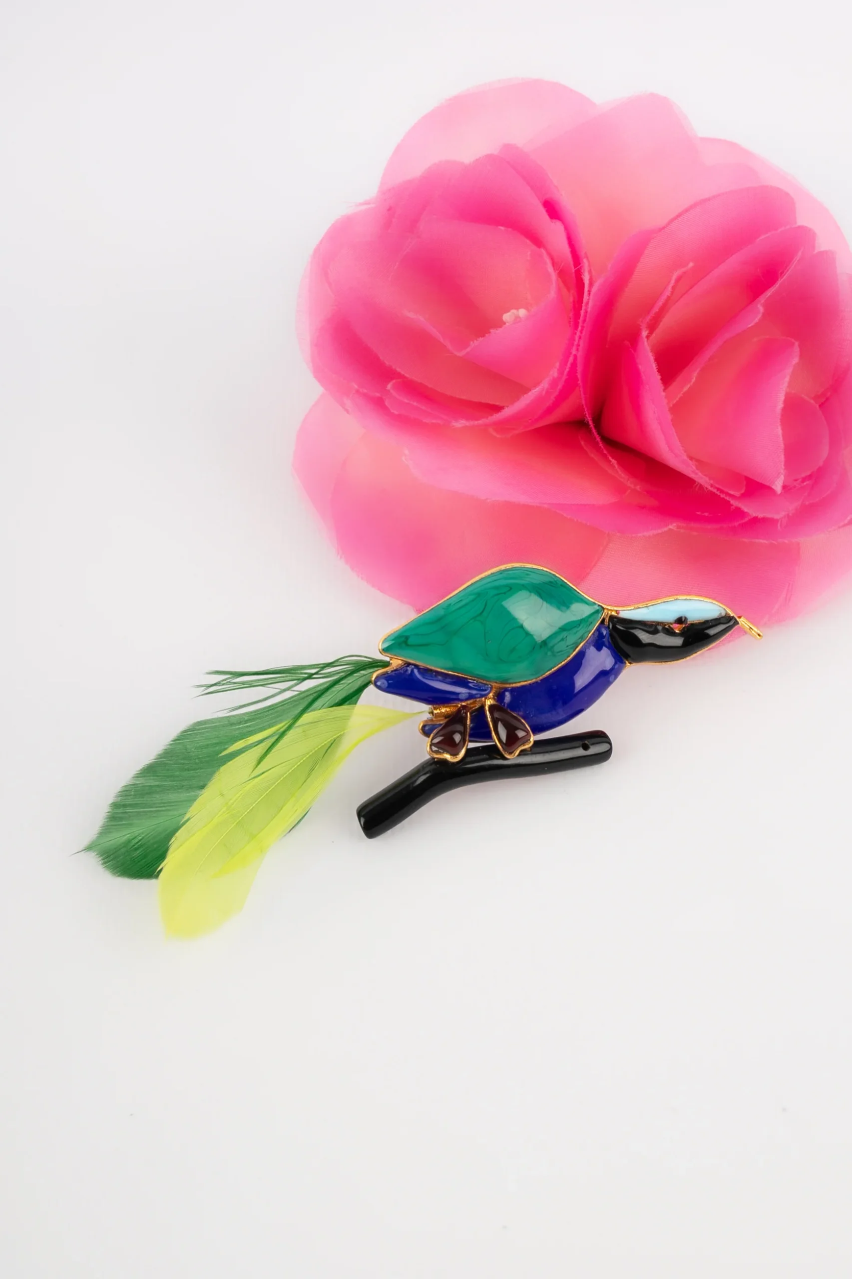 LOULOU DE LA FALAISE – (Made in France) Broche en métal doré, pâte de verre et plumes colorées figurant un oiseau.