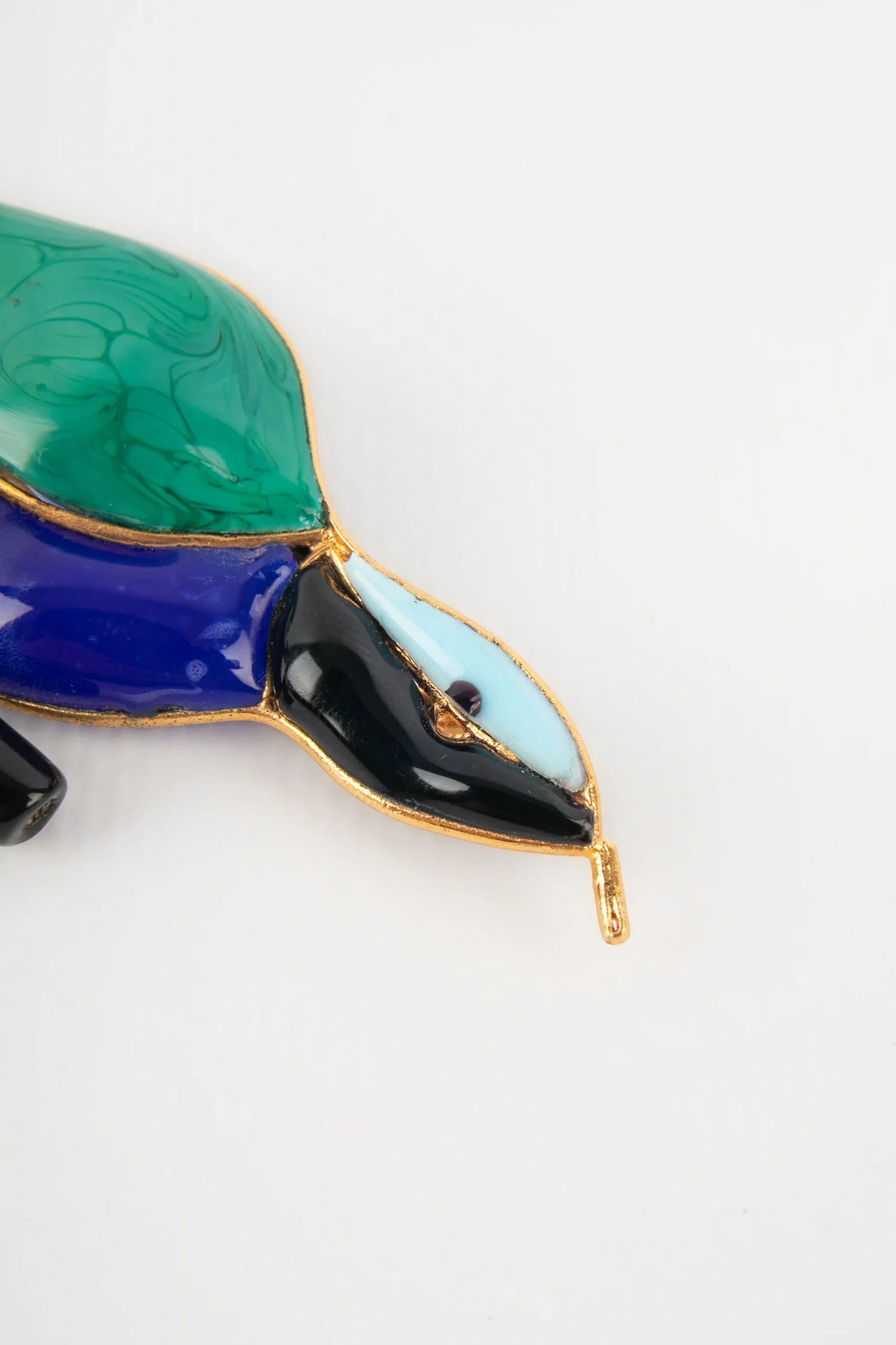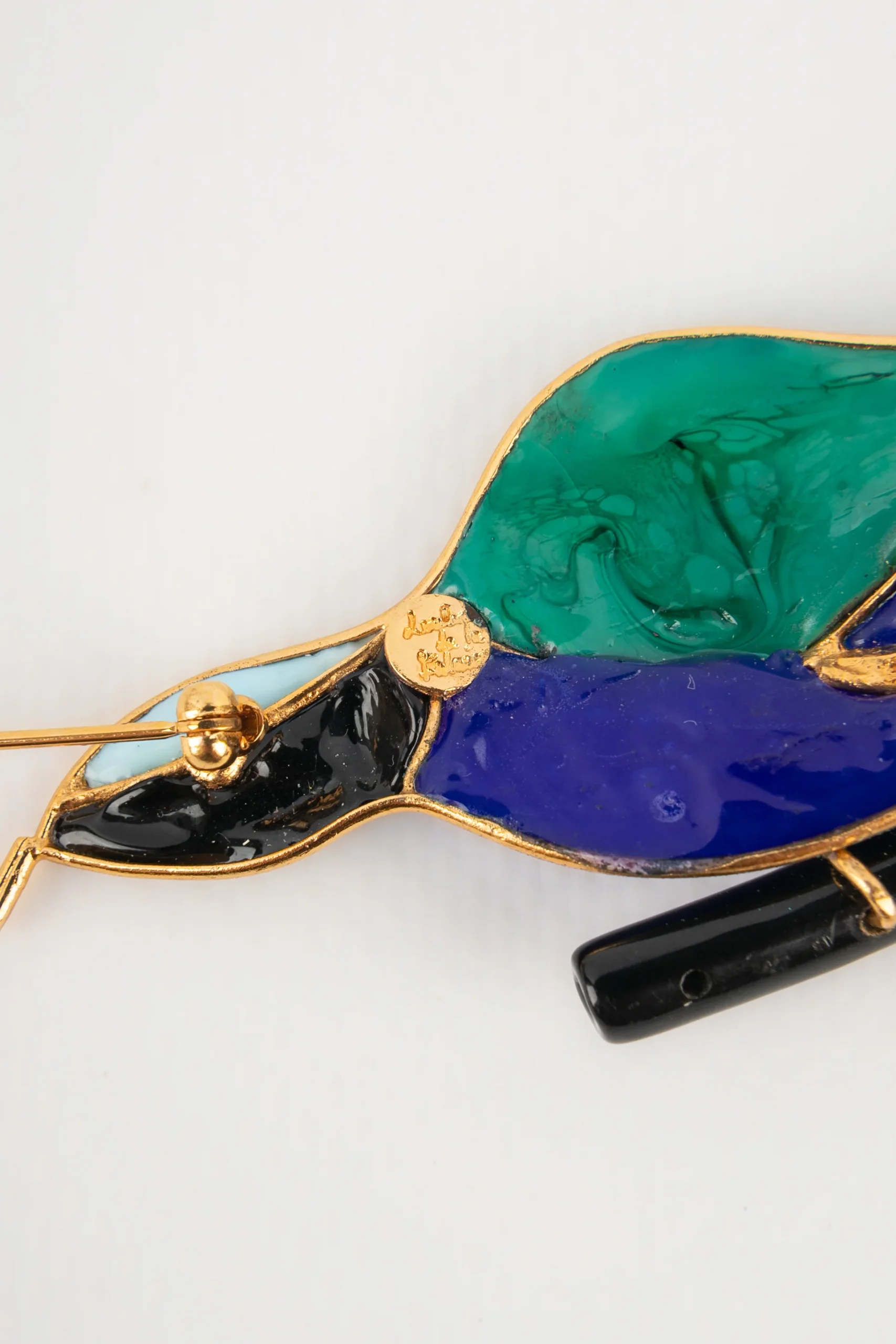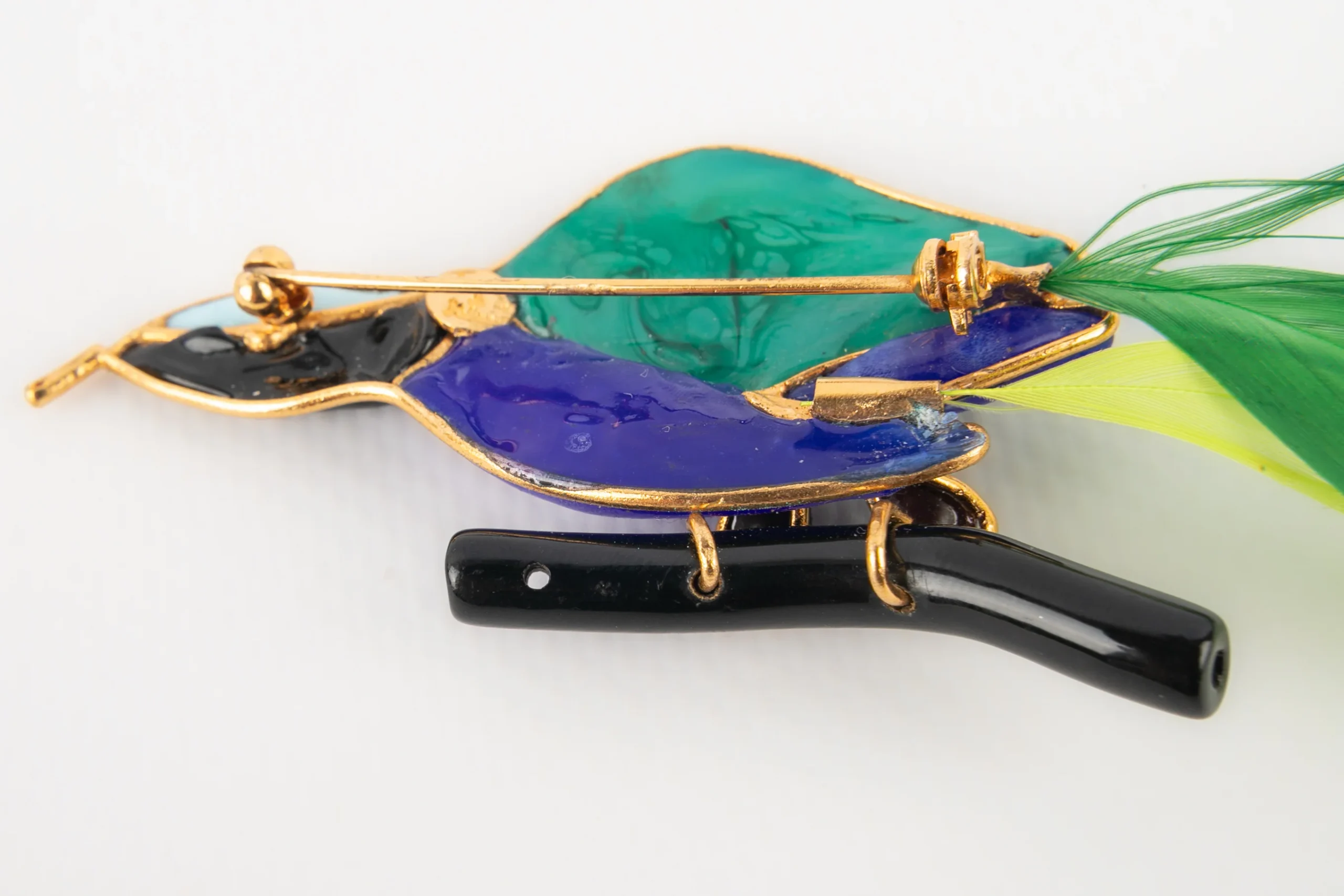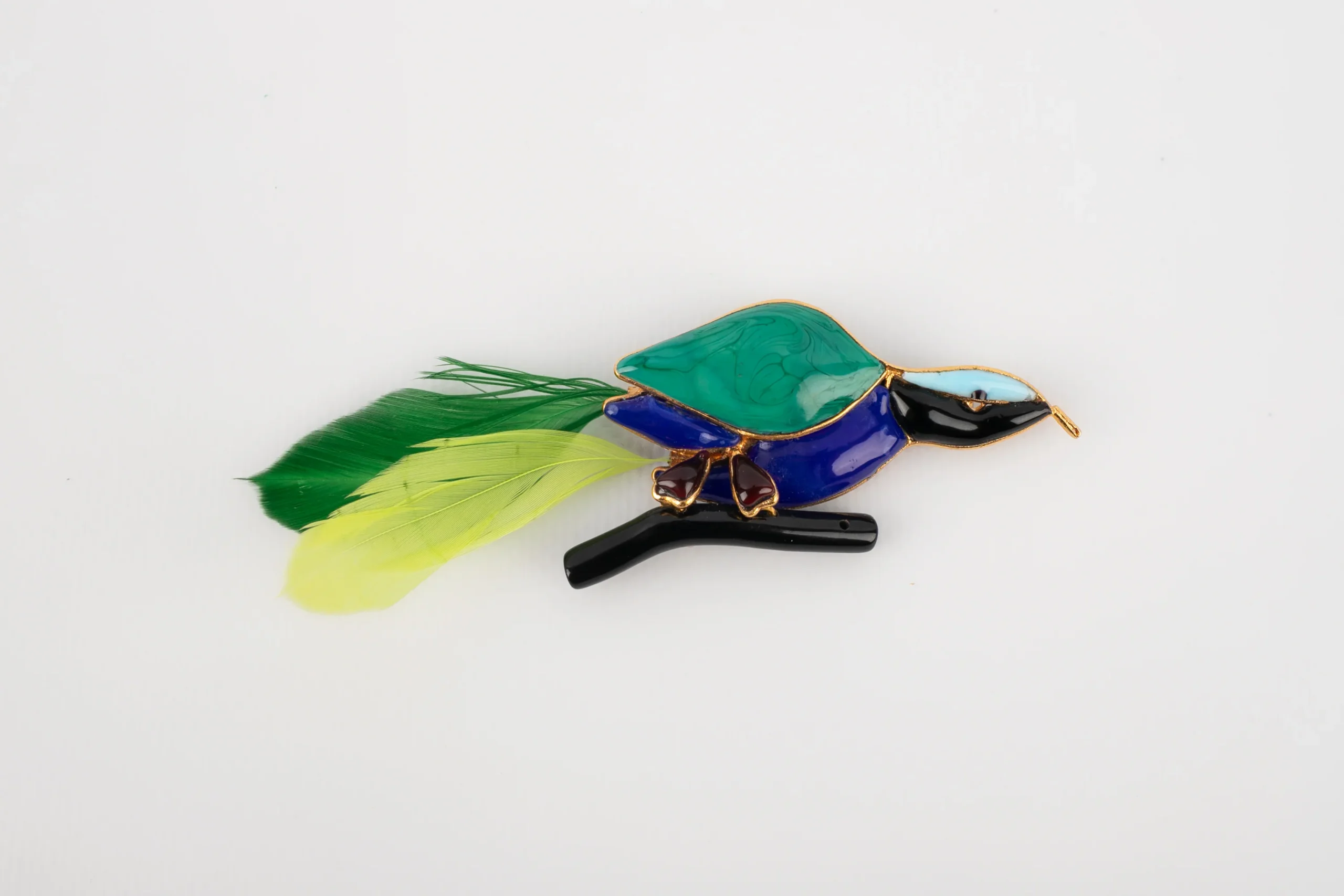 LOULOU DE LA FALAISE – (Made in France) Broche en métal doré, pâte de verre et plumes colorées figurant un oiseau.