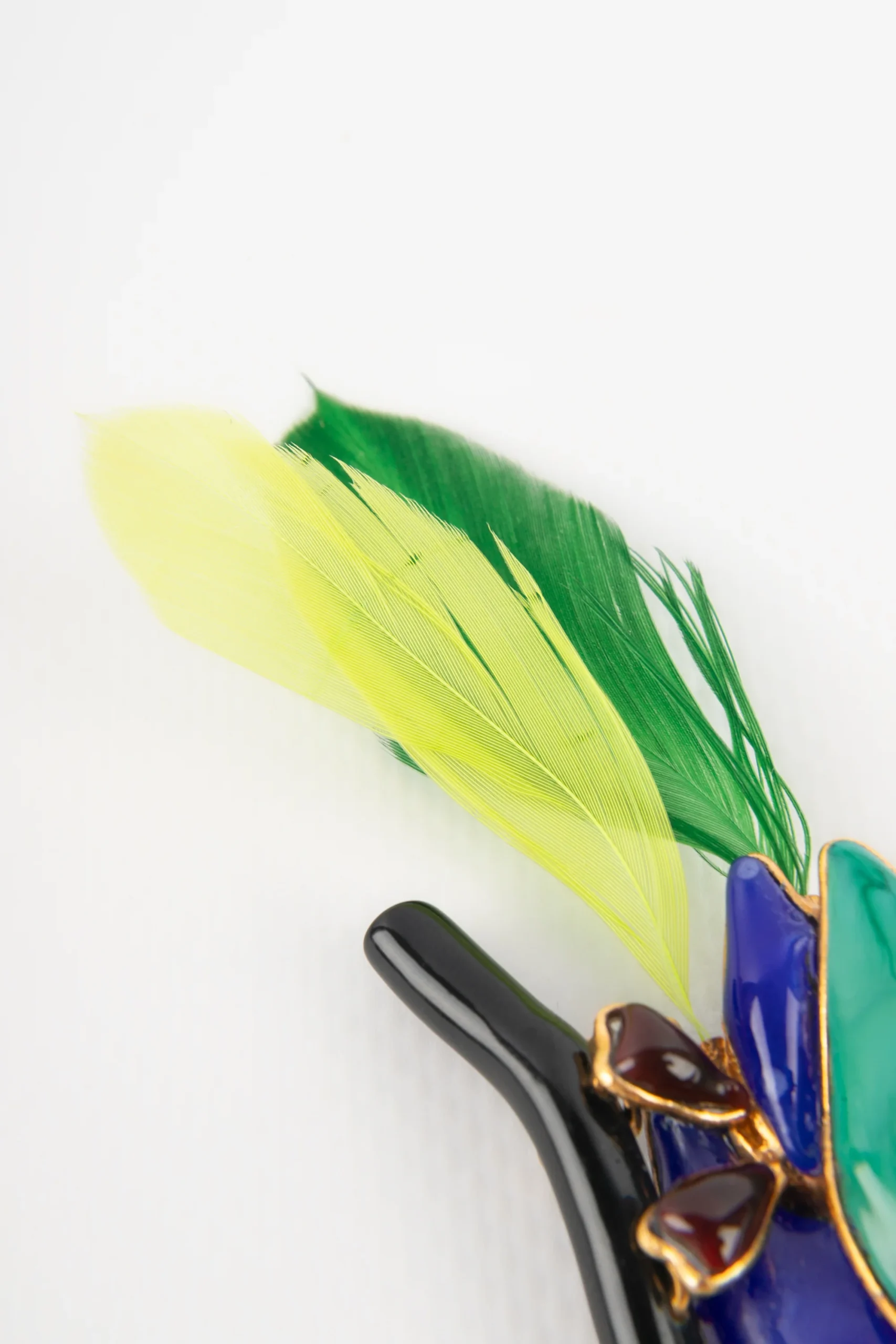 LOULOU DE LA FALAISE – (Made in France) Broche en métal doré, pâte de verre et plumes colorées figurant un oiseau. Condition : Très bon état Dimensions : 10 cm x 3 cm