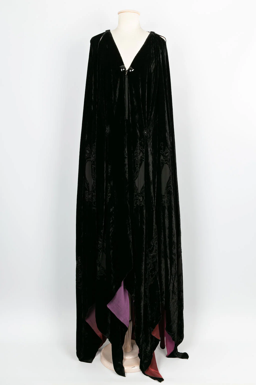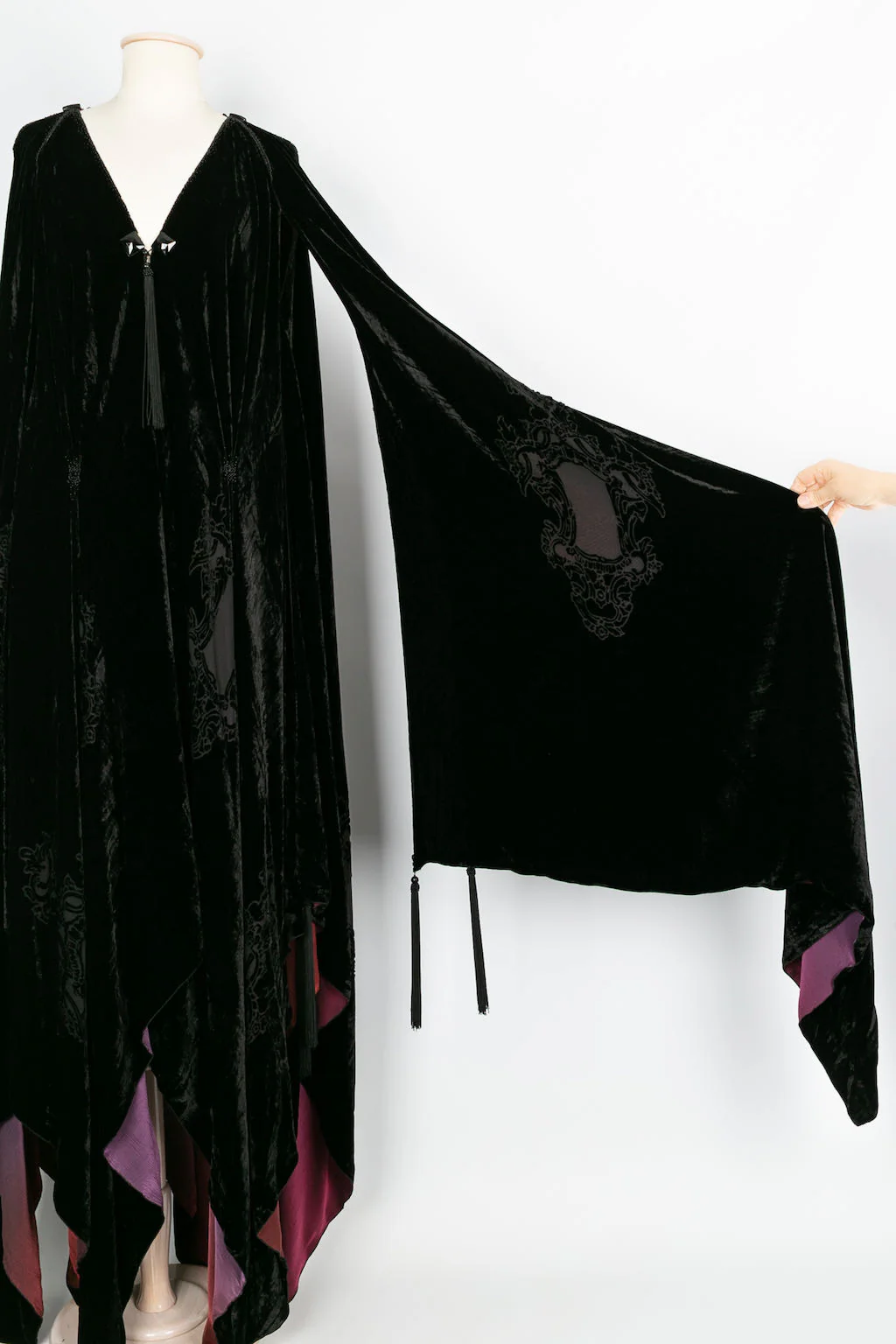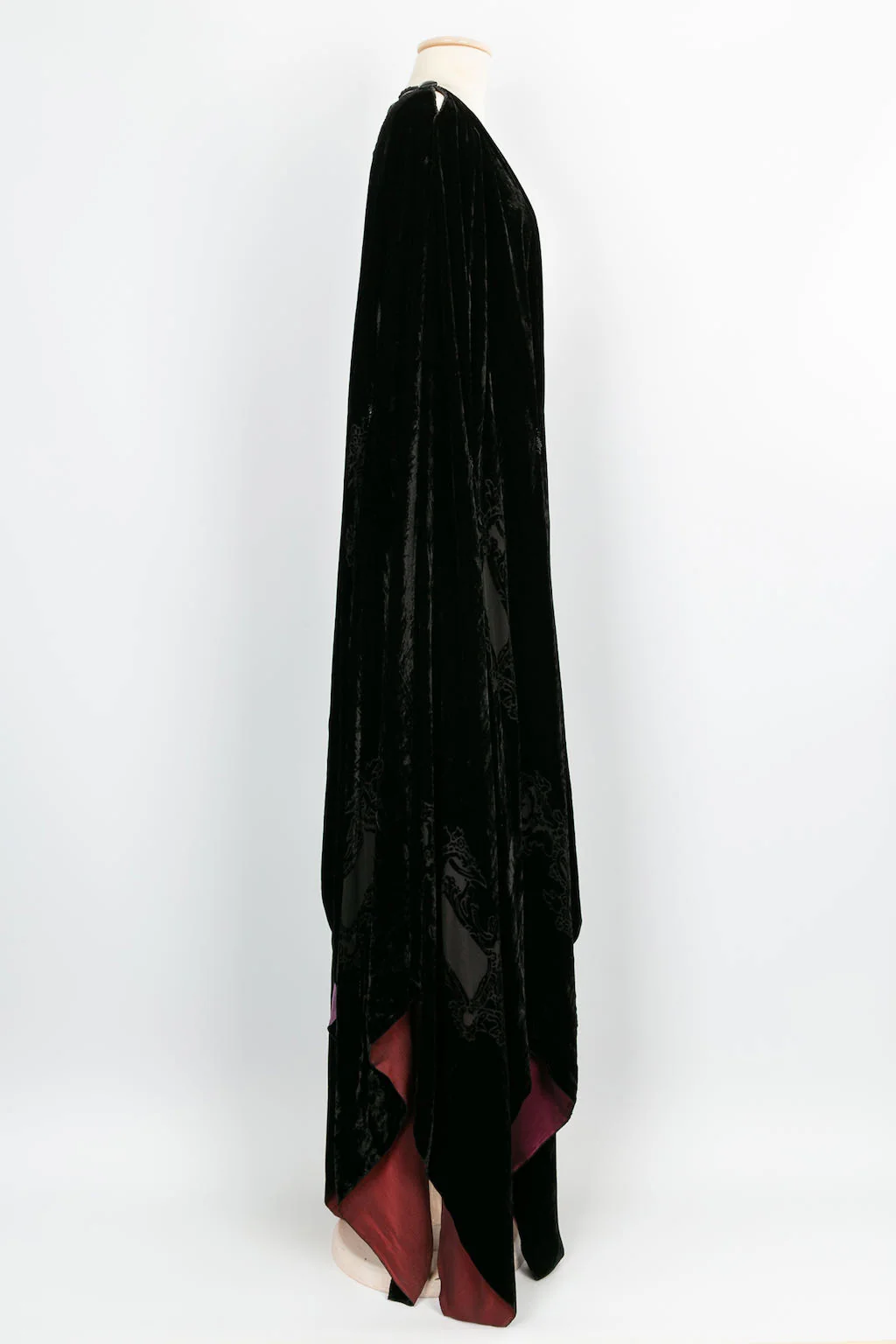 FRANCK SORBIER -Cape Haute Couture en panne de velours et velours dévoré, agrémentée de passementerie et de perles noires. Doublure en soie. Pas d’étiquette de composition ou de taille indiquée, elle correspond à un 36FR/38FR.