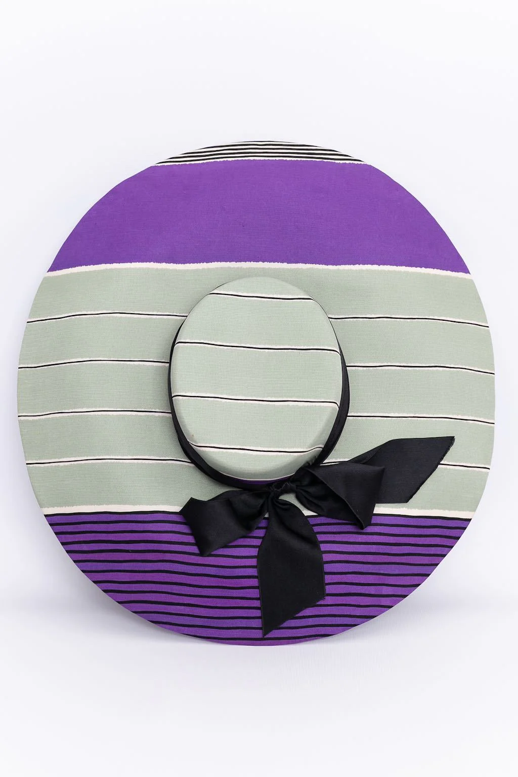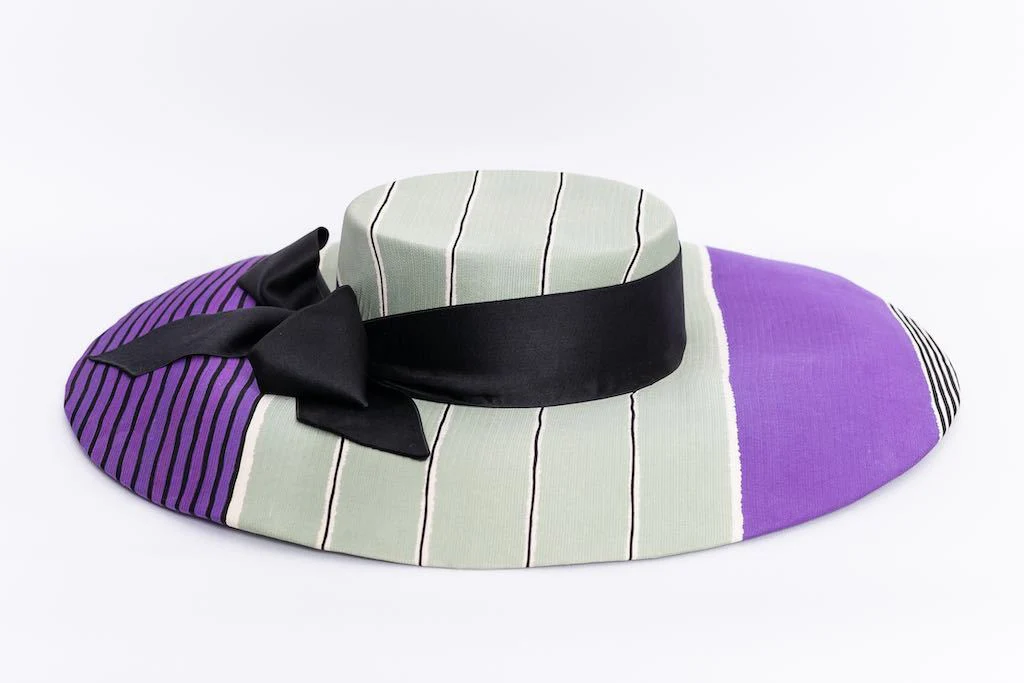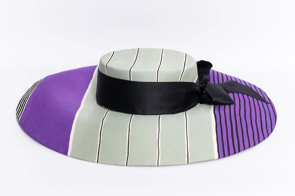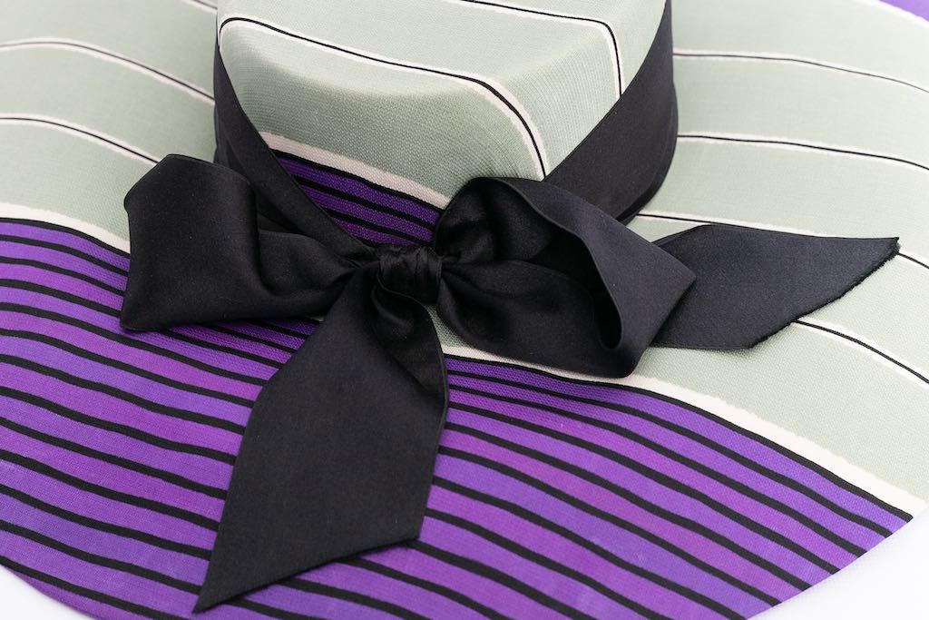 GIVENCHY (Made in France) Chapeau de défilé en soie rayée vert d’eau, violet, noir et blanc décoré d’un ruban noir.