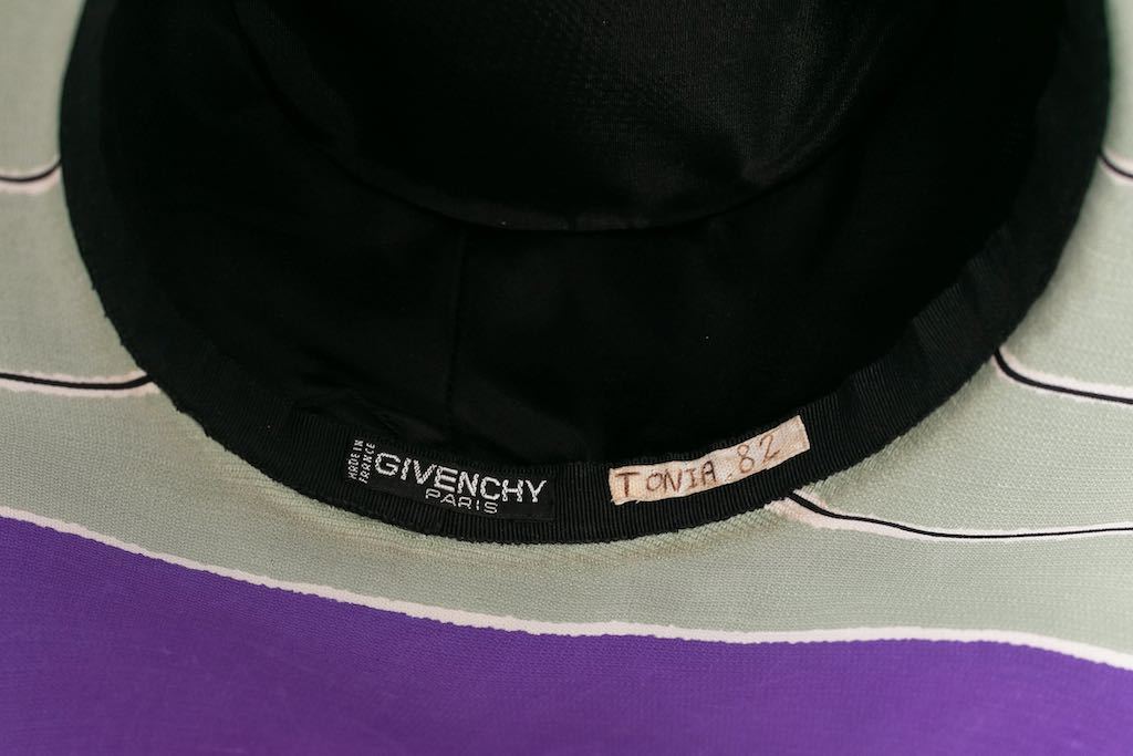 GIVENCHY (Made in France) Chapeau de défilé en soie rayée vert d’eau, violet, noir et blanc décoré d’un ruban noir. Etat :Très bon état Dimensions :Tour de tête : 52 cm – Hauteur : 8 cm – Largeur du bord : 17 cm