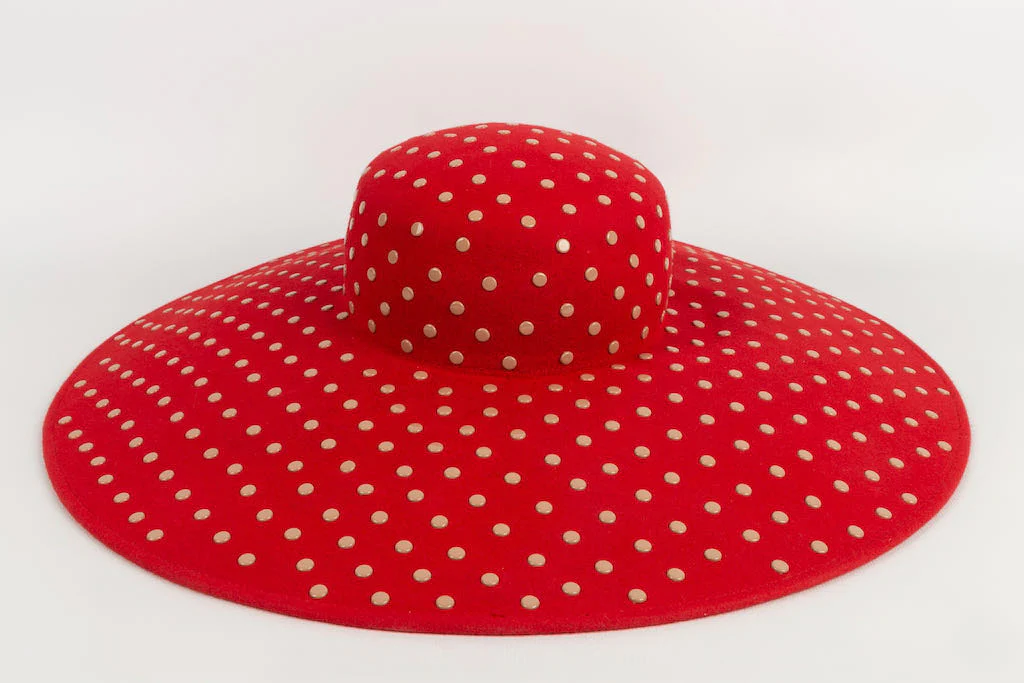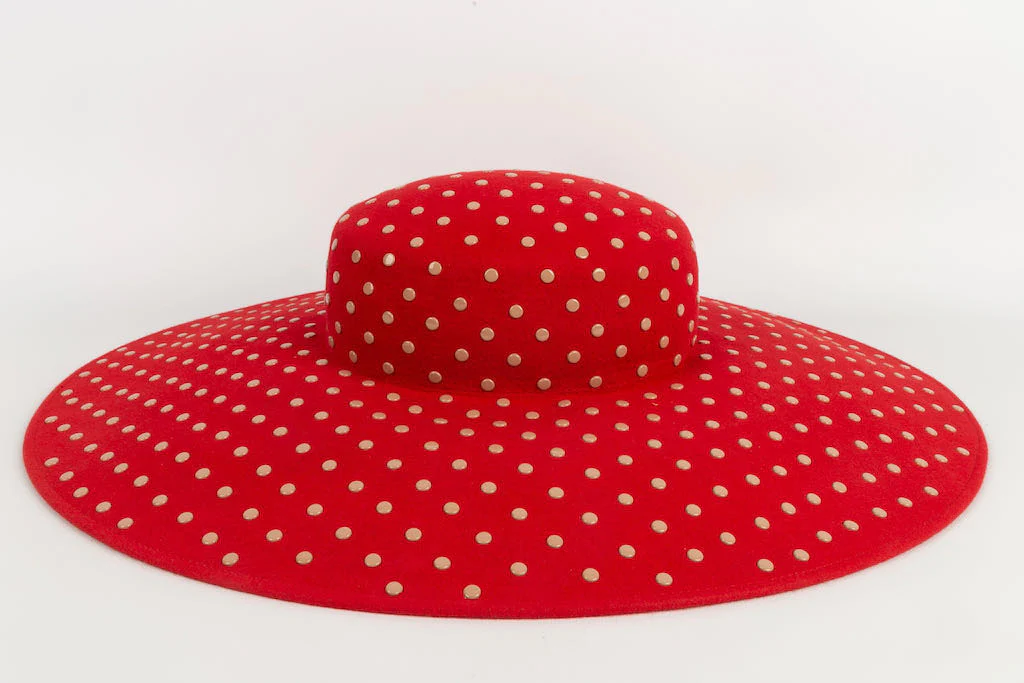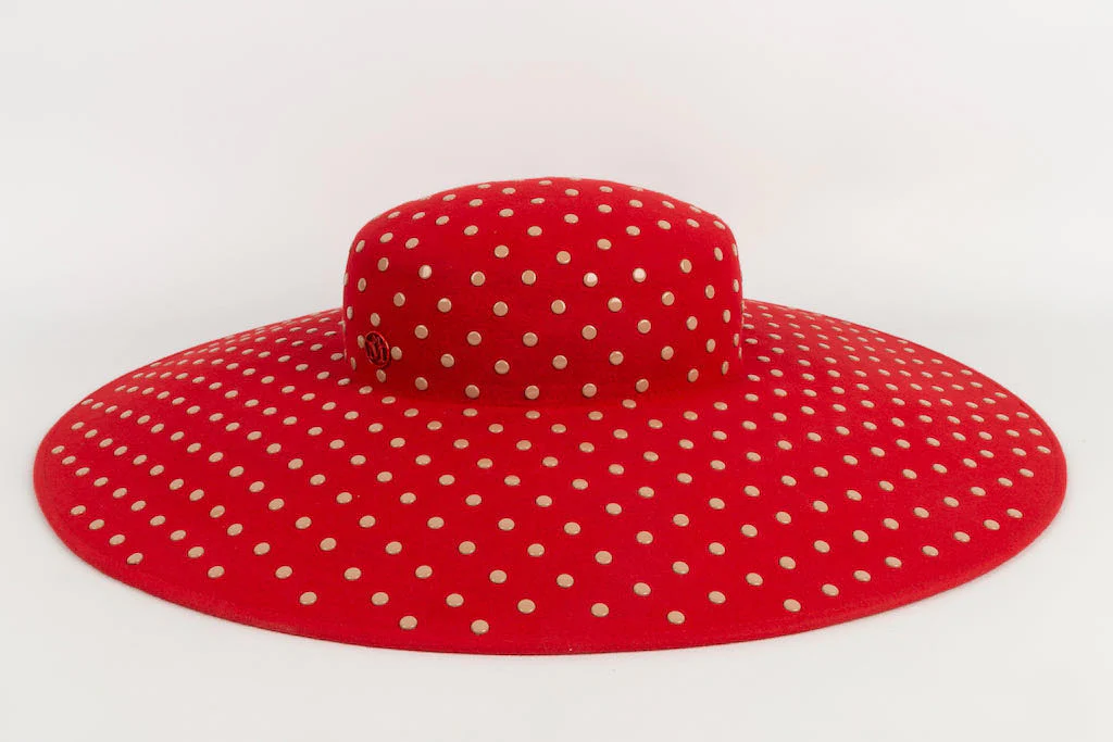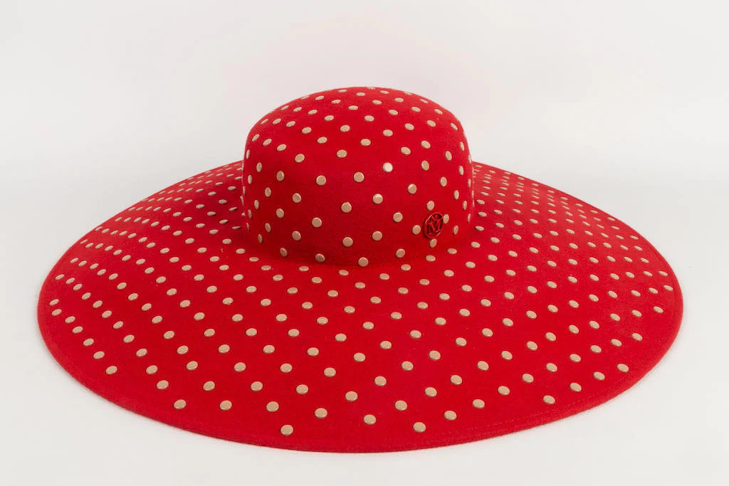 MAISON MICHEL -(Made in France) Capeline en feutre rouge décorée de pois en métal beige. Taille indiquée M. Condition : Très bon état Dimensions : Tour de tête : 55 cm