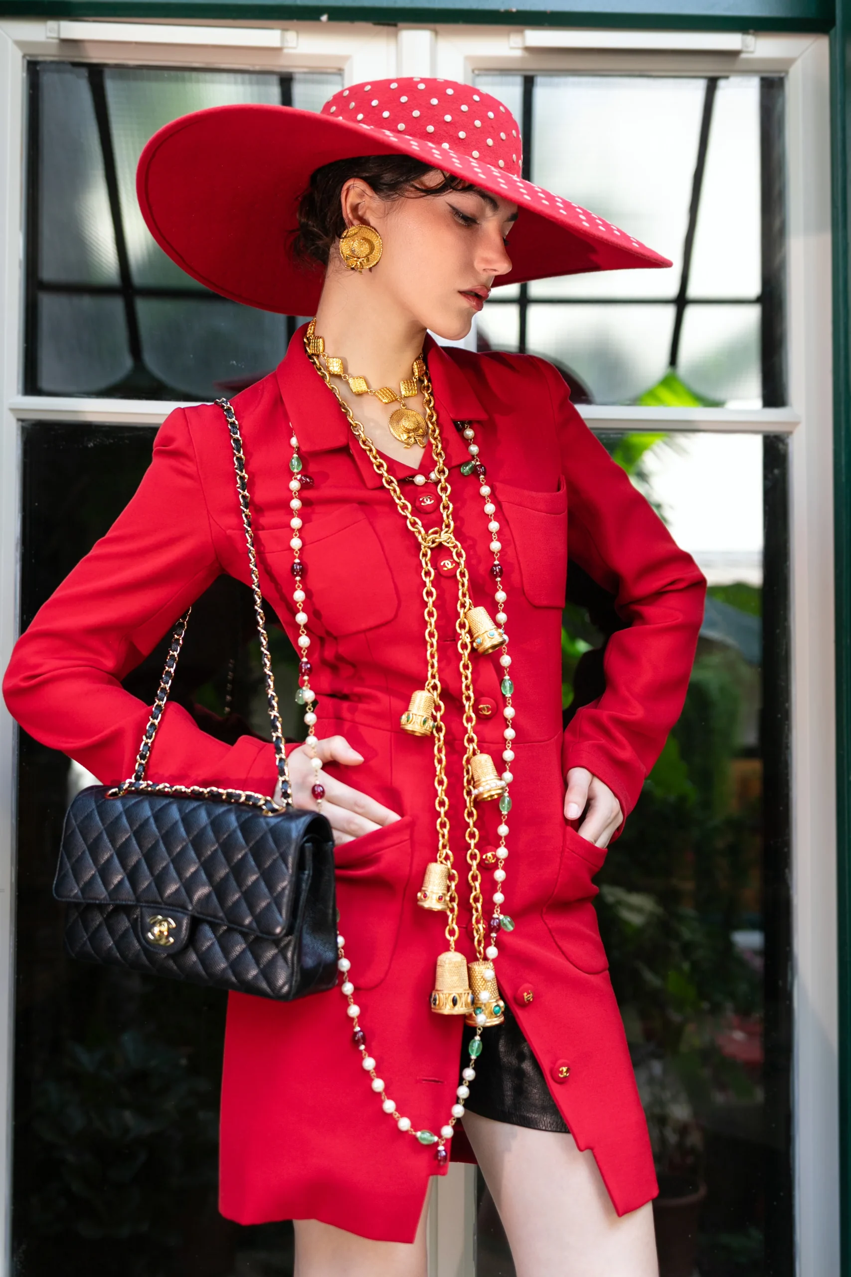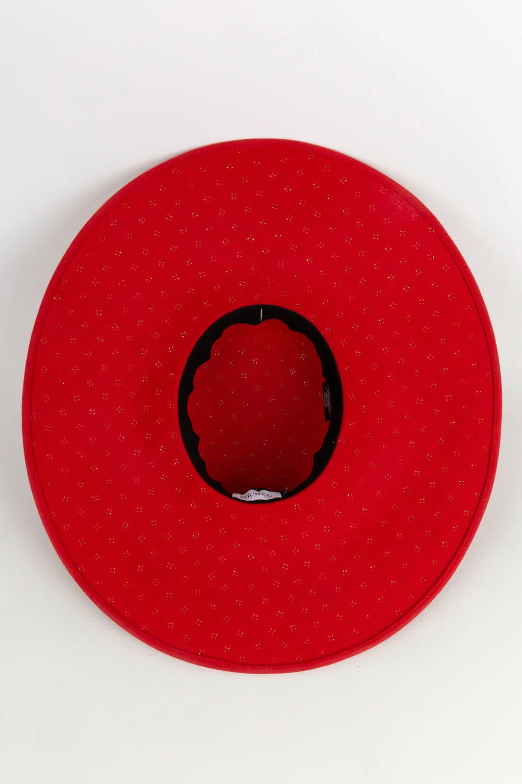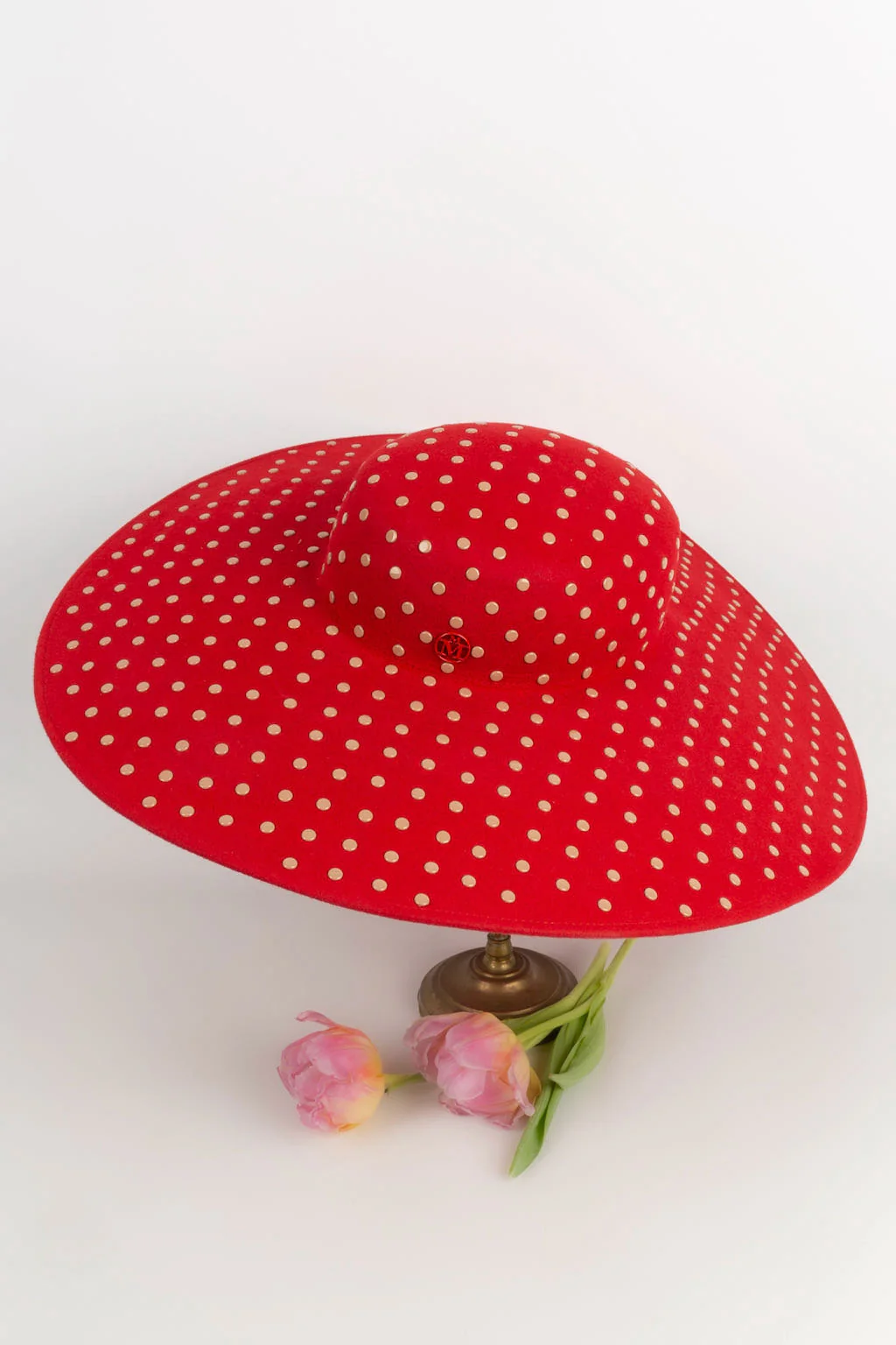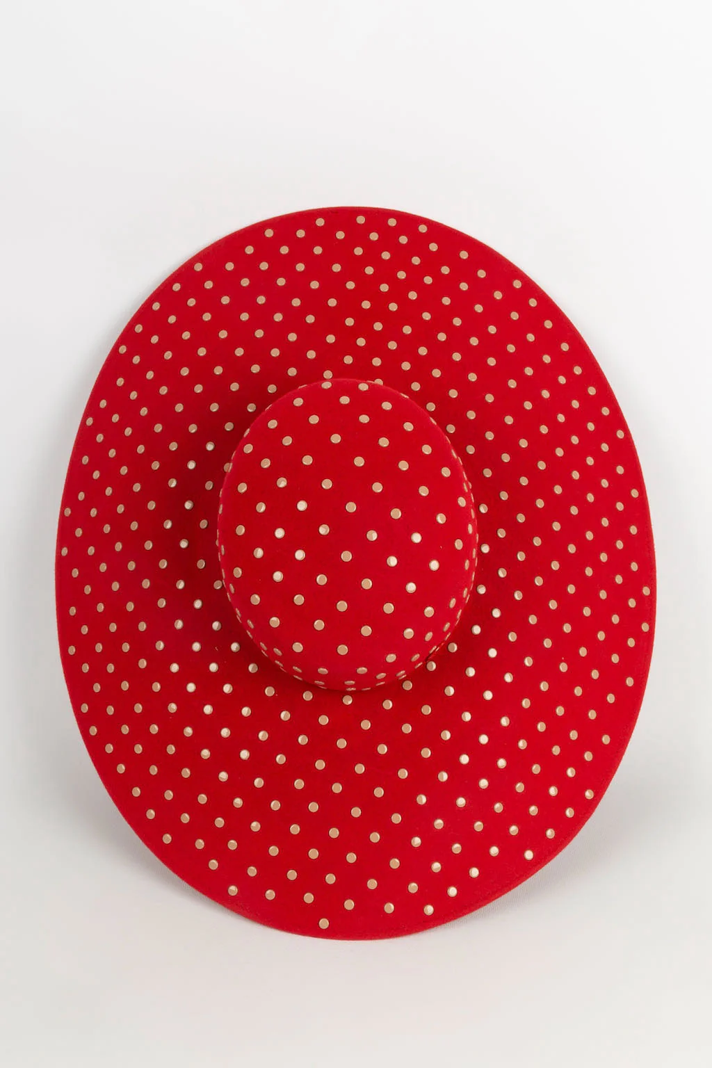 MAISON MICHEL -(Made in France) Capeline en feutre rouge décorée de pois en métal beige.