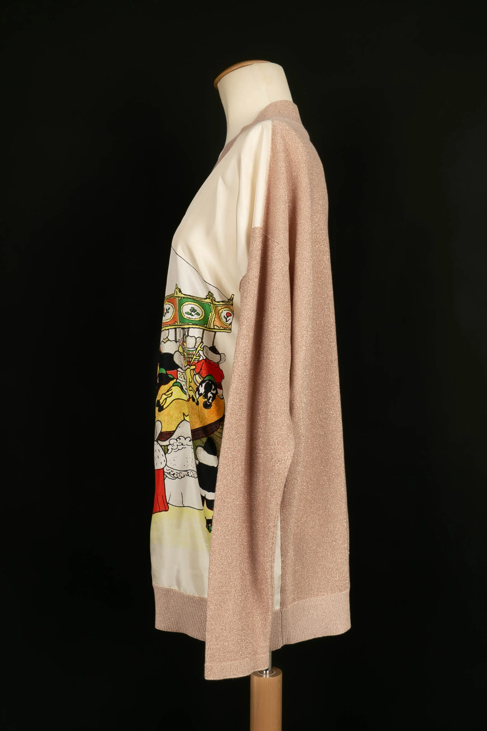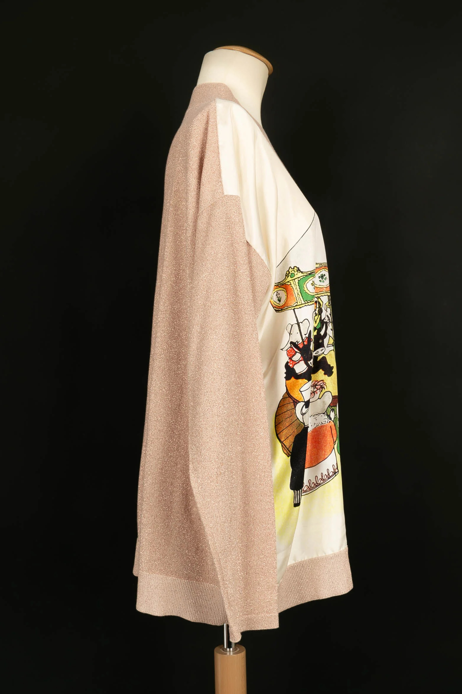 LANVIN -(Made in Italy) Top à manches longues en coton rose pâle et tissu en soie imprimé du motif « Babar ». Collection Automne-Hiver 2019. Pas de taille indiquée, il correspond à un 38/40FR.