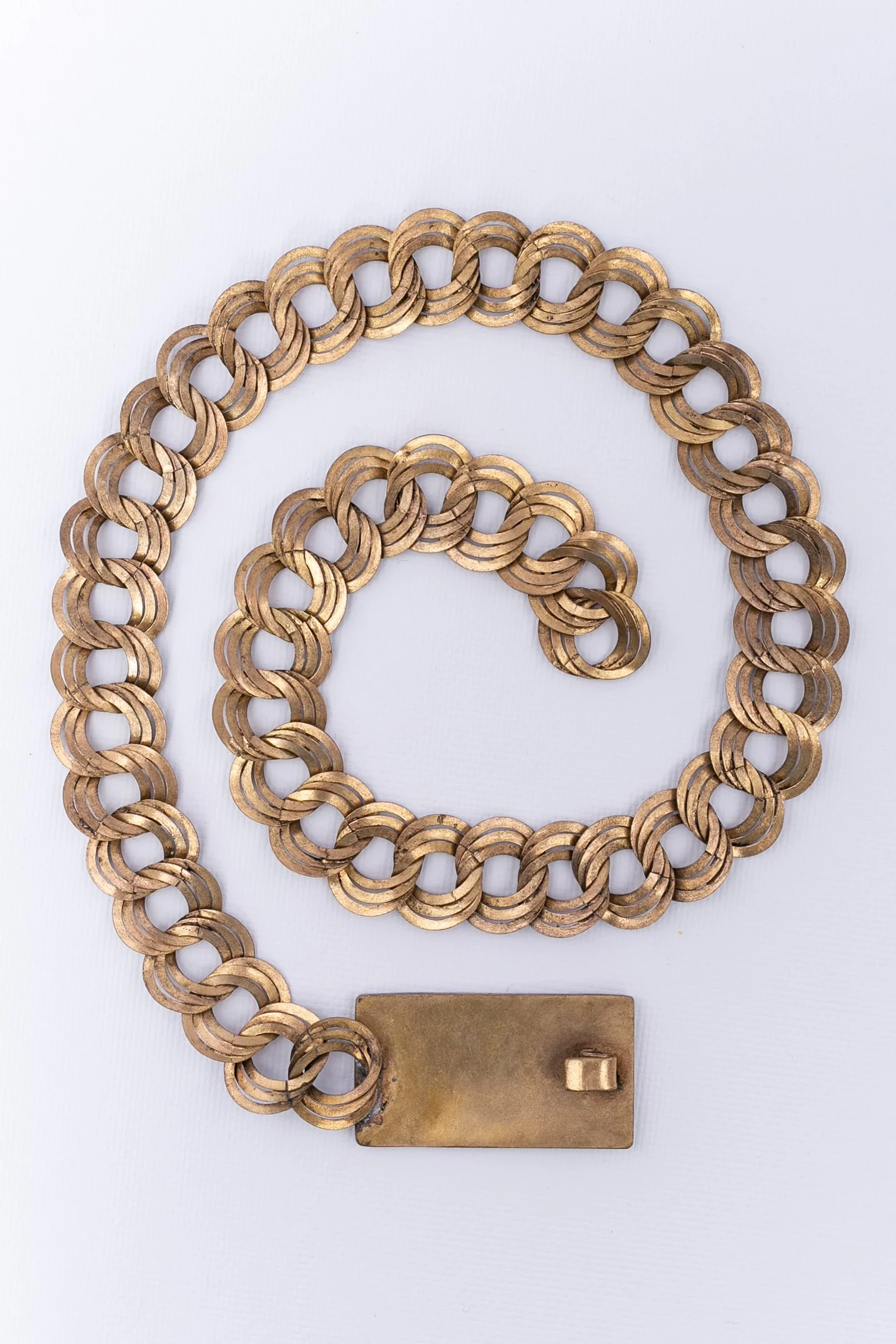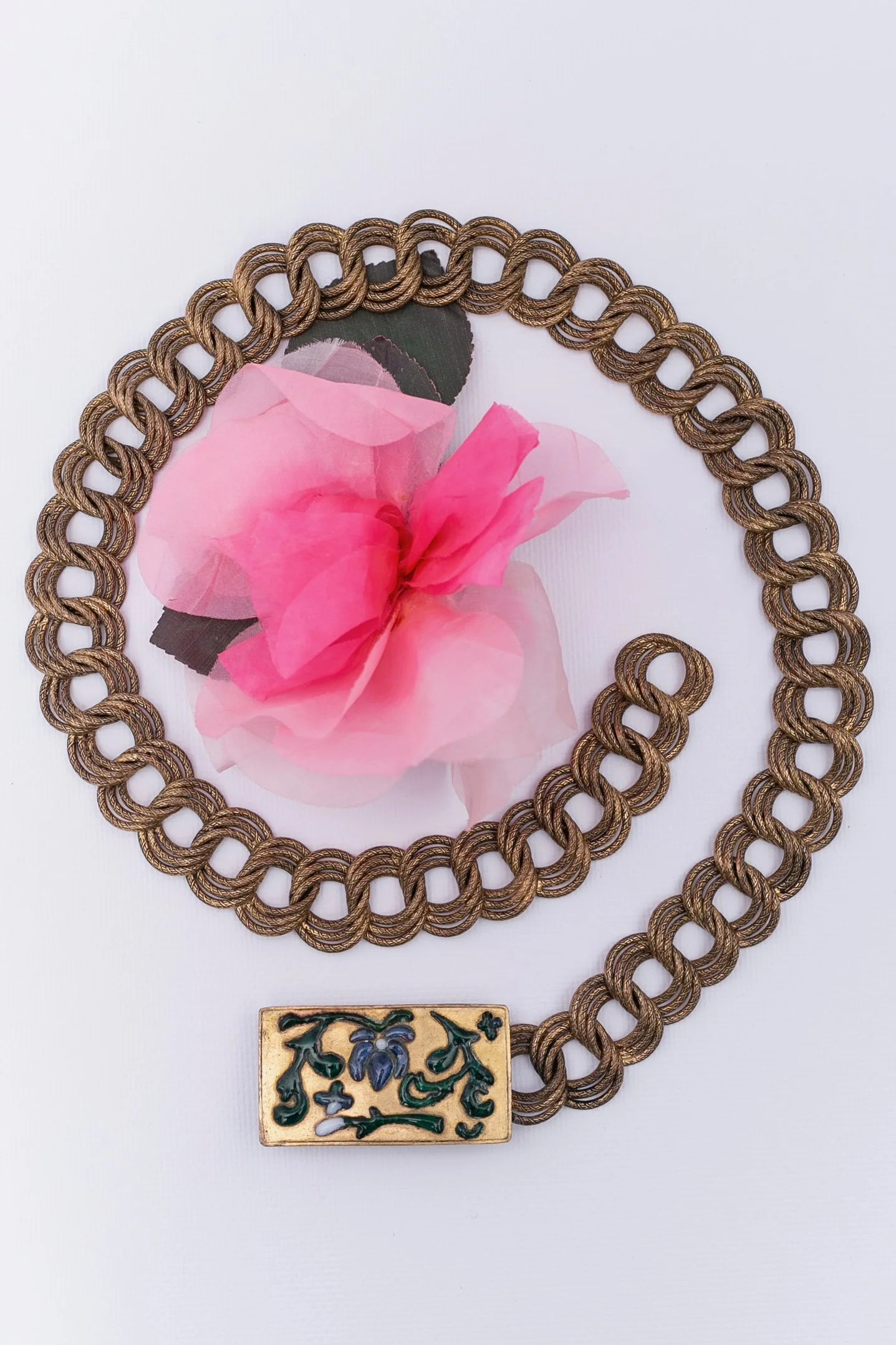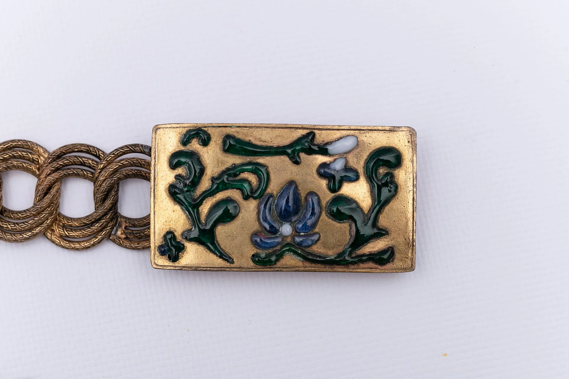 ANONYME – Ceinture en métal doré et boucle ornée de motifs en pâte de verre bleu et vert. Non signée, elle date des années 1930. Travail des ateliers Gripoix, probablement pour la maison Chanel.