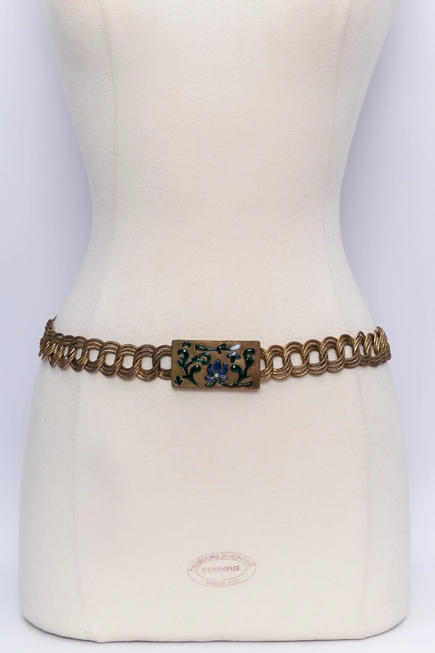 ANONYME – Ceinture en métal doré et boucle ornée de motifs en pâte de verre bleu et vert. Non signée, elle date des années 1930. Travail des ateliers Gripoix, probablement pour la maison Chanel. Etat :Bon état Dimensions :Longueur : 74 cm