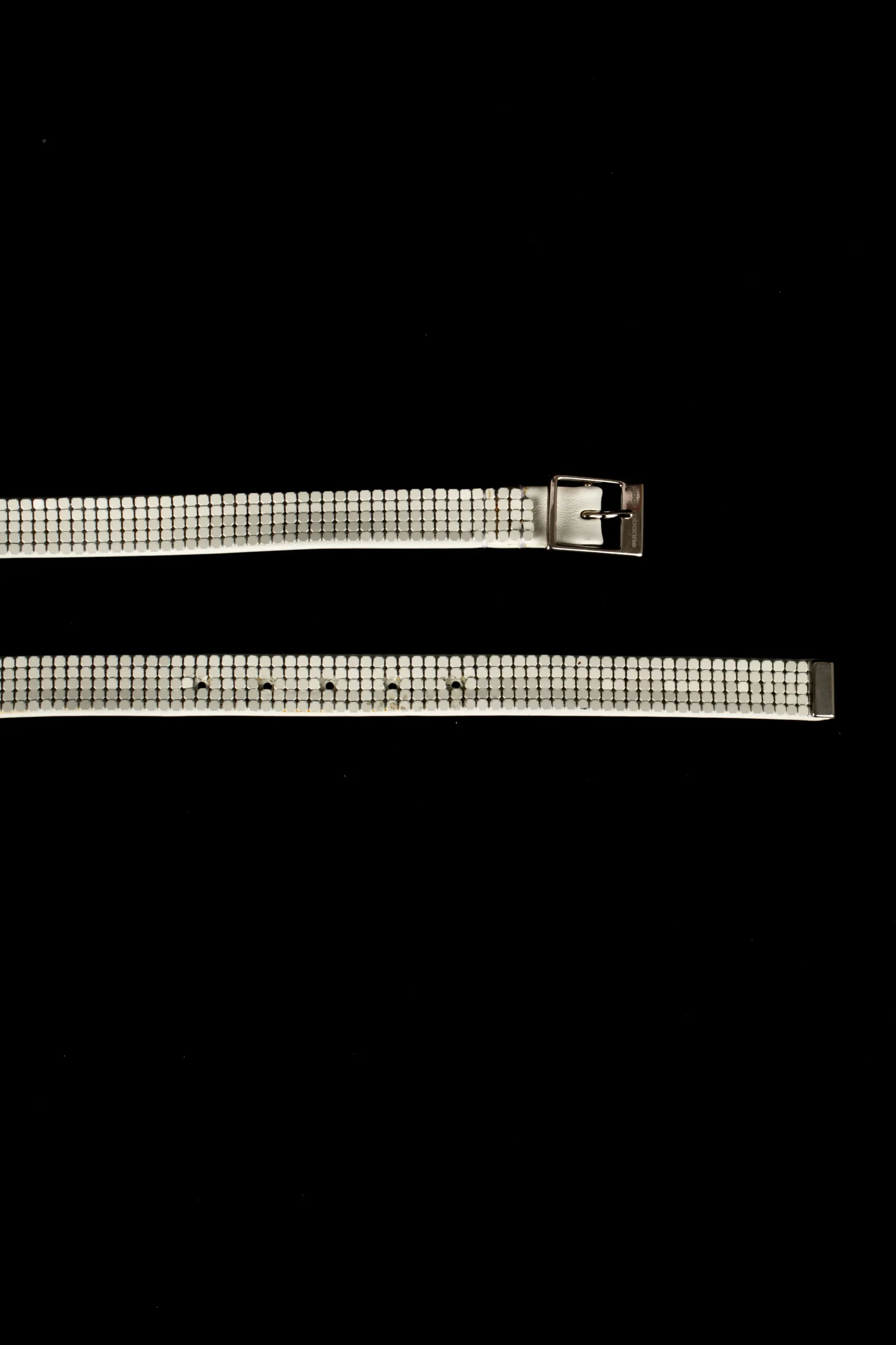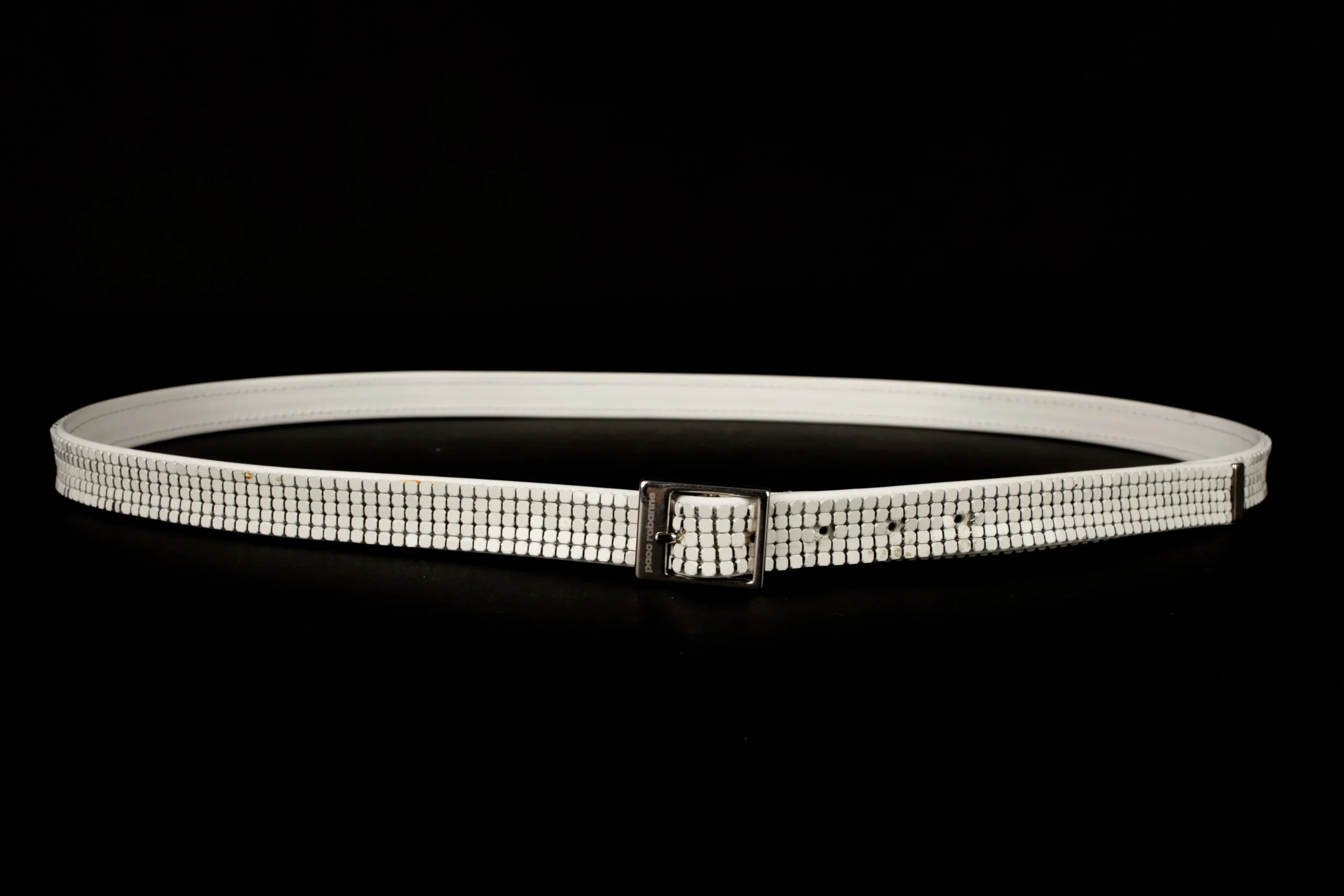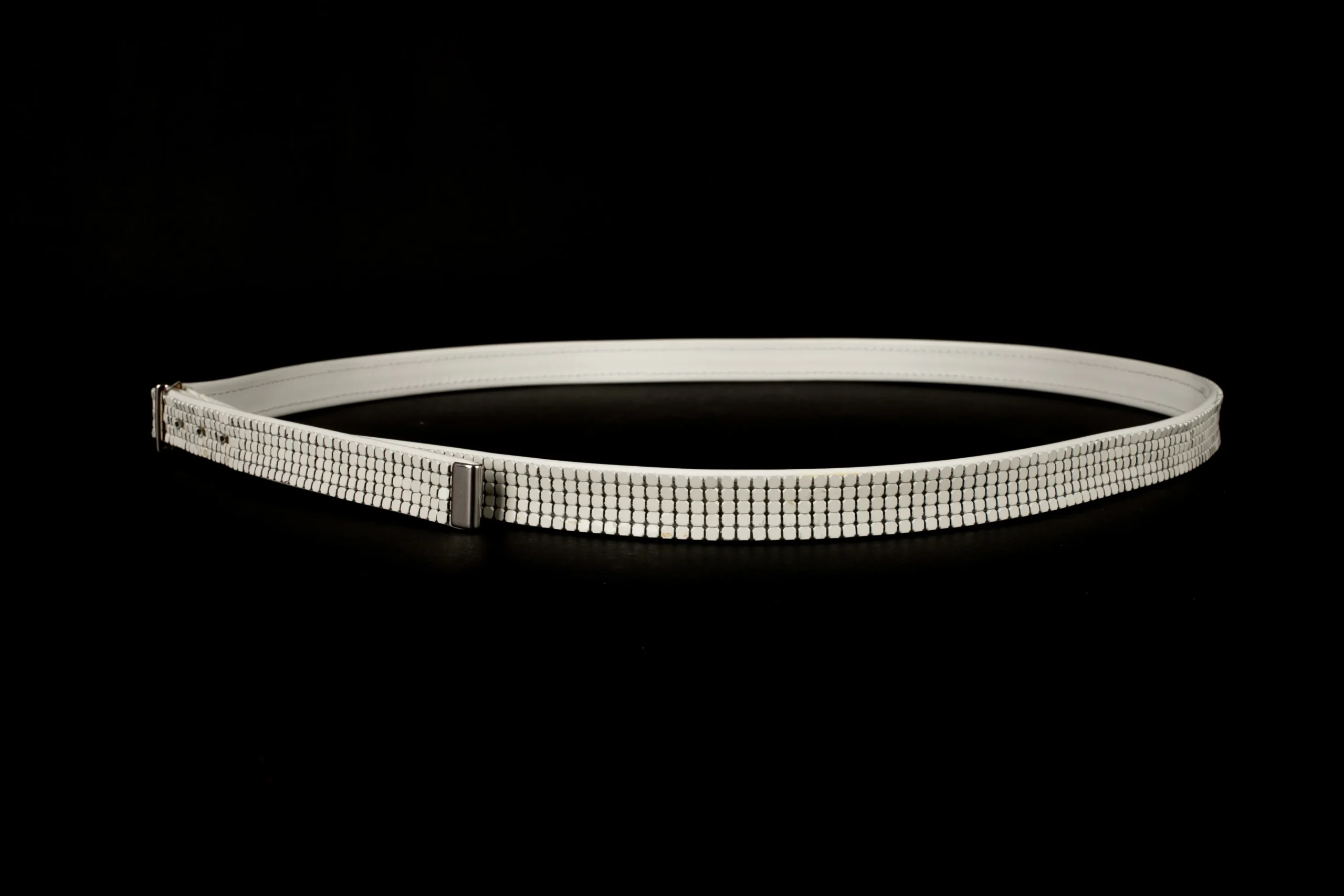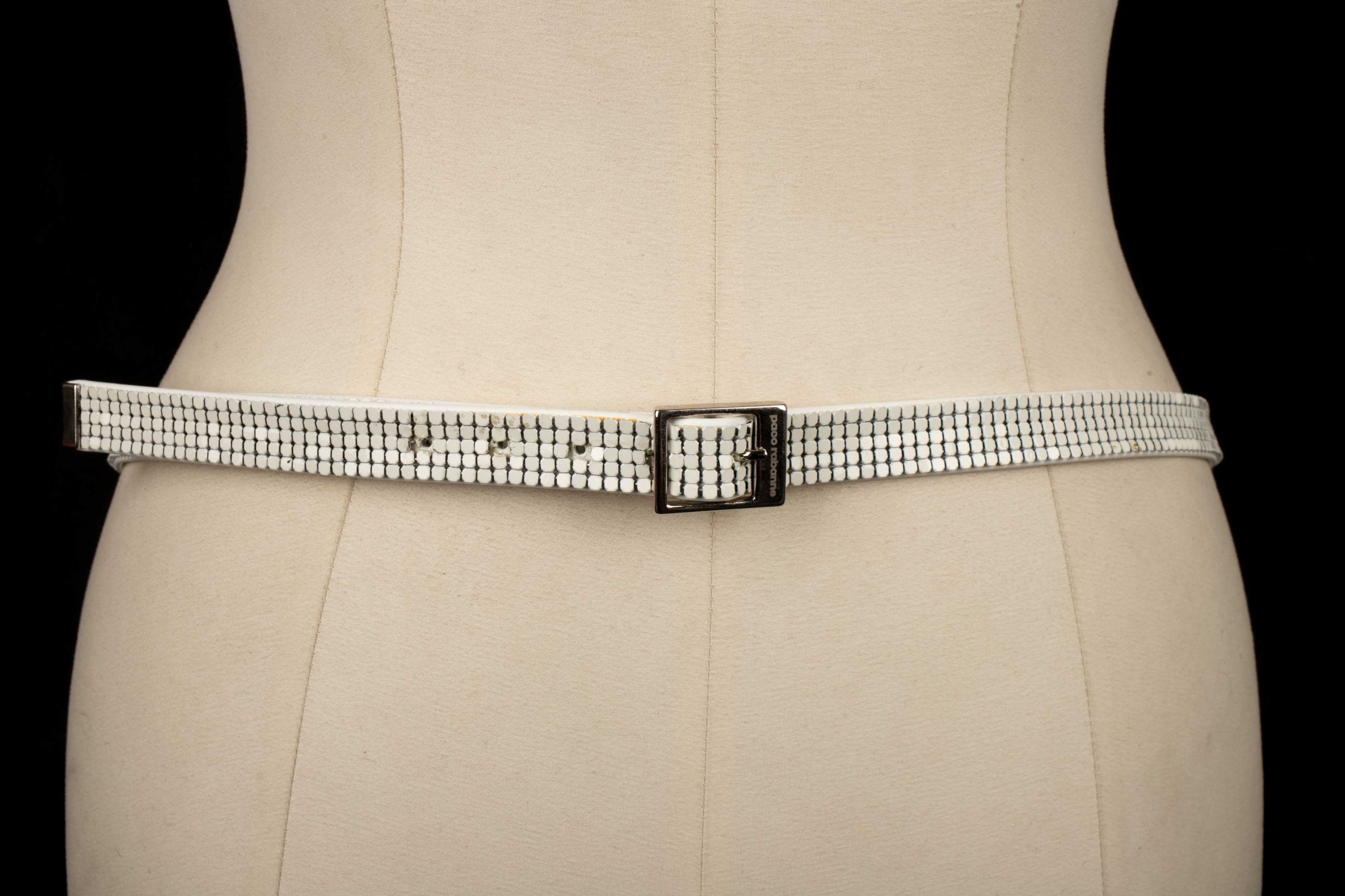 PACO RABANNE -Ceinture en cuir et métal doré dans les tons de blanc. Condition : Bon état Dimensions : Longueur totale : 98 cm