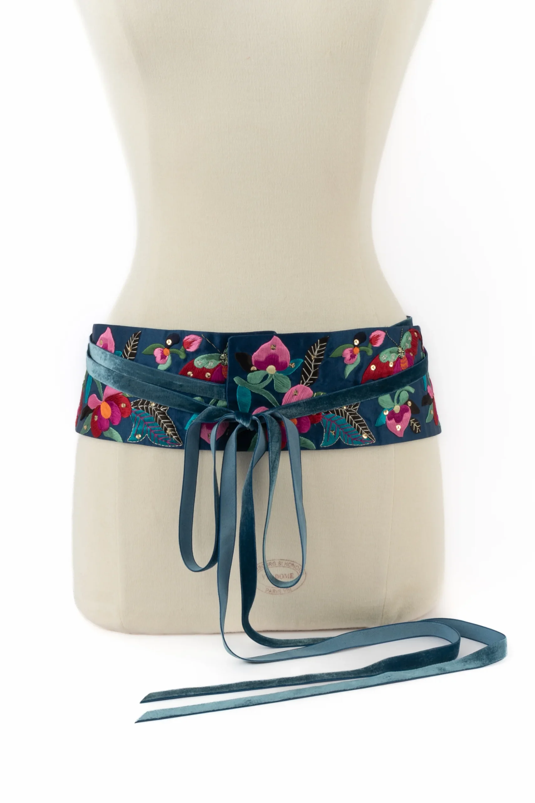 GALLIANO – Ceinture large en soie bleue brodées de fleurs. Accessoire non signé -collection « Esquimaux » Automne-Hiver 2002-2003. Condition : Très bon état Dimensions : Longueur sans les rubans : 78 cm