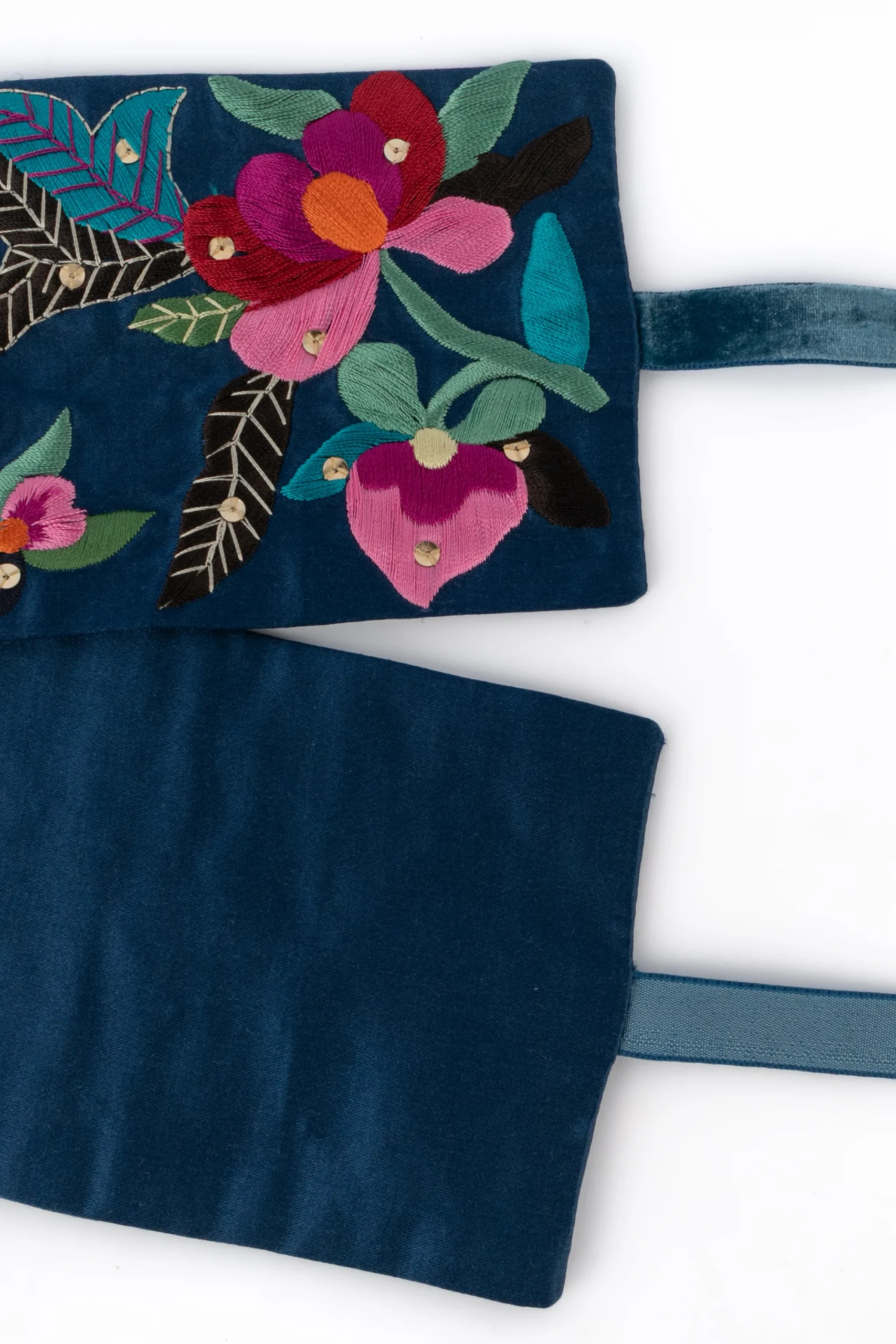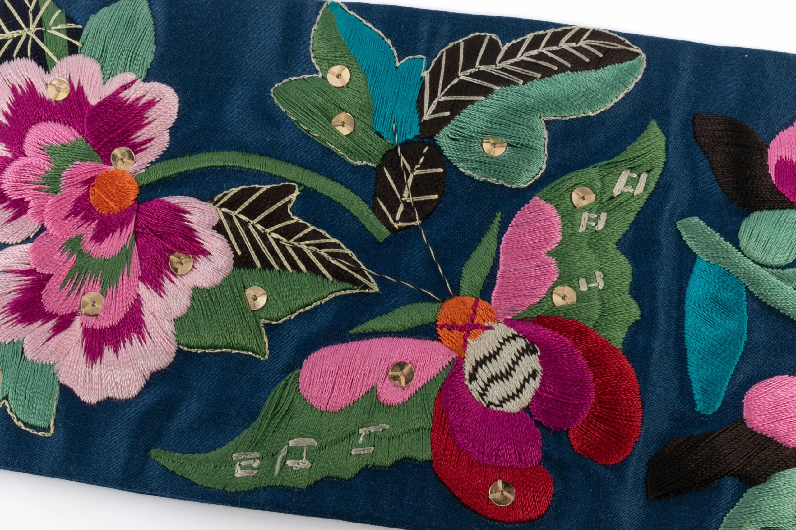 GALLIANO – Ceinture large en soie bleue brodées de fleurs. Accessoire non signé -collection « Esquimaux » Automne-Hiver 2002-2003.