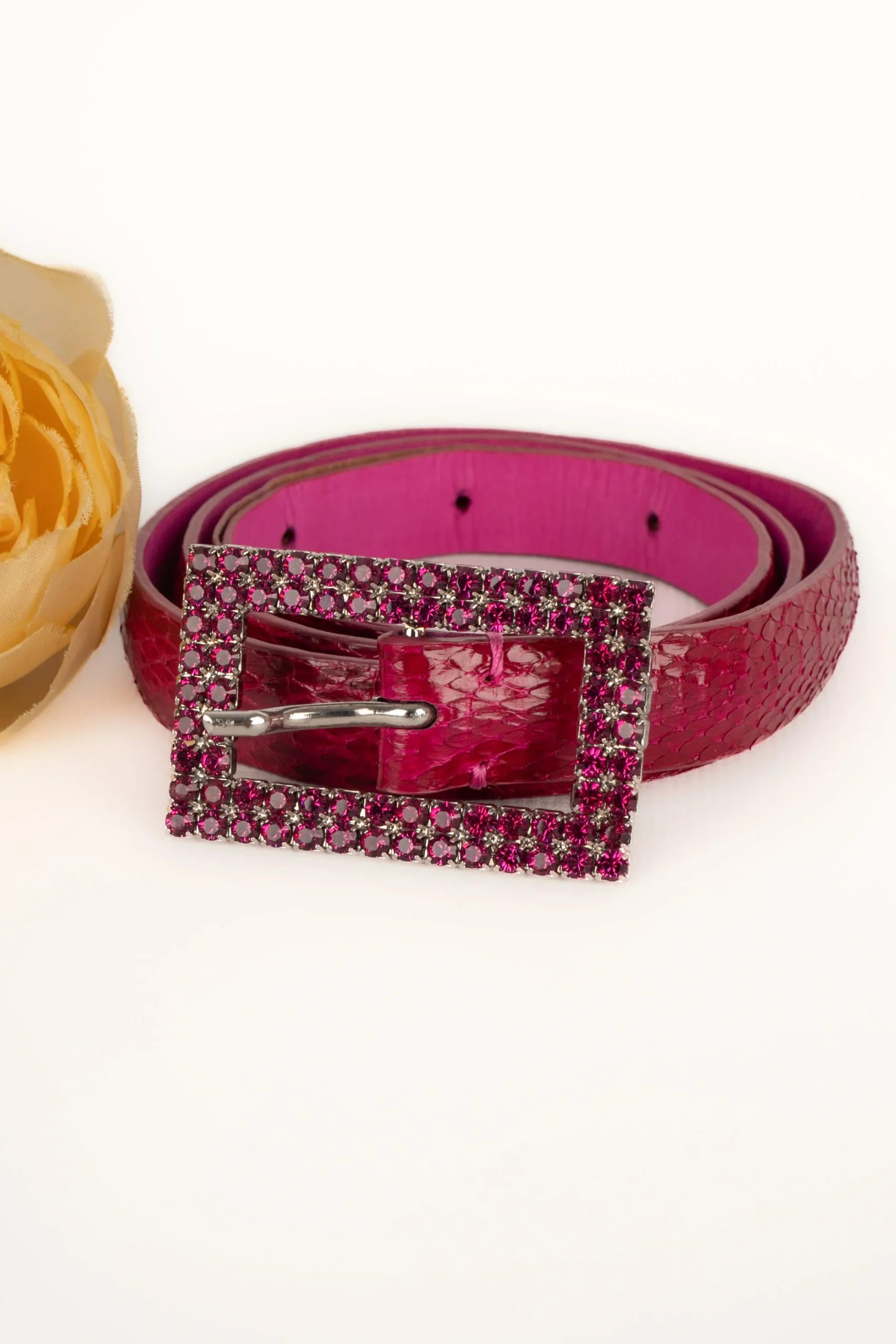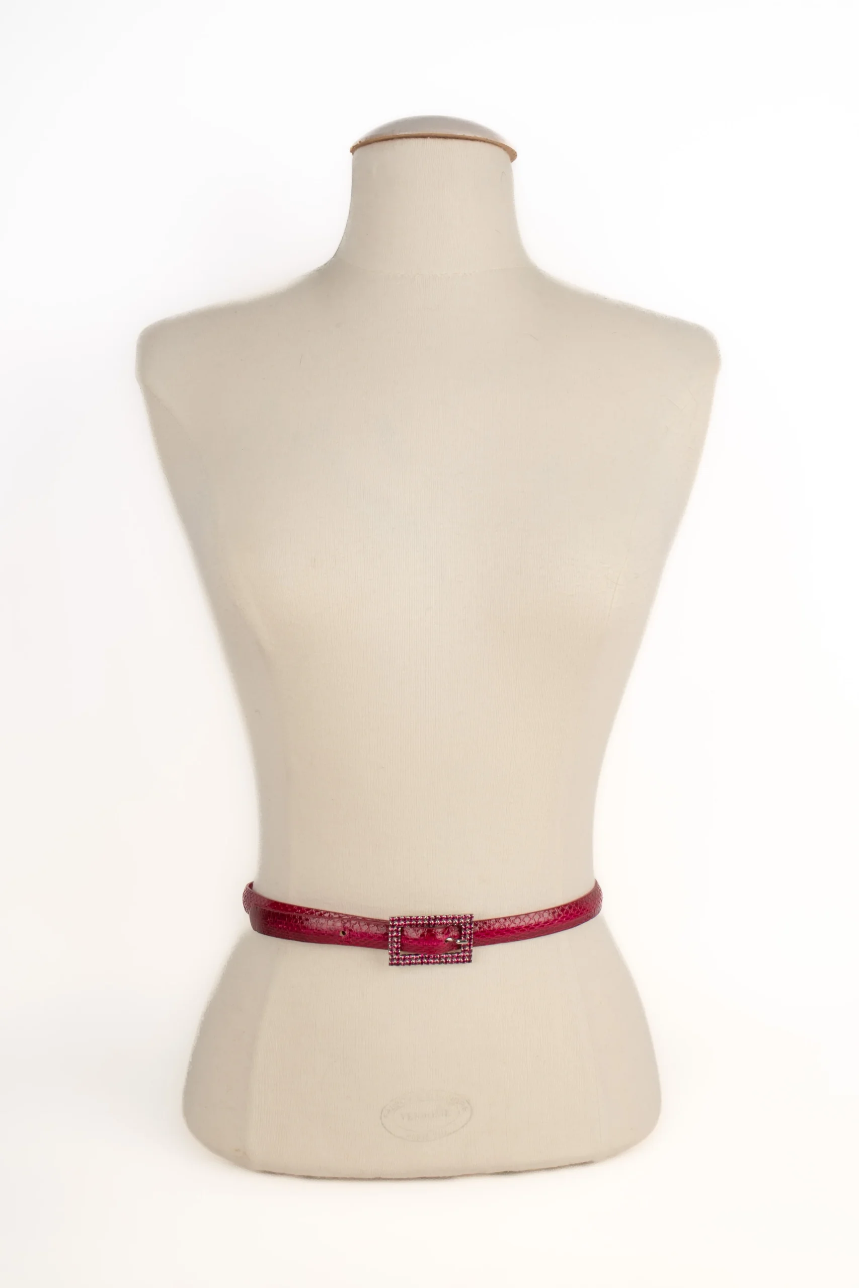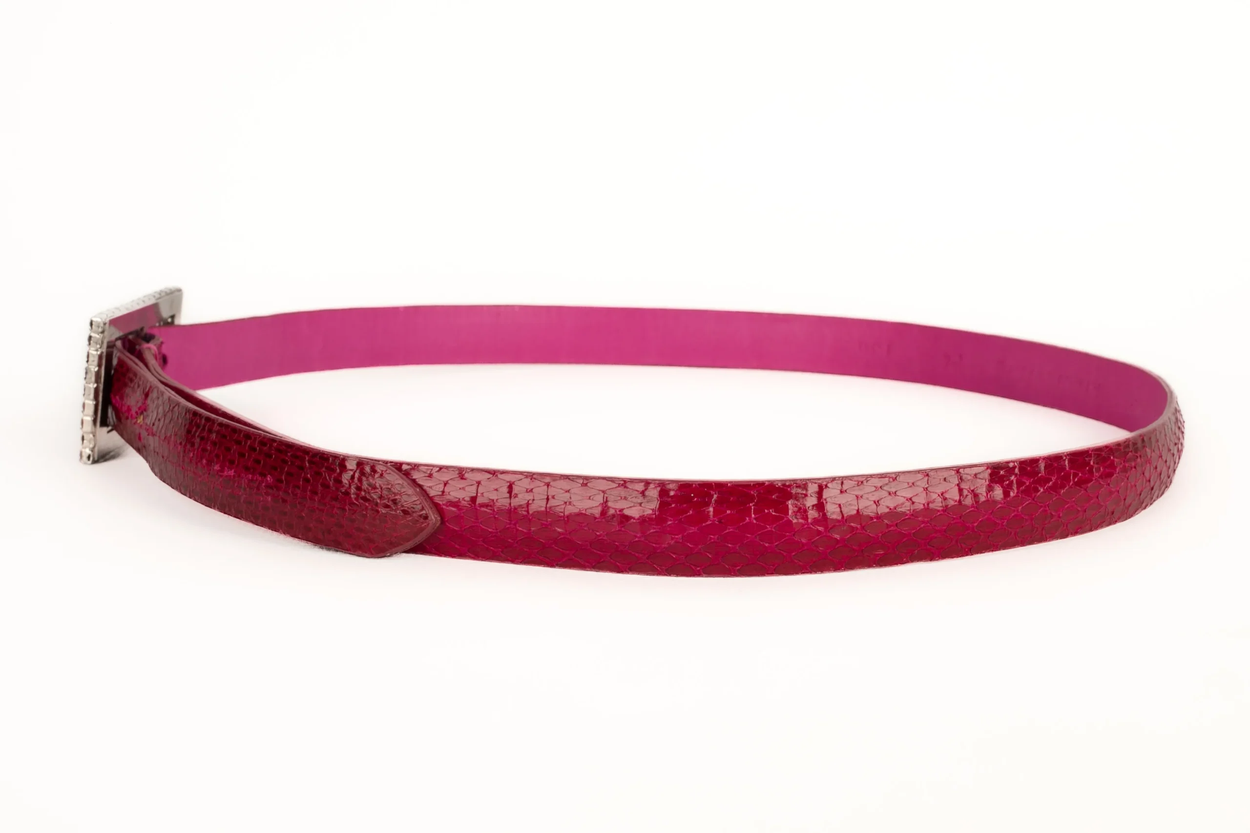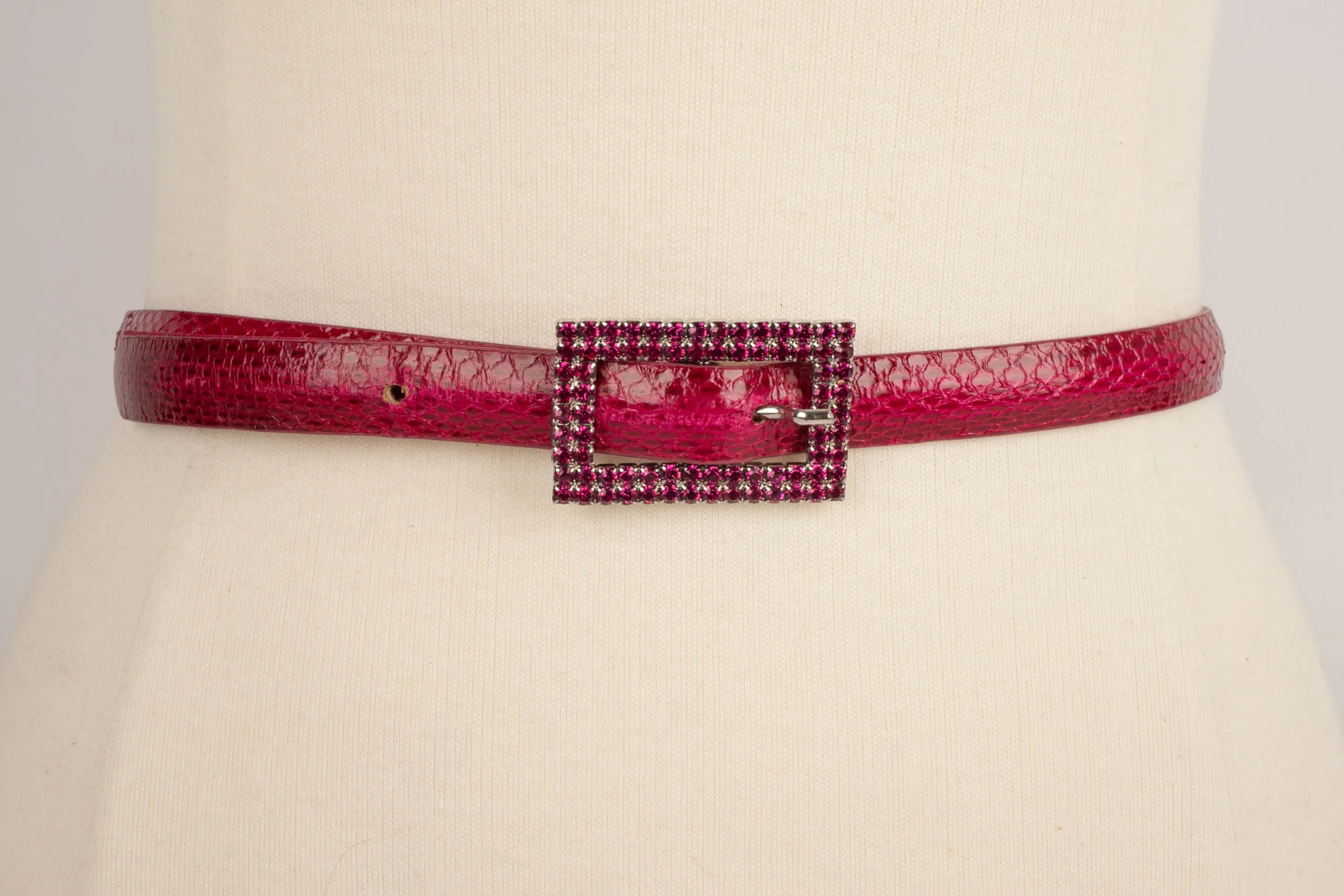 DIOR -(Made in Italy) Fine ceinture en serpent rose et boucle en métal argenté pavée de strass. Marquée taille 36FR.