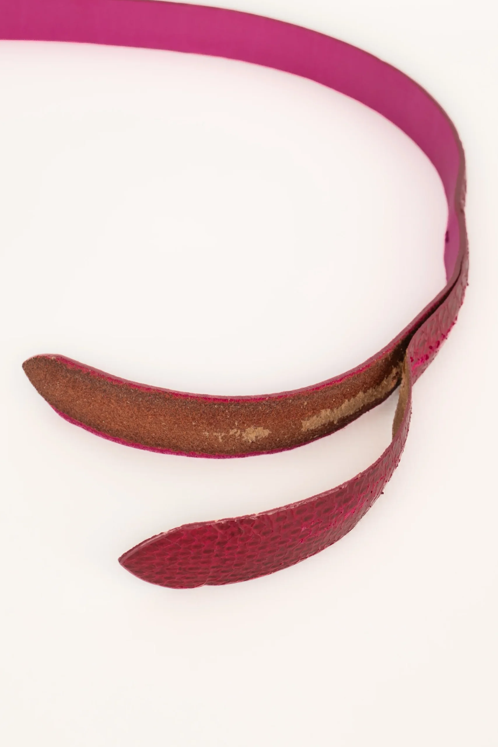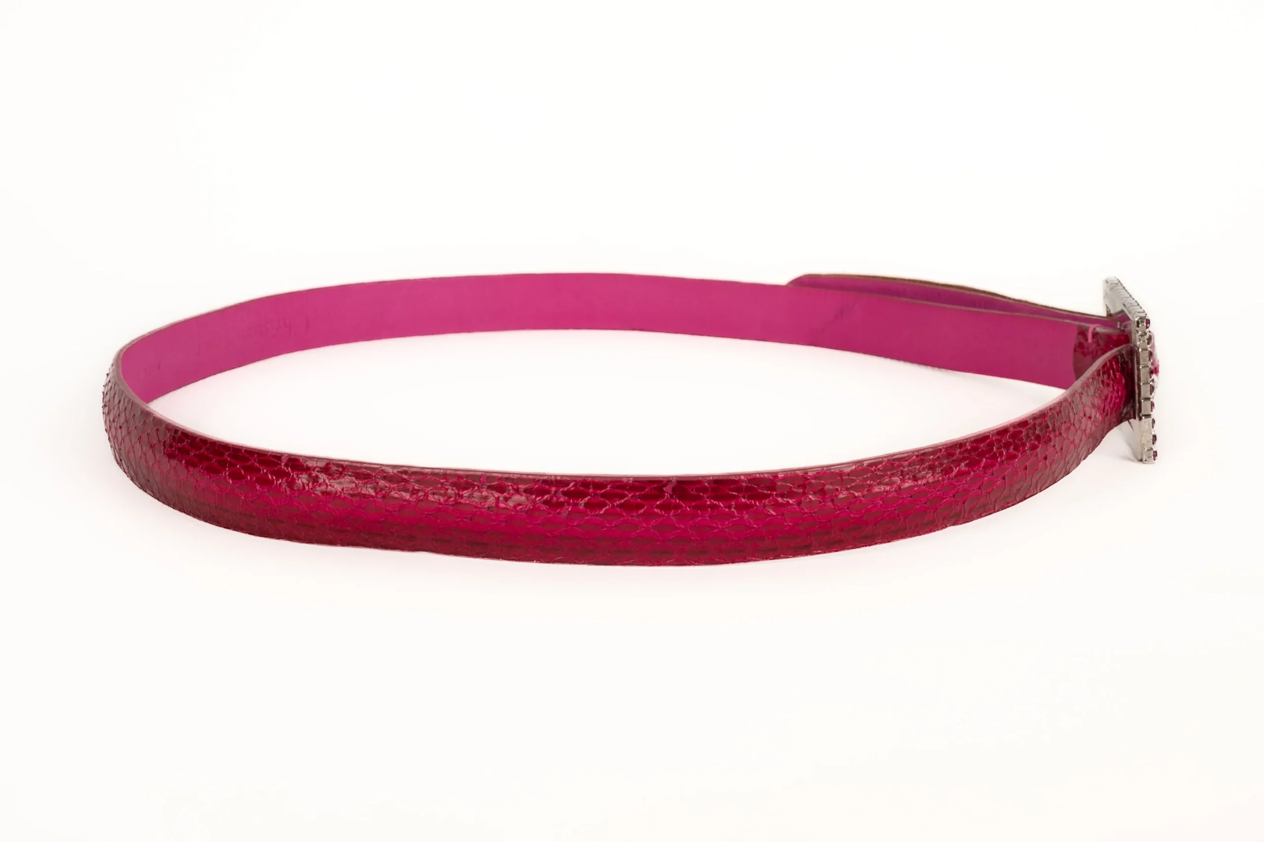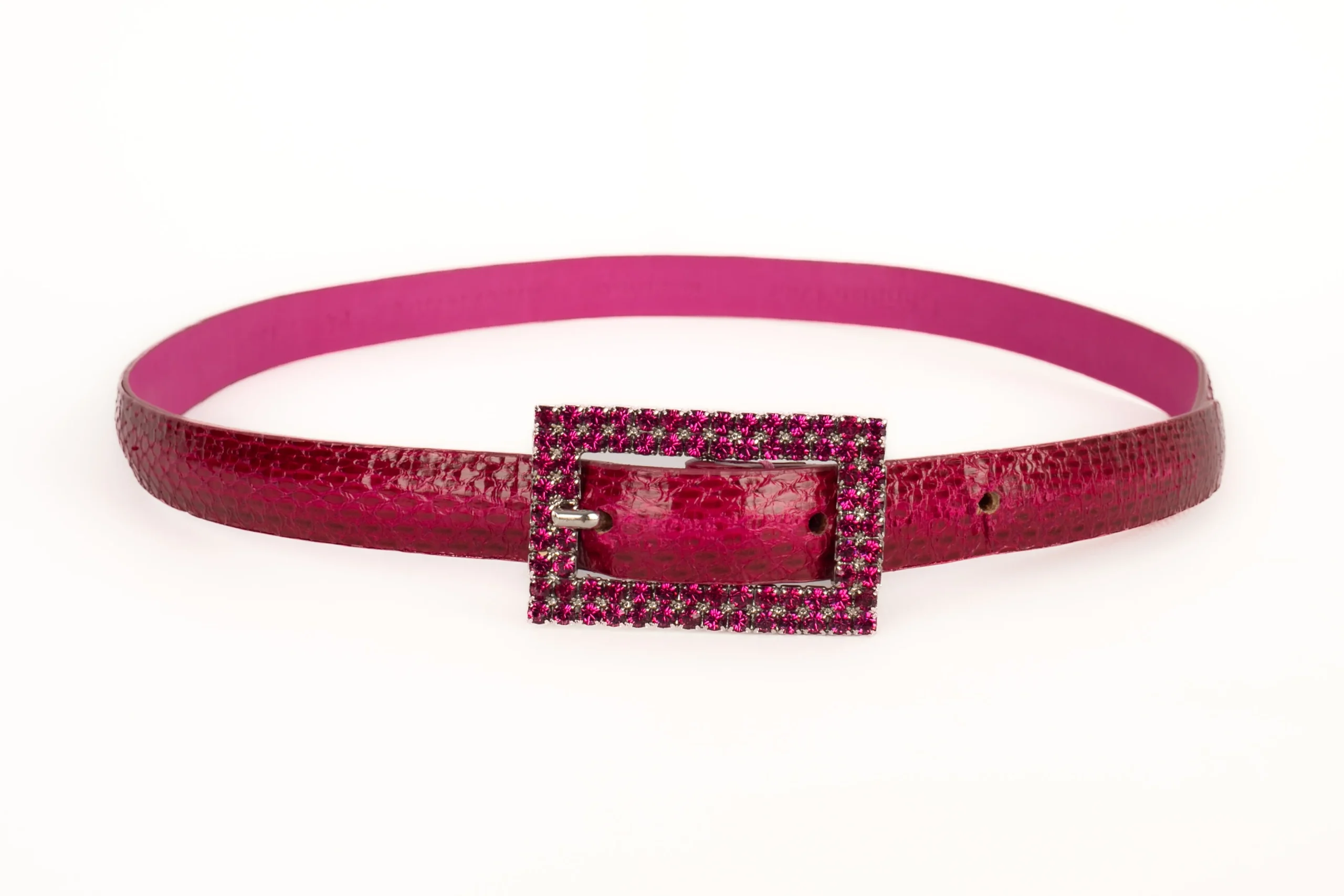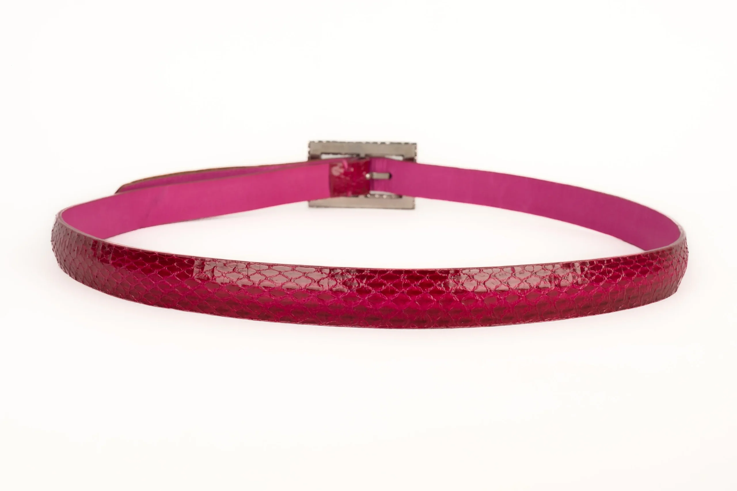 DIOR -(Made in Italy) Fine ceinture en serpent rose et boucle en métal argenté pavée de strass. Marquée taille 36FR.