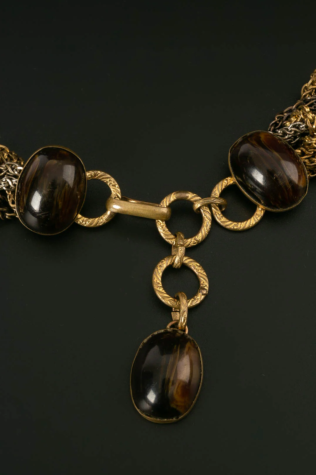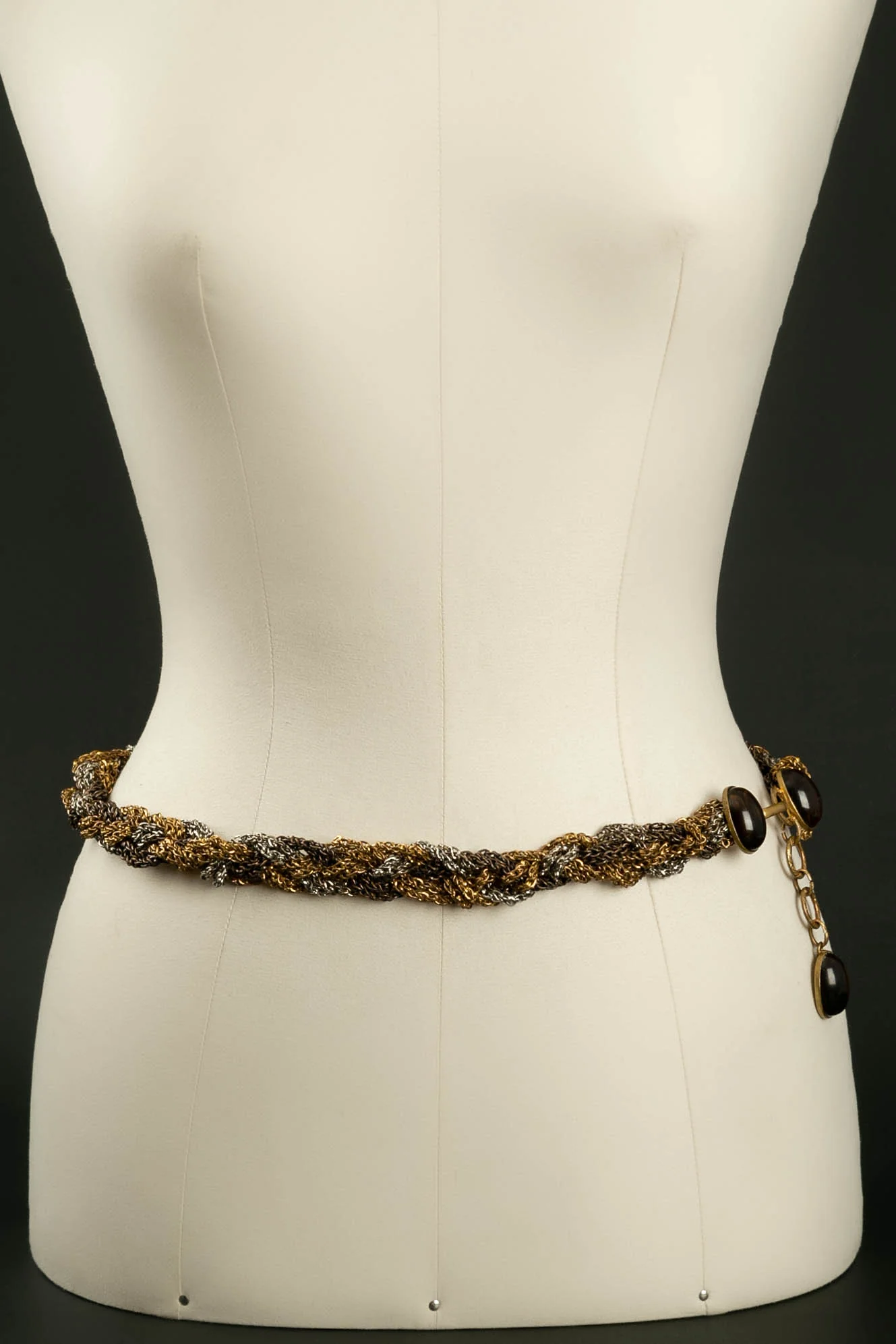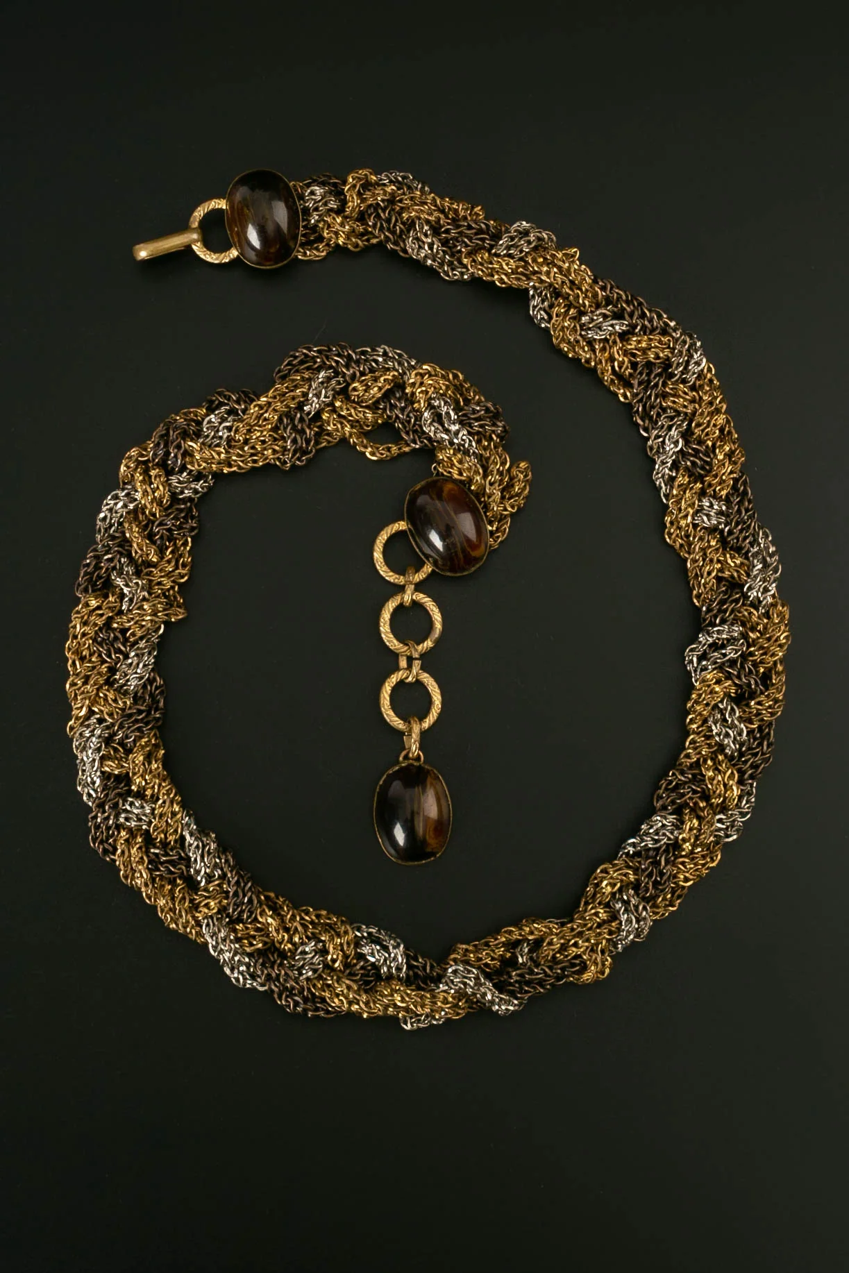 YVES SAINT LAURENT -(Made in France) Ceinture composée de chaînes entrelacées de couleur doré, argenté et marron, ornée de cabochons en résine marron. Circa 1960-1970’s.
