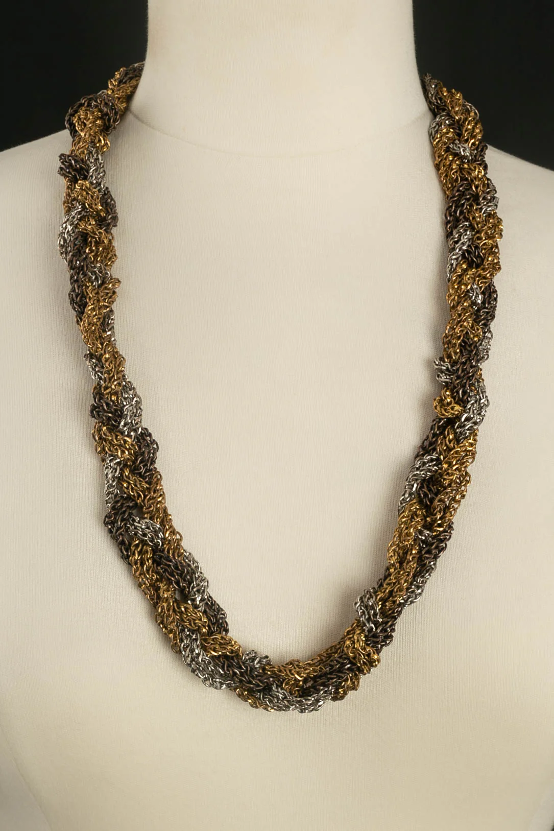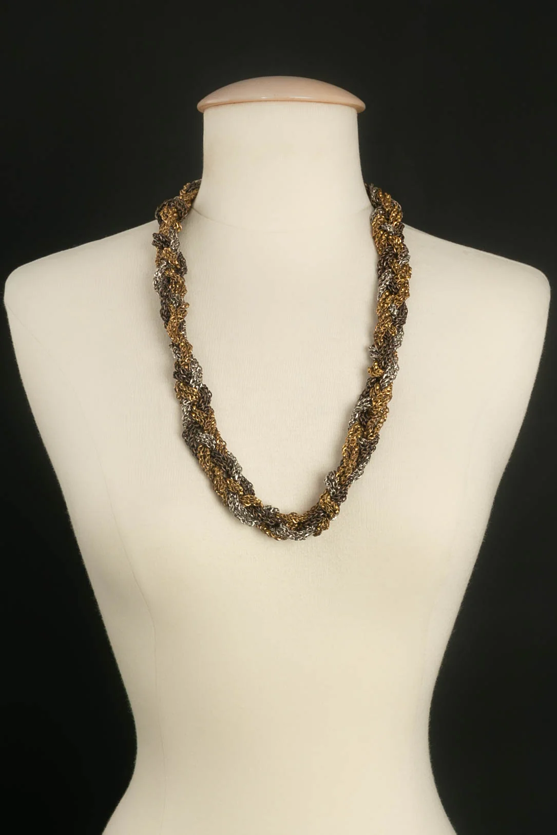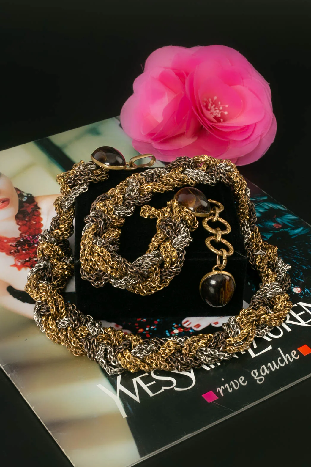 YVES SAINT LAURENT -(Made in France) Ceinture composée de chaînes entrelacées de couleur doré, argenté et marron, ornée de cabochons en résine marron. Circa 1960-1970’s.