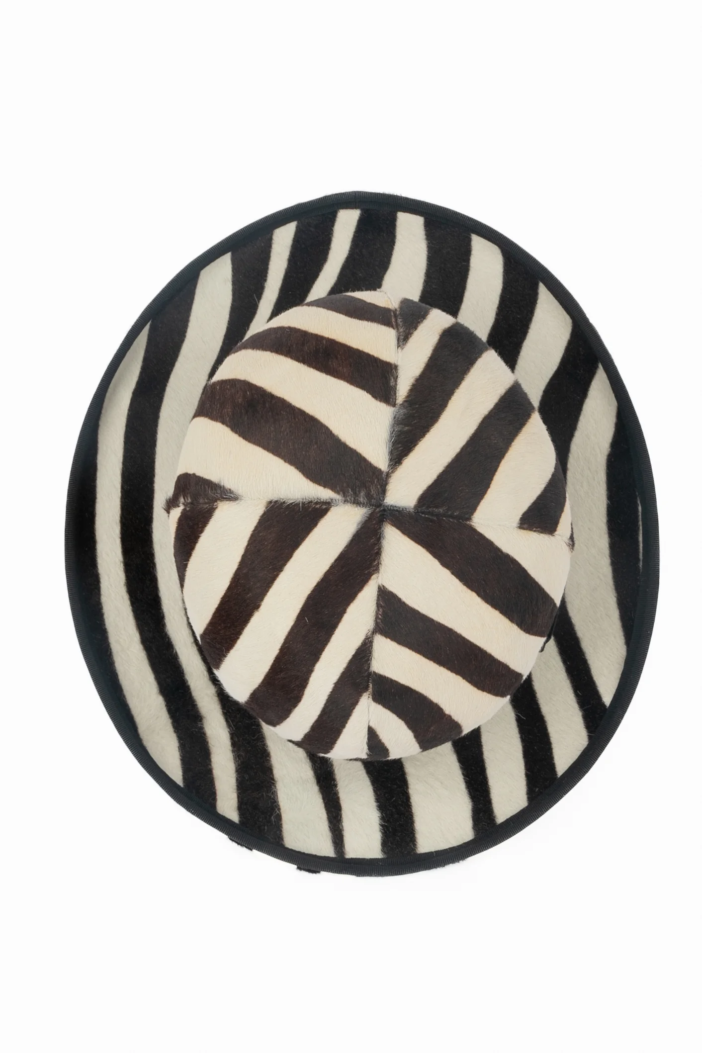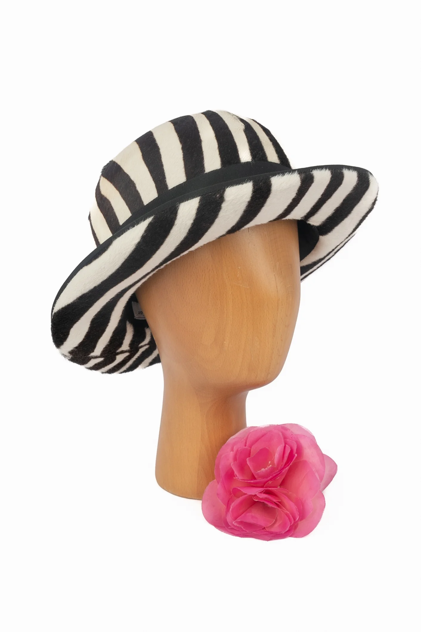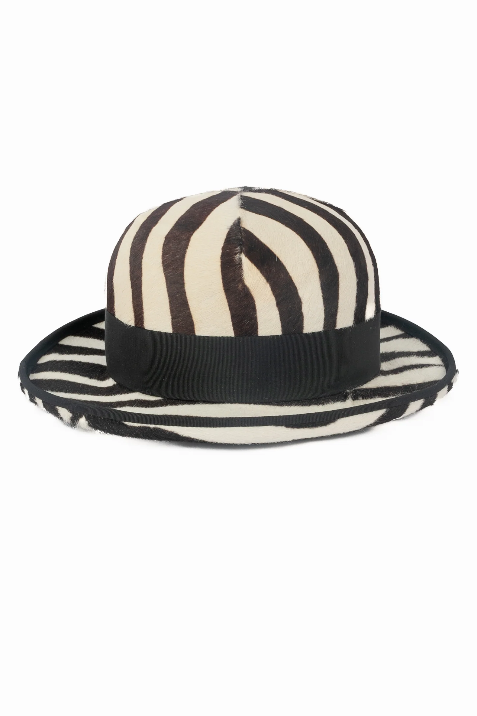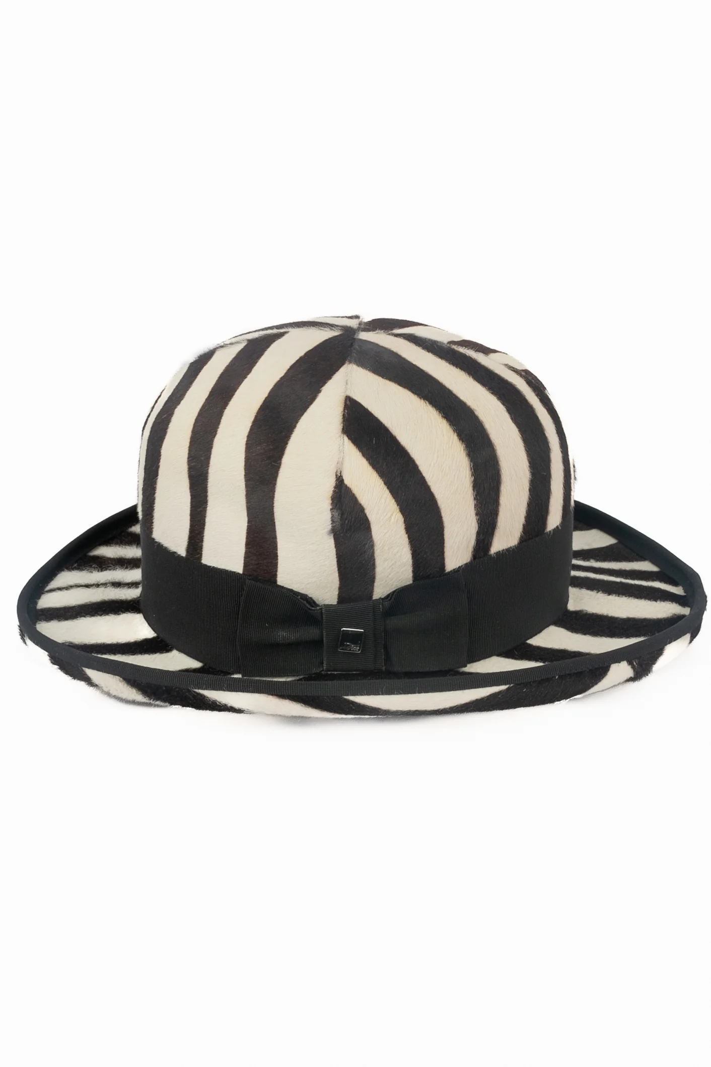 DIOR -(Made in France) Chapeau en veau façon poulain à motif zèbre, ruban côtelé noir et noeud. Taille indiquée 58. Collection Printemps-Eté 2008 sous la direction artistique de John Galliano.
