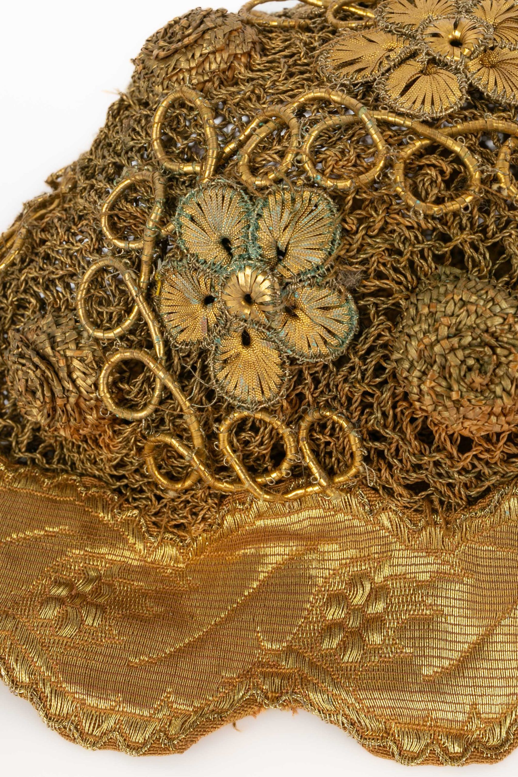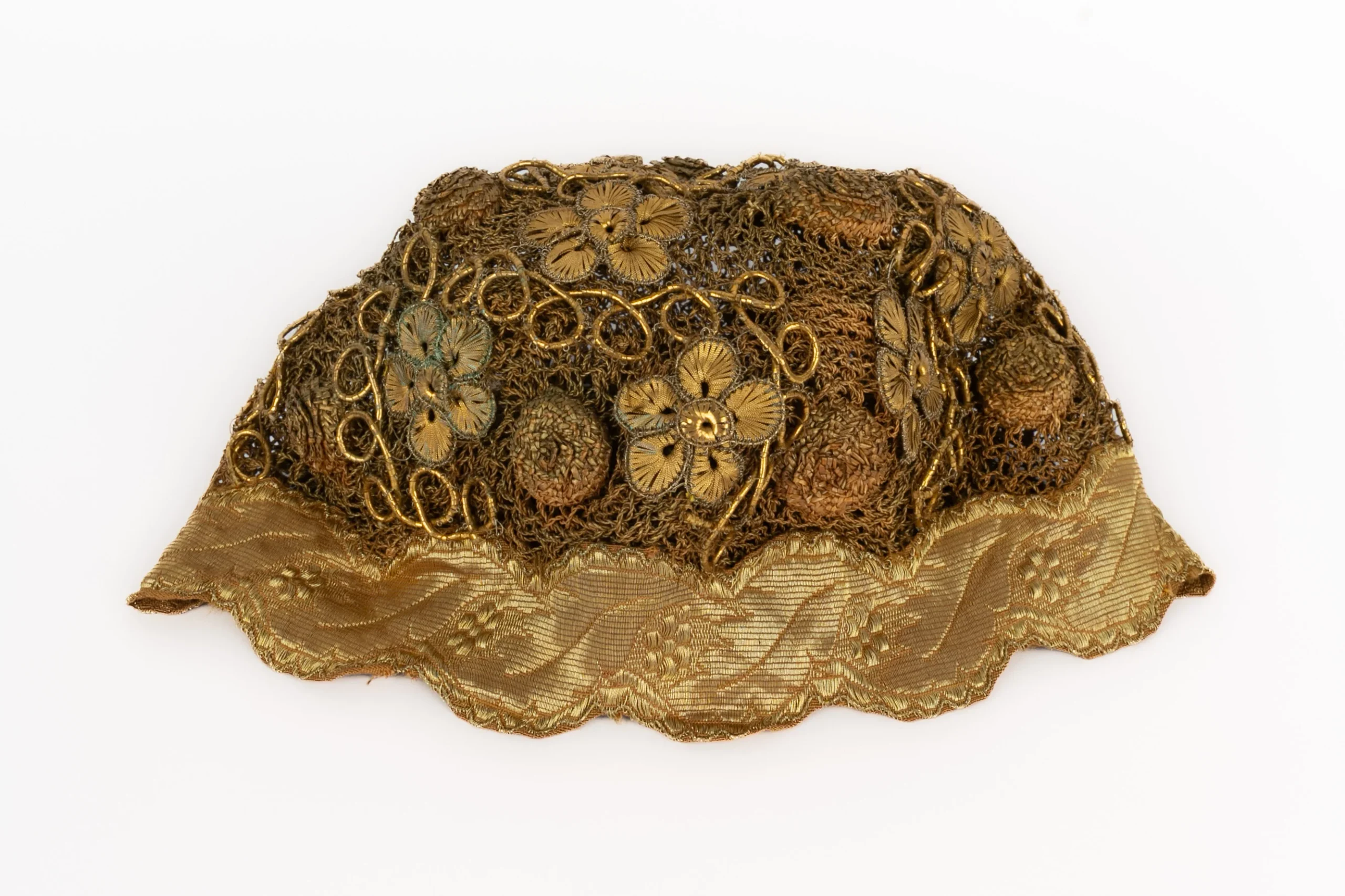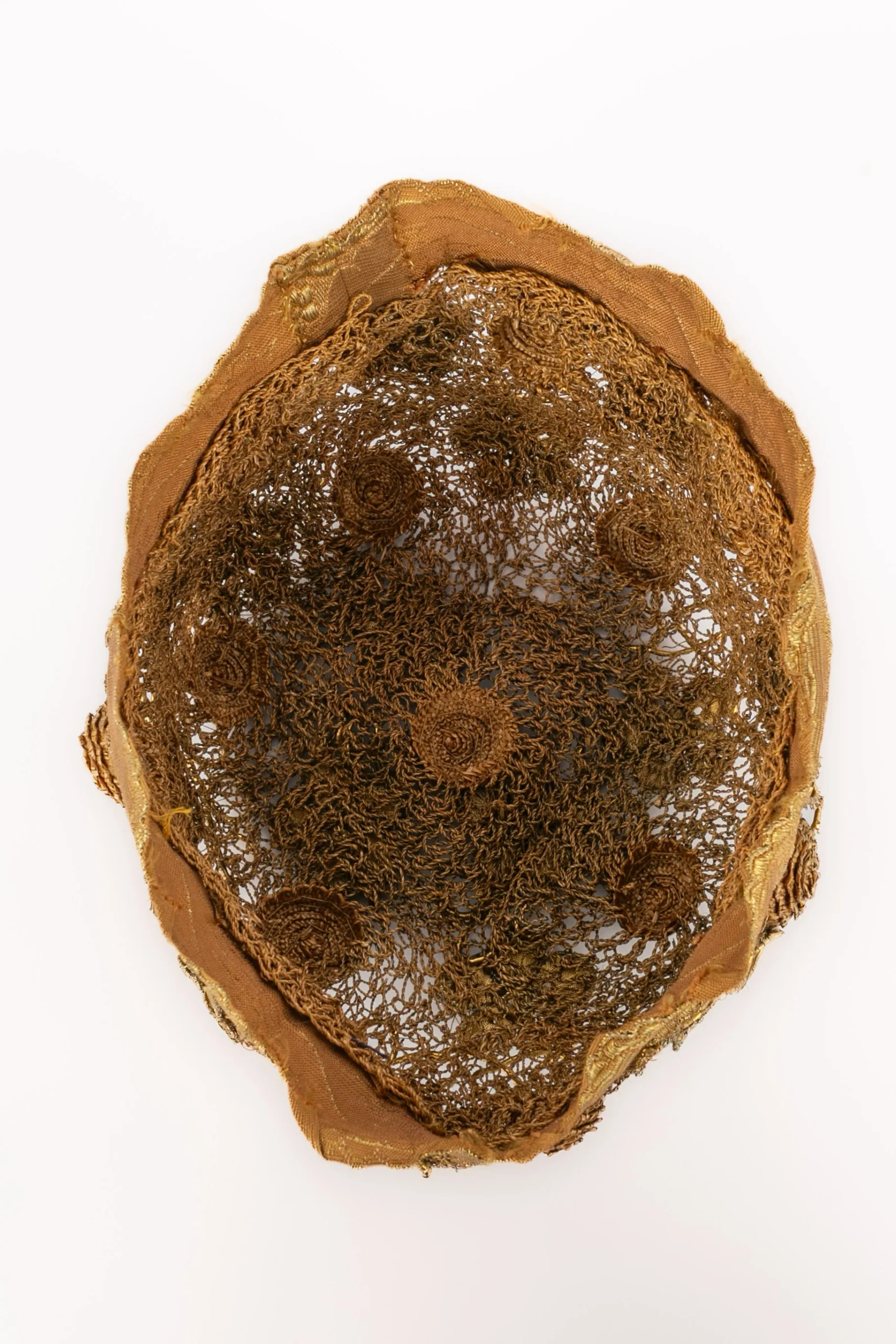 ANONYME – (Made in France) DĂ©licat chapeau en tissu, fils dorĂ© et fils mĂ©tallique datant des annĂ©es 1920.
