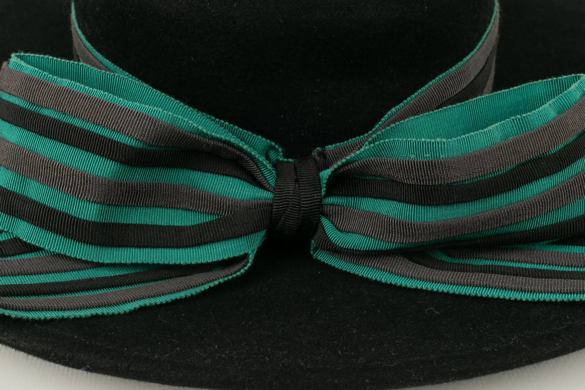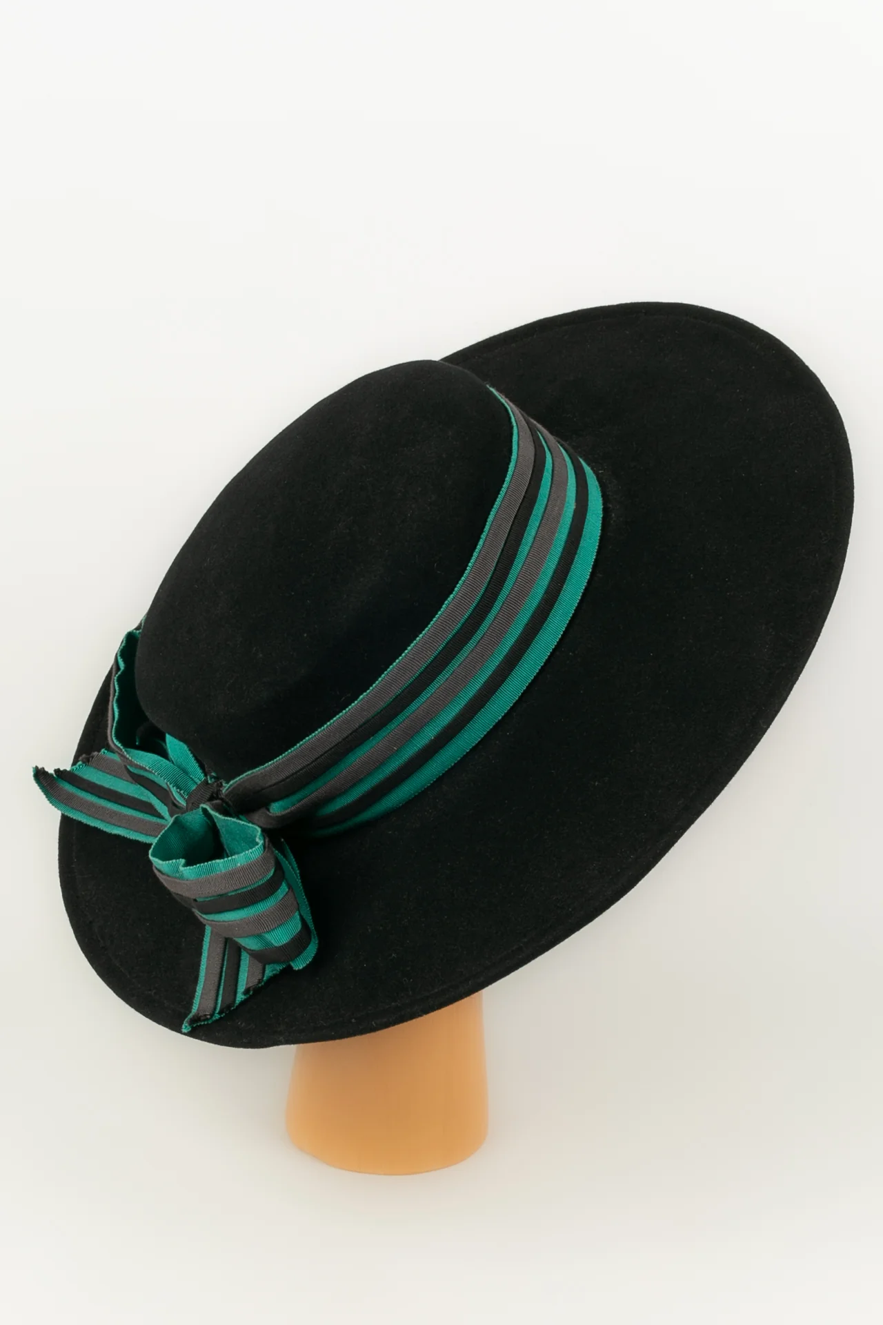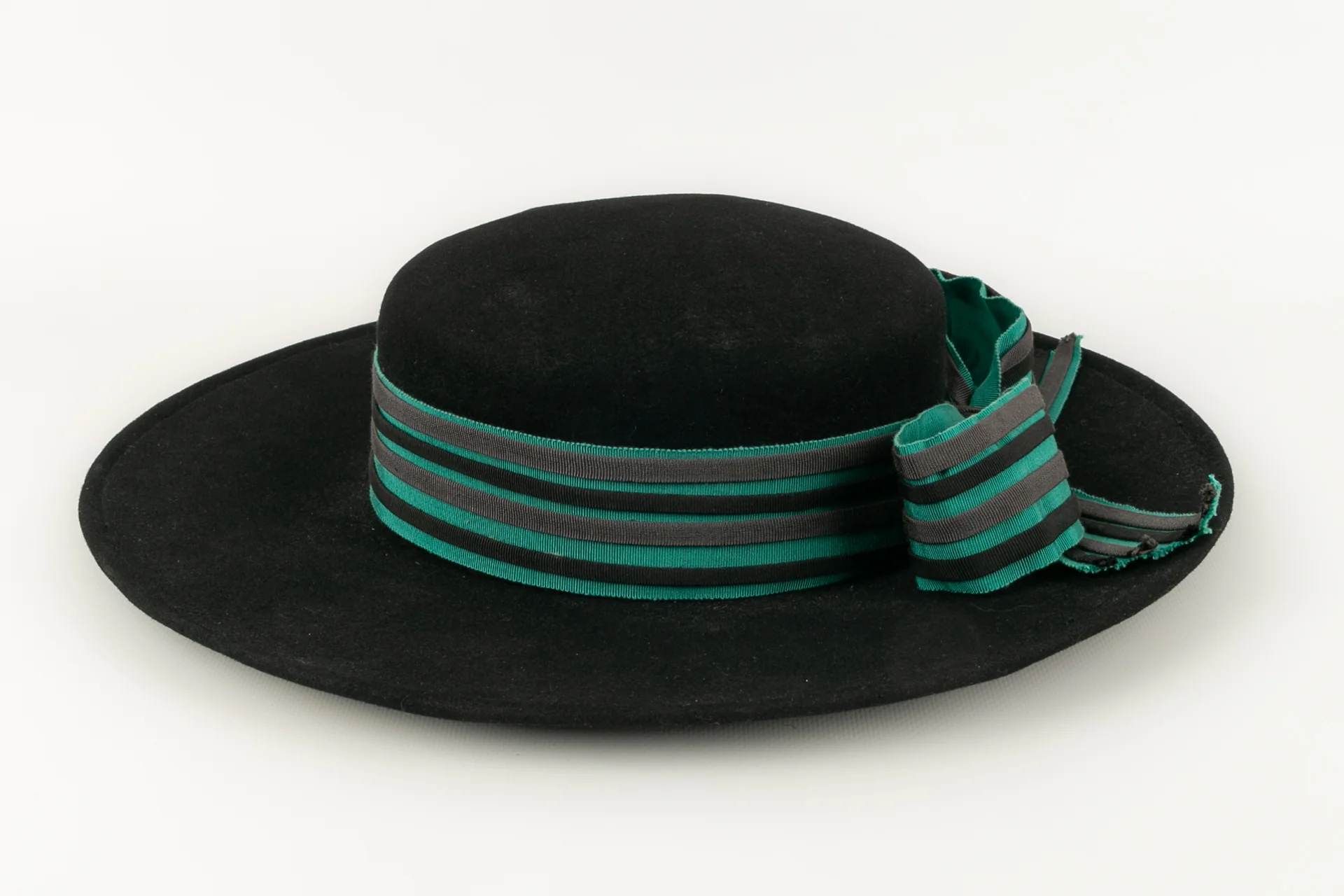 ANONYME -Chapeau en feutre noir et ruban vert à rayures.