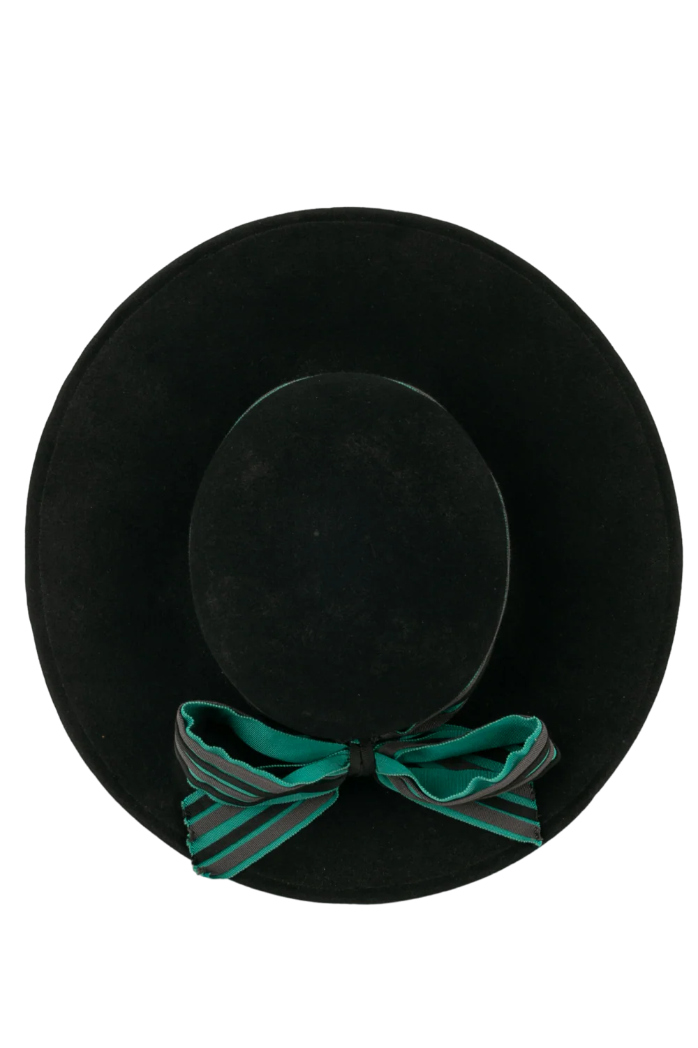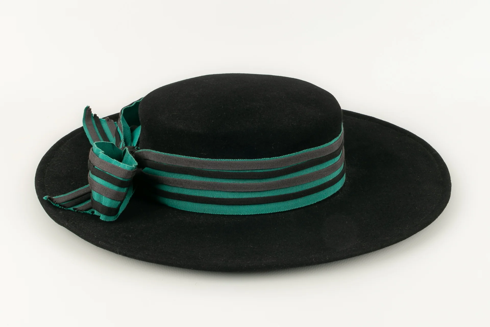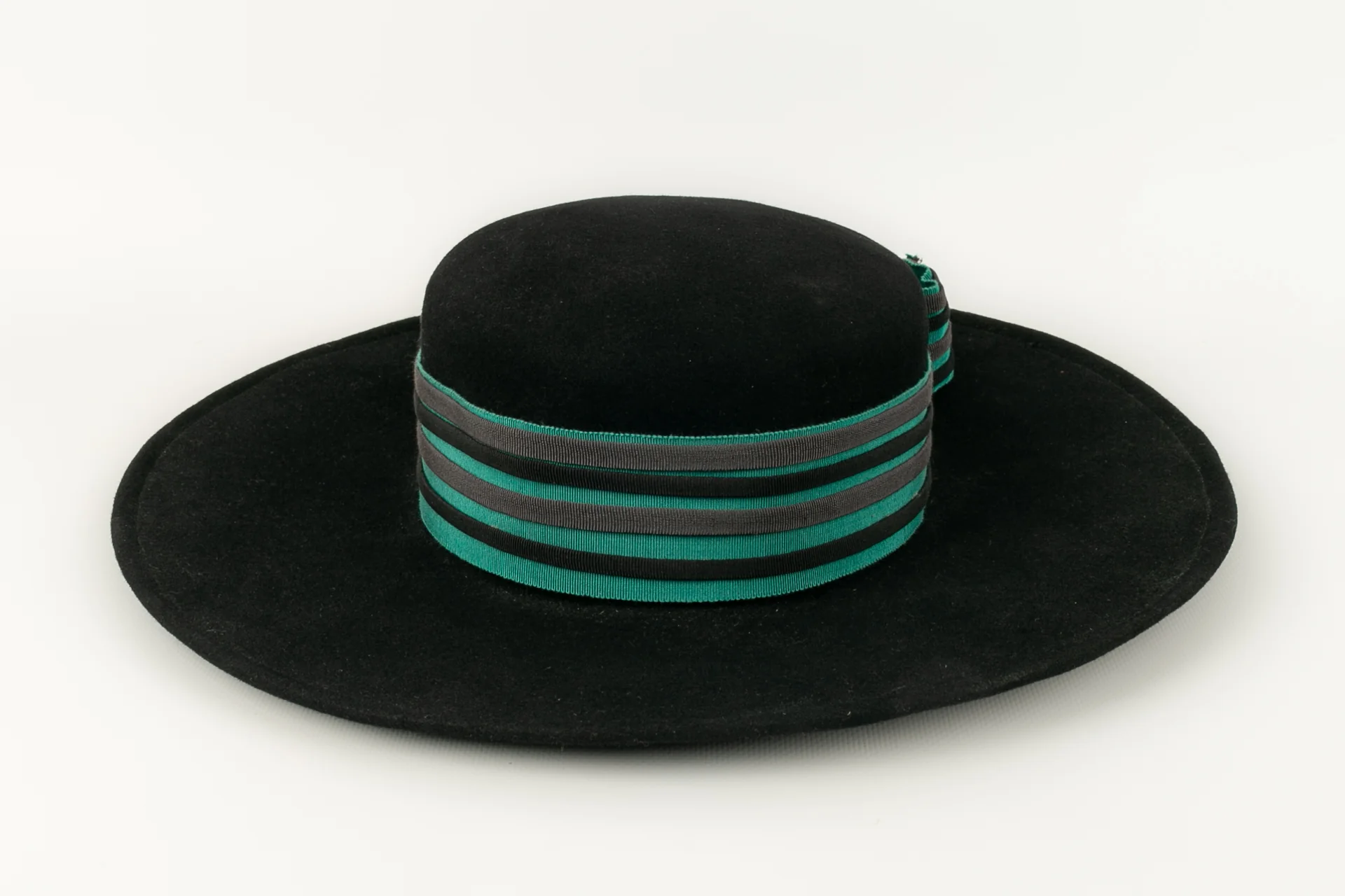 ANONYME -Chapeau en feutre noir et ruban vert à rayures.